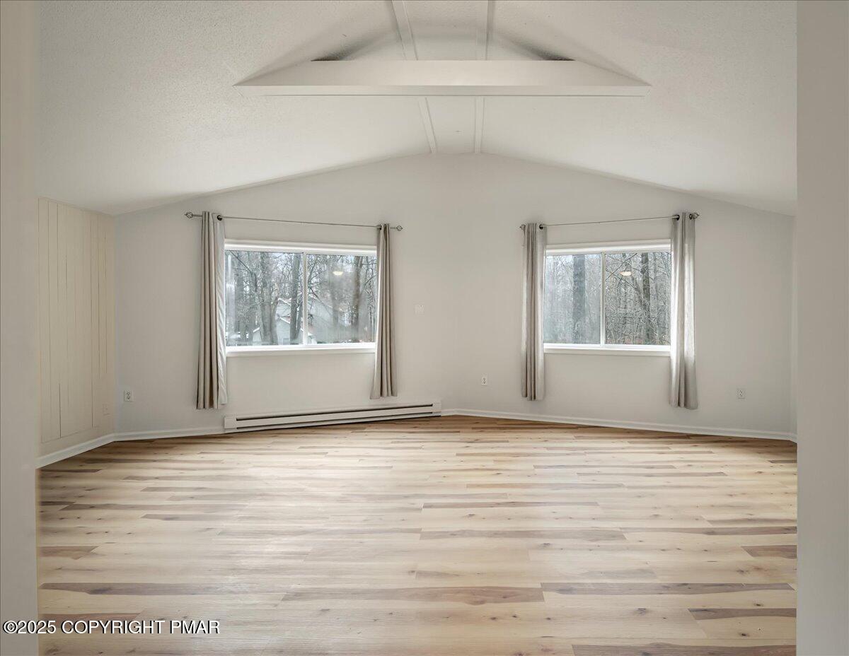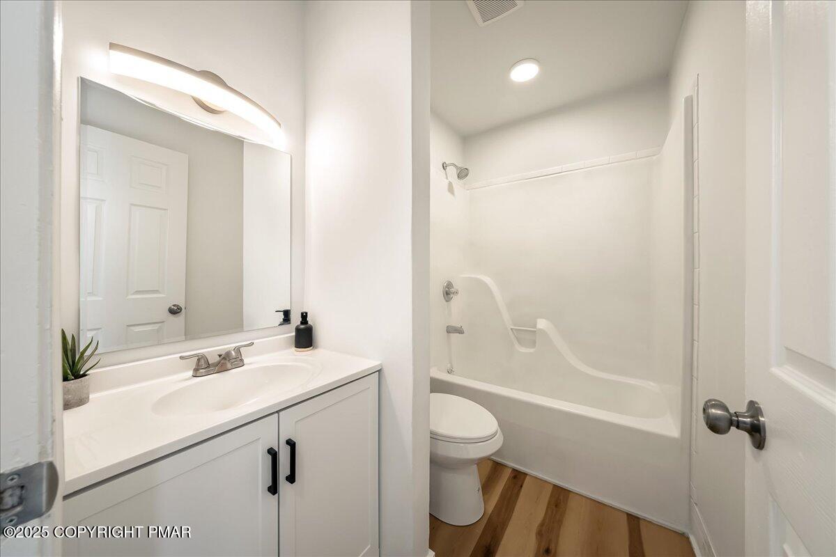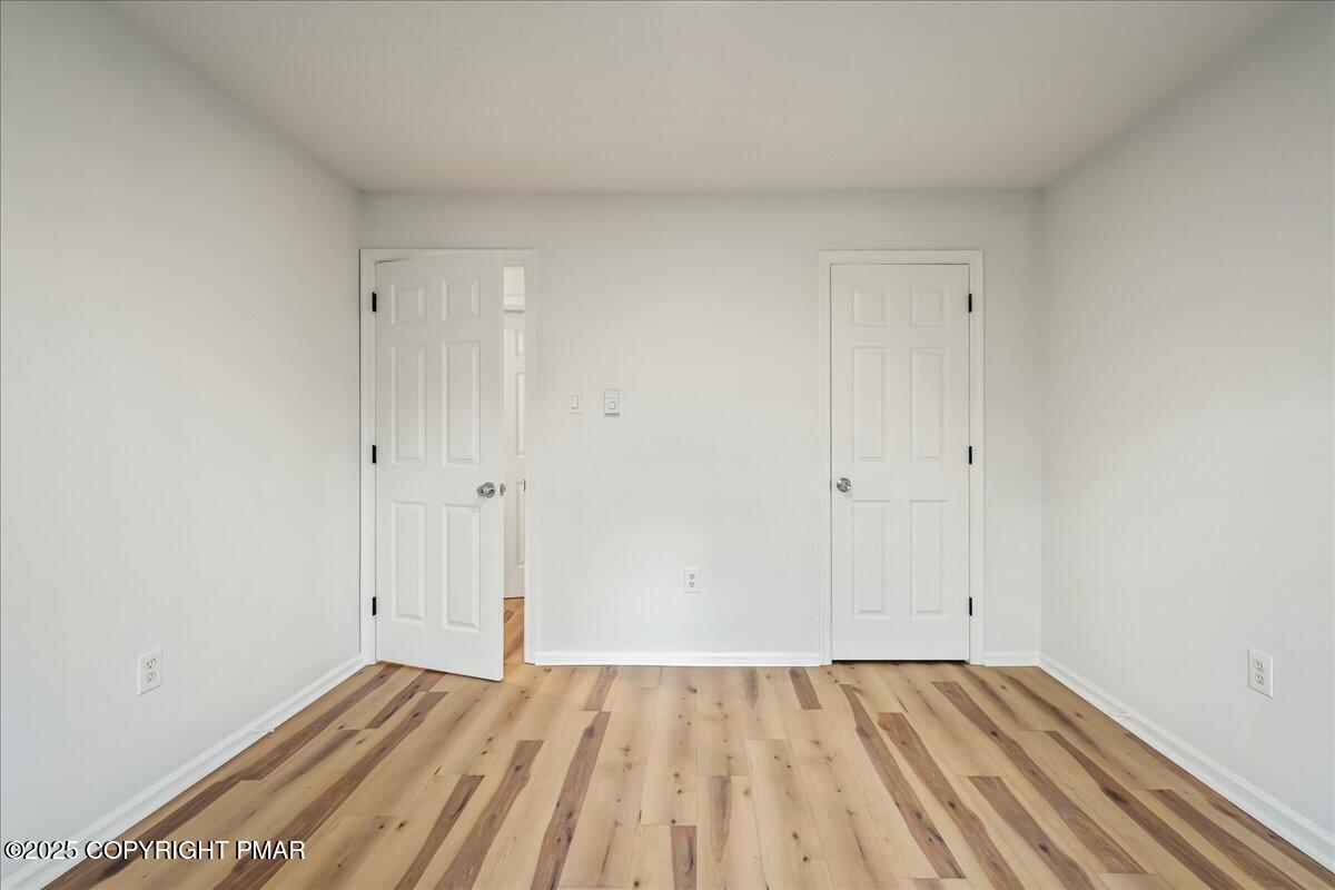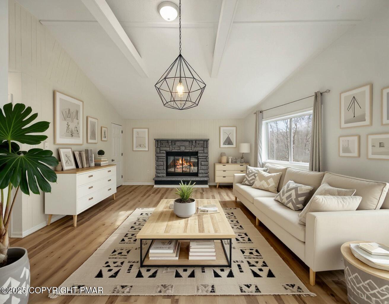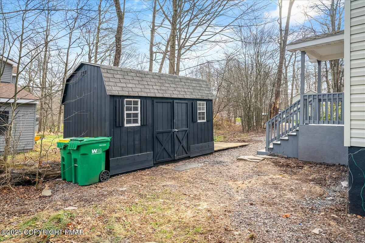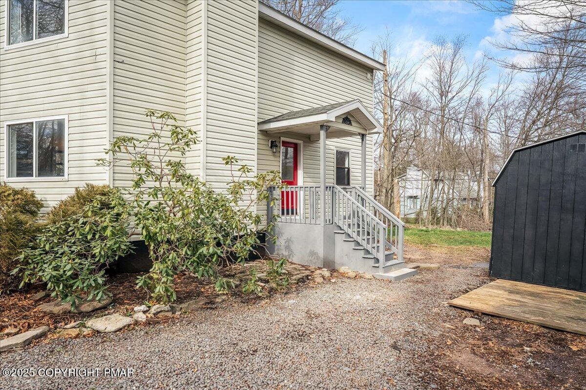 Do not miss this move-in ready and STR-friendly contemporary in Pocono Farms East! This fully updated 4-bed, 2-bath home delivers the modern mountain vibes everyone's looking for with new pine flooring and sun-filled rooms throughout. The open-concept main level features a bright living area, a stone-accent wall, and a stylish kitchen with stainless steel appliances and charcoal cabinetry. Two bedrooms and a full bath sit conveniently on the first floor--perfect for guests or a main-level sleeping option. Upstairs, the oversized family room steals the show with vaulted ceilings, exposed beams, and a cozy stone fireplace creating an incredible second hangout space for movie nights or large groups. Two more bedrooms and another refreshed full bath complete the upper level. Outside, the home sits back from the road on a flat, usable lot with plenty of parking and a newly painted black shed to store all your toys. LOW taxes and HOA dues make this an ideal investment, vacation home, or stylish full time residence. Located just 10 minutes from Kalahari Resort and 15 minutes to Camelback Mountain, you're perfectly positioned near top attractions, skiing, waterparks, dining, and shopping. Whether you're looking for a primary home, a mountain escape on the weekends, or a cash-flowing rental, this one checks every box. Priced at under $240k, this one won't last - Schedule your tour today!