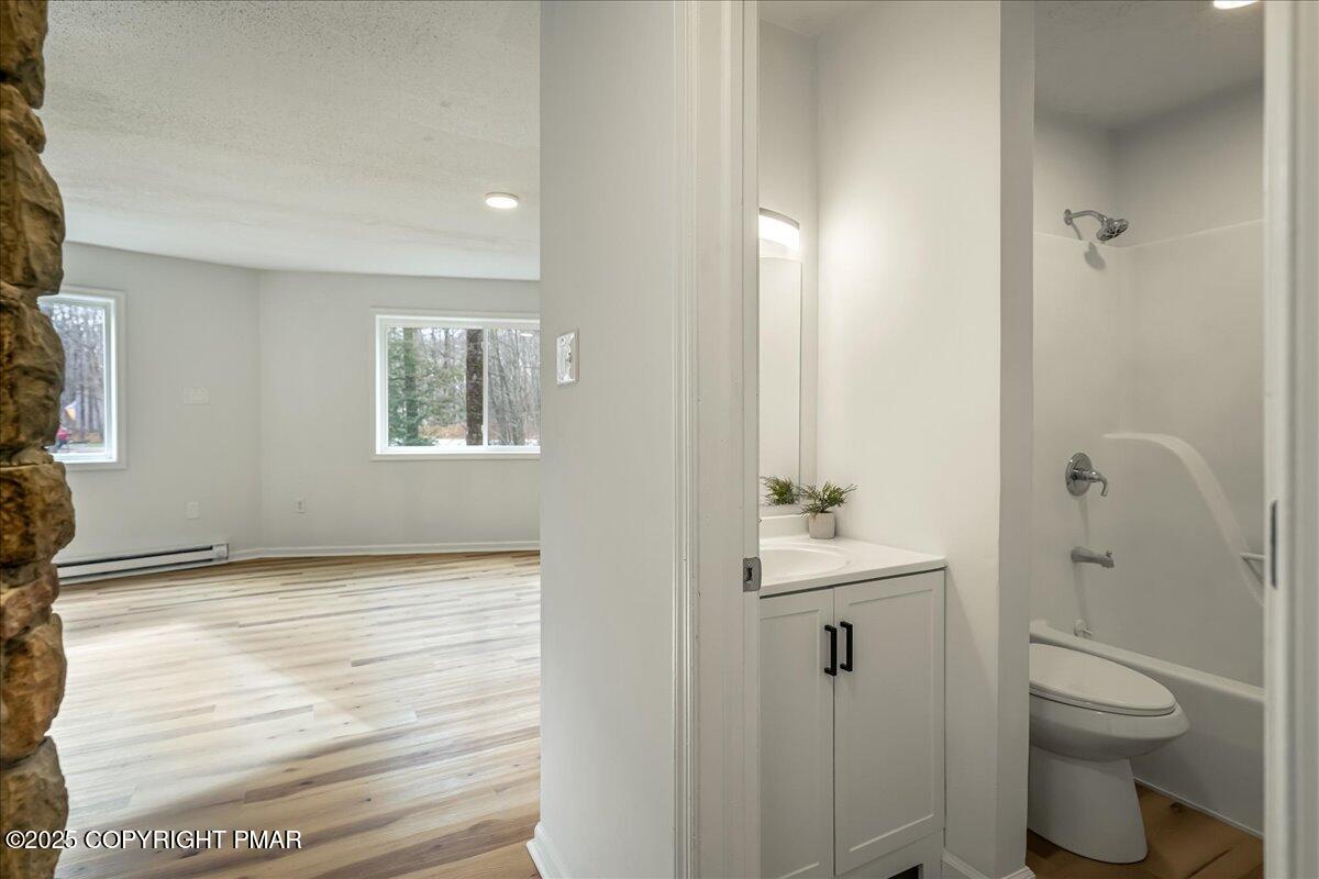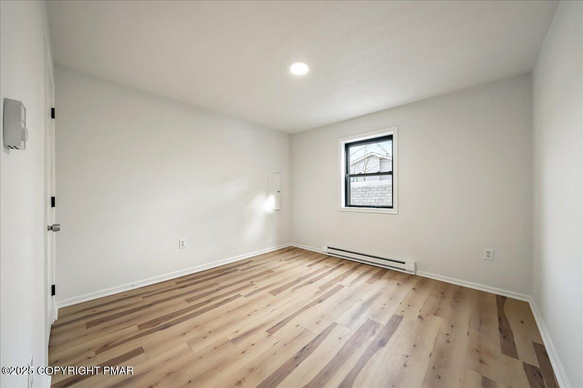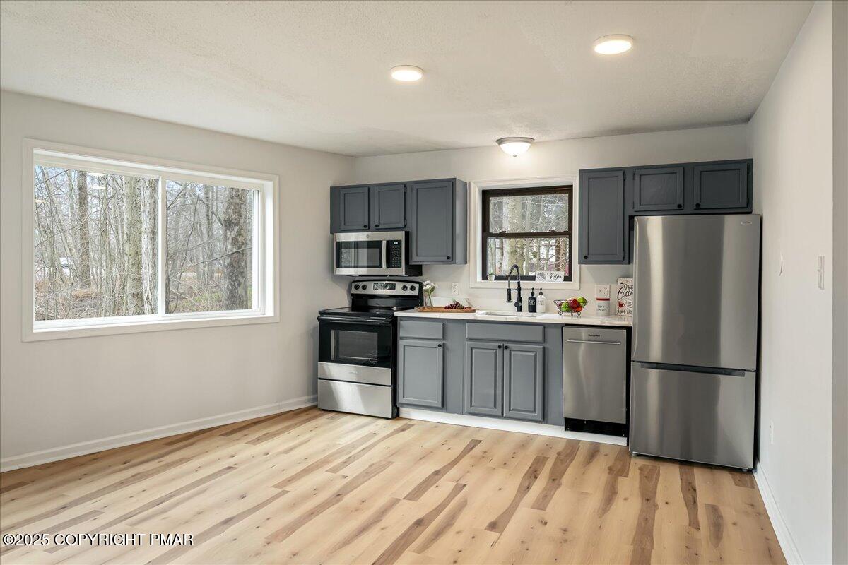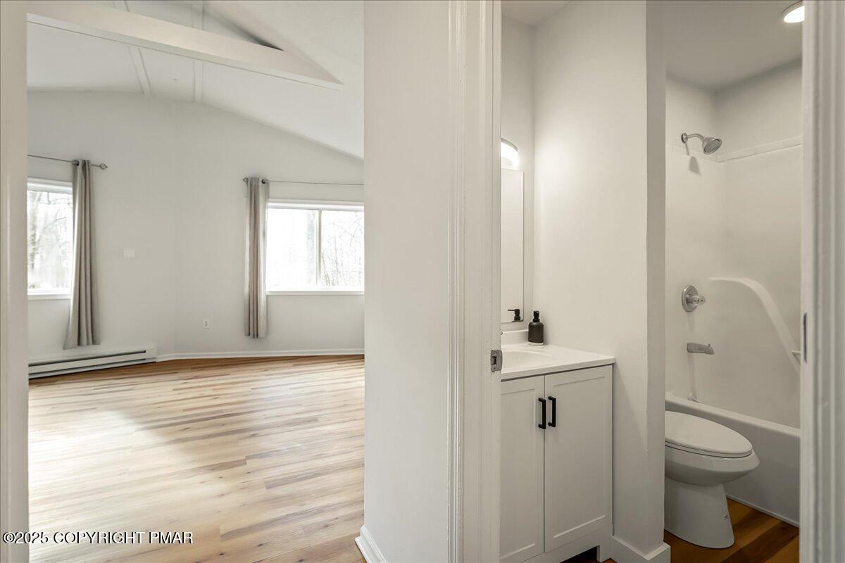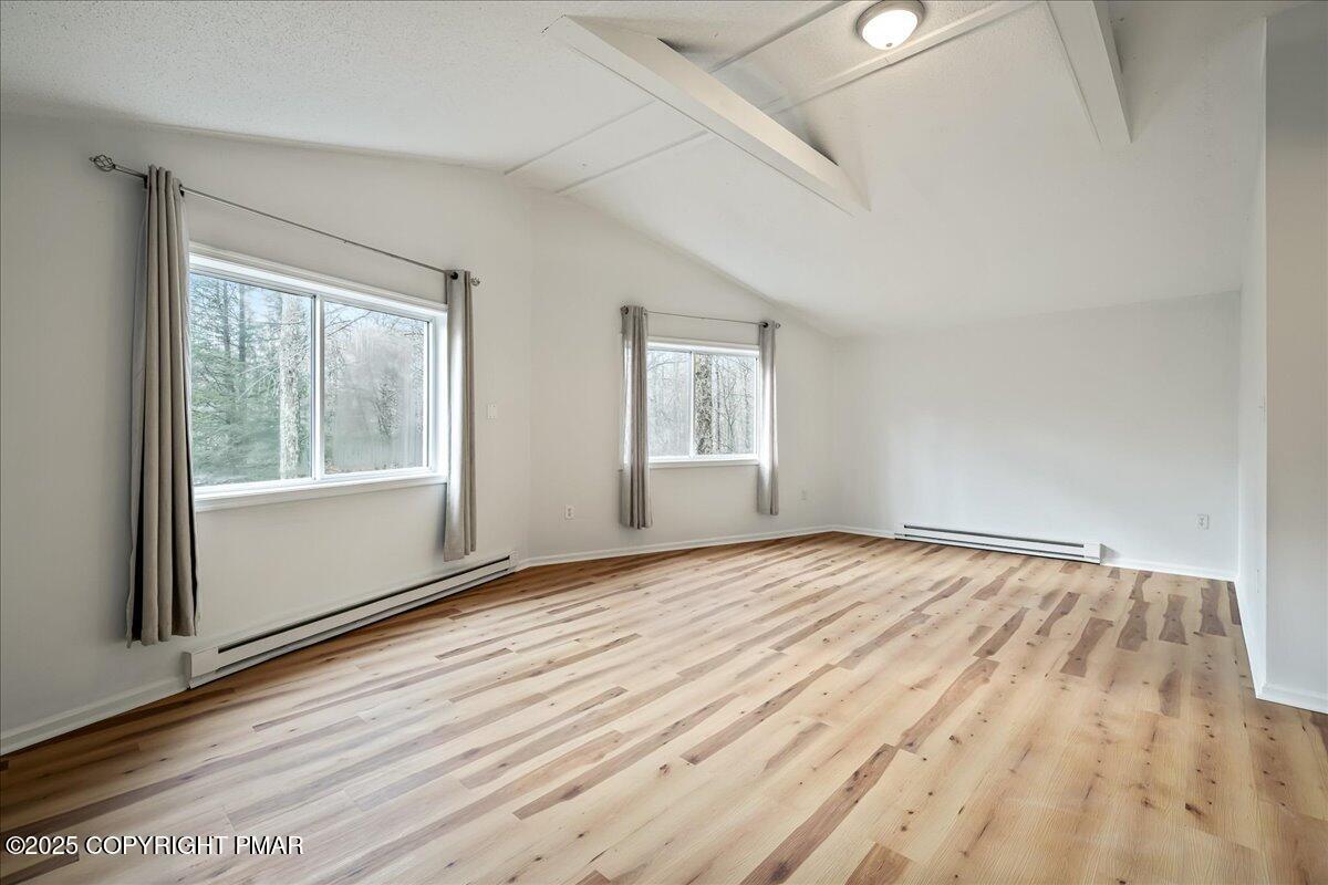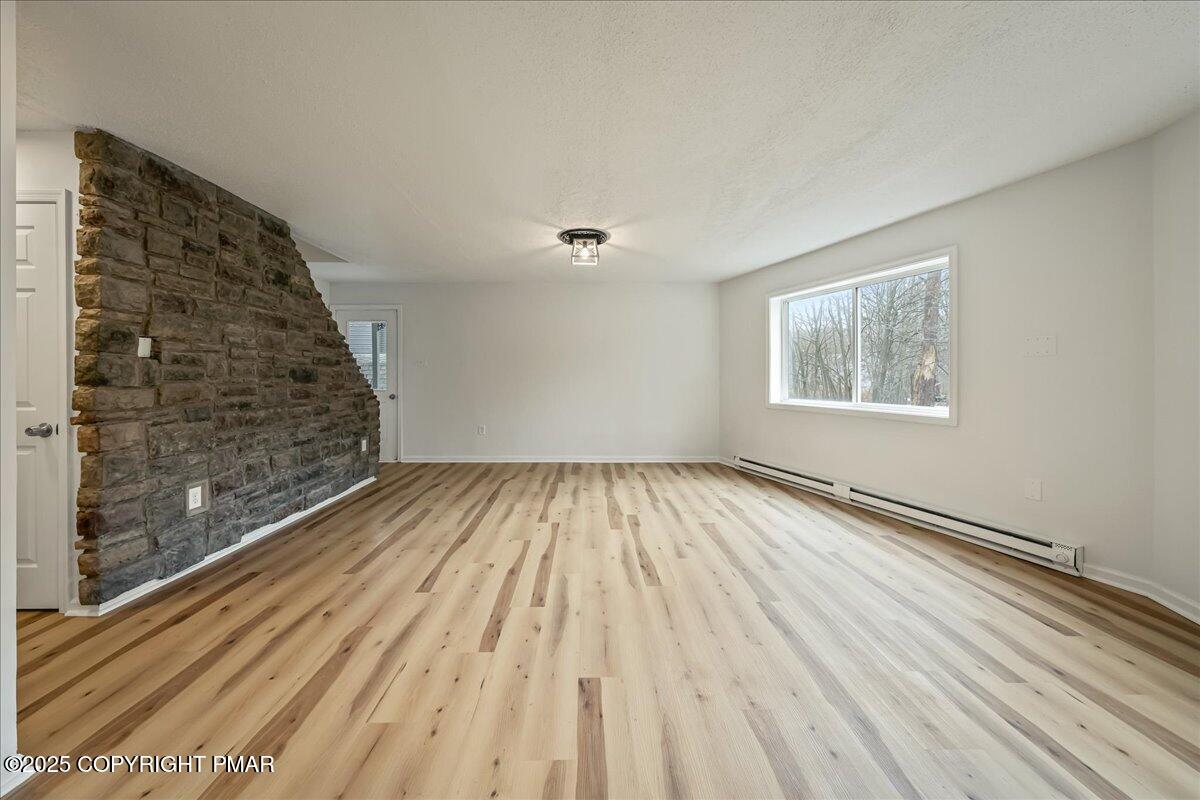 Do not miss this move-in ready and STR-friendly contemporary in Pocono Farms East! This fully updated 4-bed, 2-bath home delivers the modern mountain vibes everyone's looking for with new pine flooring and sun-filled rooms throughout. The open-concept main level features a bright living area, a stone-accent wall, and a stylish kitchen with stainless steel appliances and charcoal cabinetry. Two bedrooms and a full bath sit conveniently on the first floor--perfect for guests or a main-level sleeping option. Upstairs, the oversized family room steals the show with vaulted ceilings, exposed beams, and a cozy stone fireplace creating an incredible second hangout space for movie nights or large groups. Two more bedrooms and another refreshed full bath complete the upper level. Outside, the home sits back from the road on a flat, usable lot with plenty of parking and a newly painted black shed to store all your toys. LOW taxes and HOA dues make this an ideal investment, vacation home, or stylish full time residence. Located just 10 minutes from Kalahari Resort and 15 minutes to Camelback Mountain, you're perfectly positioned near top attractions, skiing, waterparks, dining, and shopping. Whether you're looking for a primary home, a mountain escape on the weekends, or a cash-flowing rental, this one checks every box. Priced at under $240k, this one won't last - Schedule your tour today!