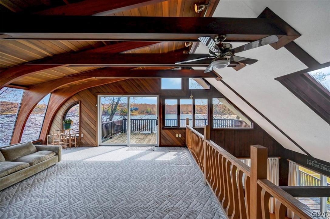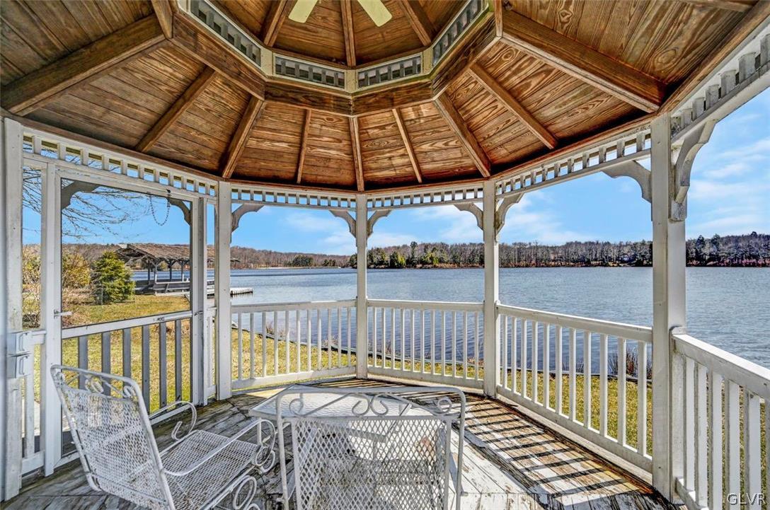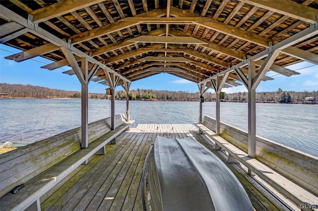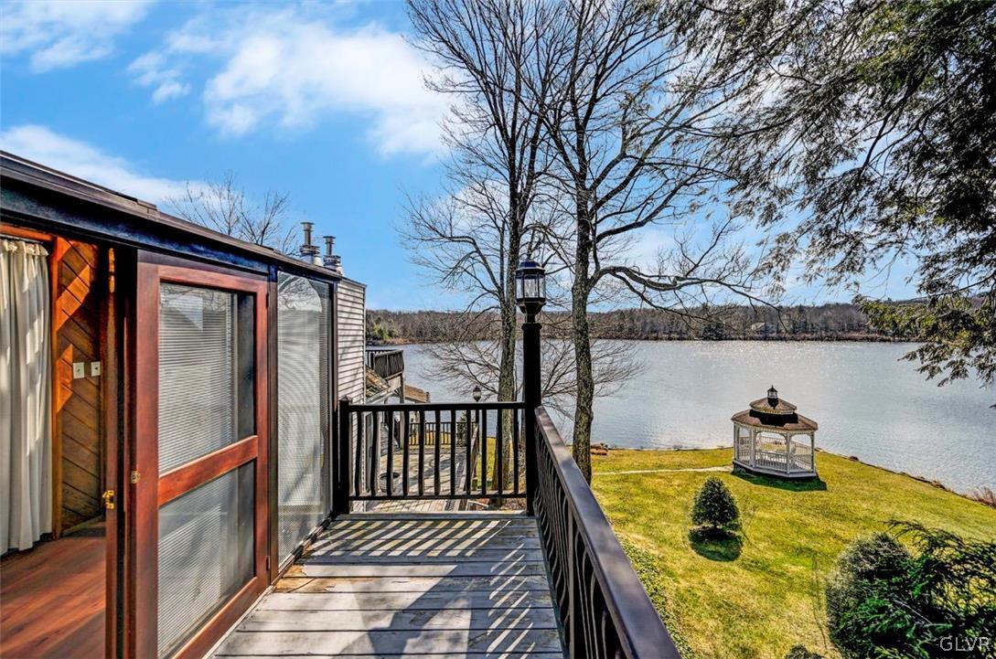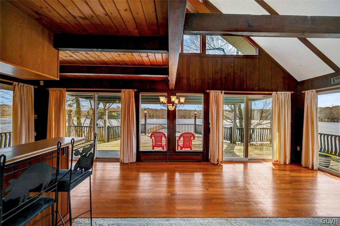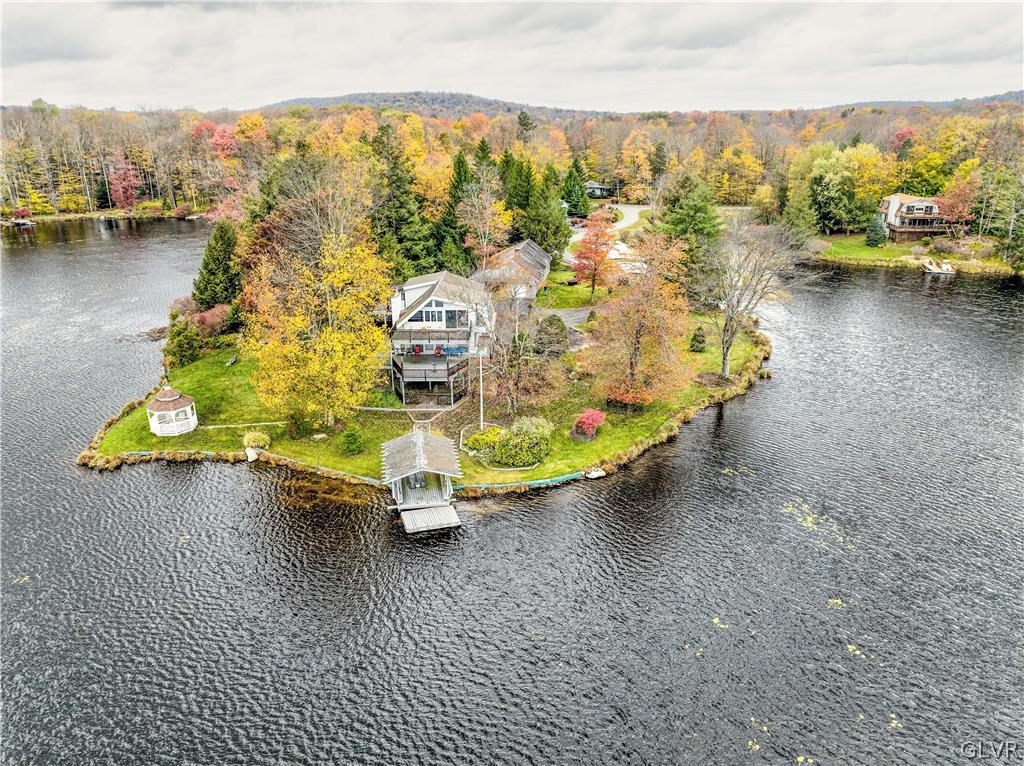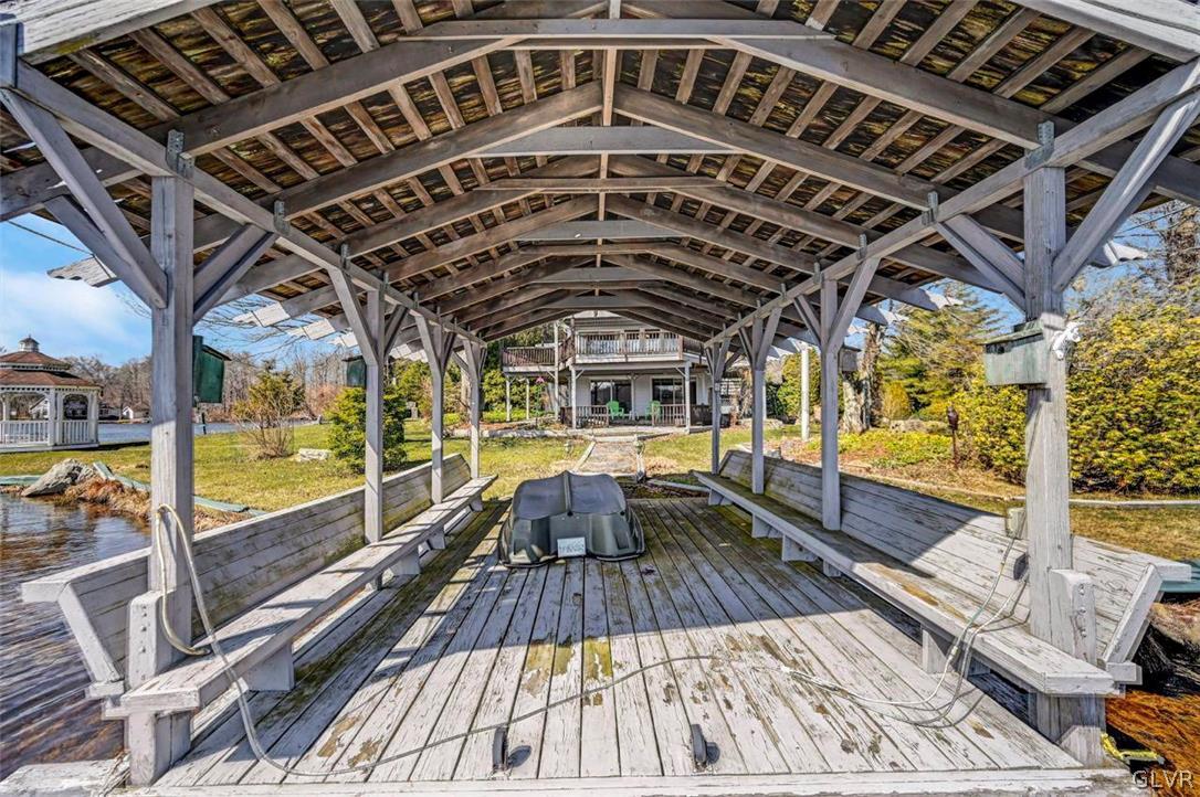 Welcome to 105 Buckhorn, where luxury meets tranquility on your very own private peninsula. This stunning three-story oasis offers over 700 feet of serene lake frontage, complete with a private covered dock, Amish Gazebo, and outdoor BBQ area, perfect for entertaining or simply soaking in the picturesque surroundings. Step inside this meticulously crafted lake-front home to discover three floors of spacious living, all above ground. Featuring a grand primary suite, complete with a private glass sunroom offering breathtaking views of the lake. With three additional bedrooms and two more baths, there's plenty of room for family and guests to unwind in comfort. Throughout the home, real cedar wood paneling adds warmth and character, creating a cozy ambiance that invites relaxation. Experience the ultimate in peace and serenity as you gaze out from every floor, taking in the tranquil beauty of the lake and surrounding grounds. Two stone fireplaces offer cozy warmth on cooler evenings, while a loft area reminiscent of a ship made of glass provides a unique retreat for quiet reflection or intimate gatherings.