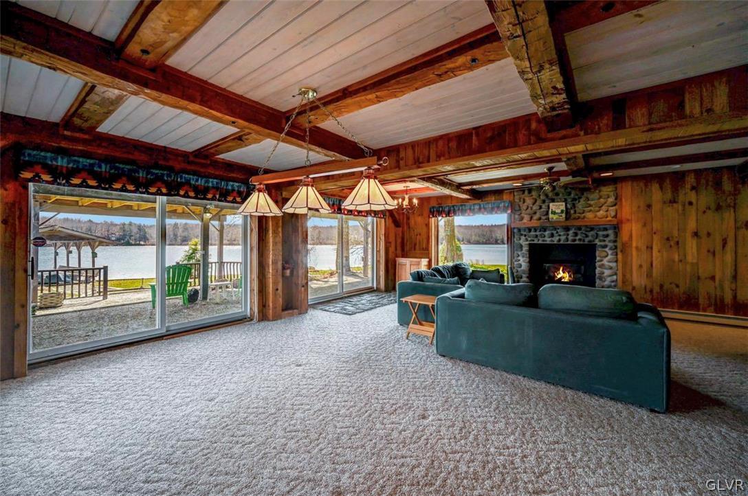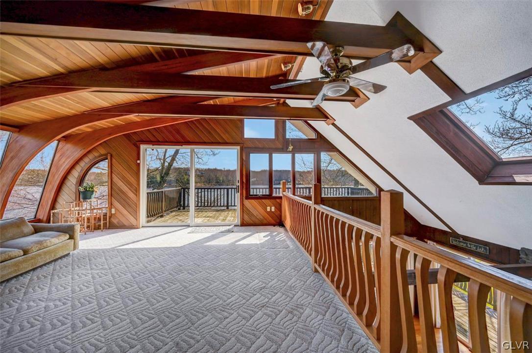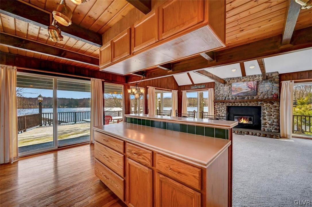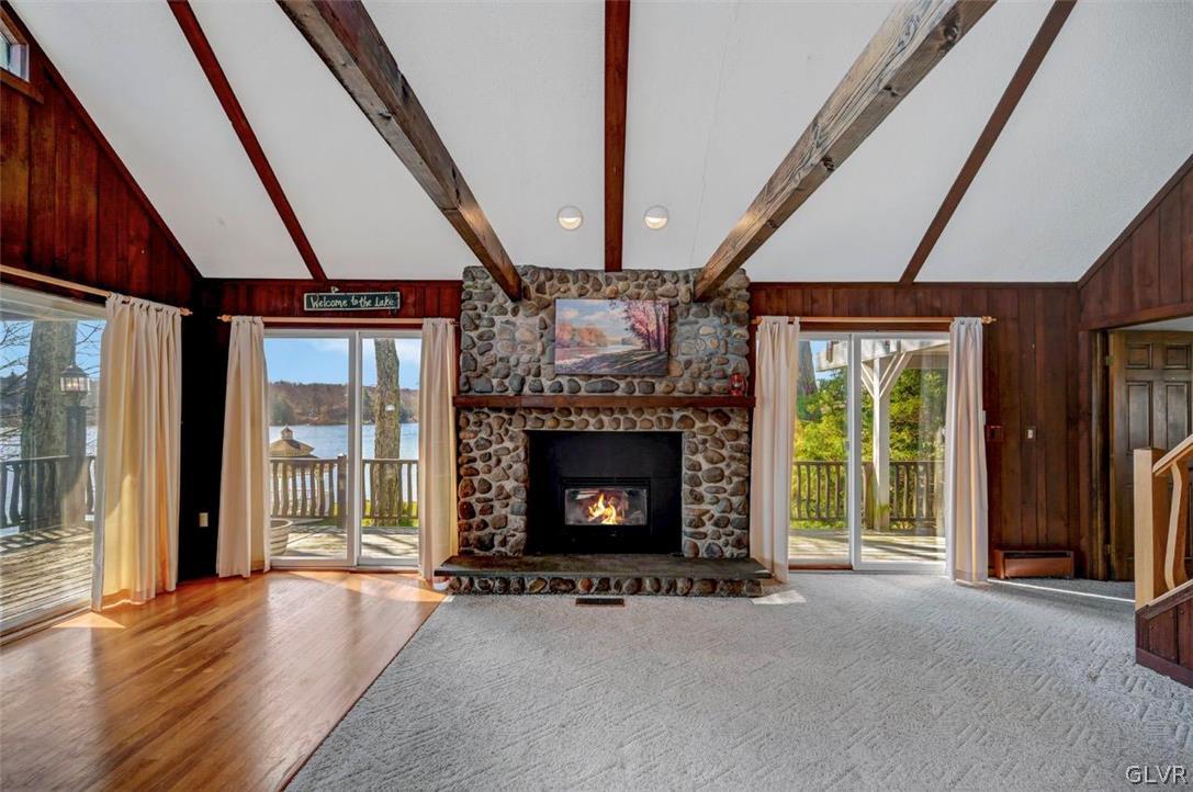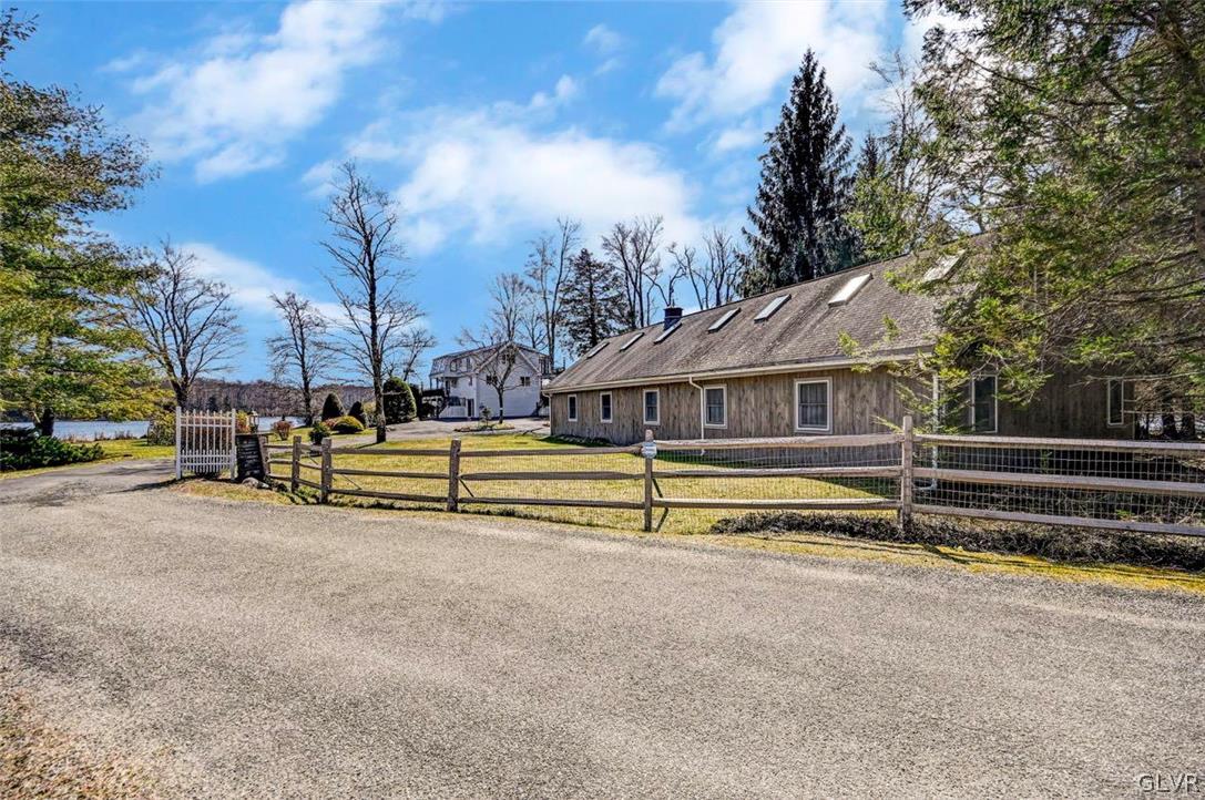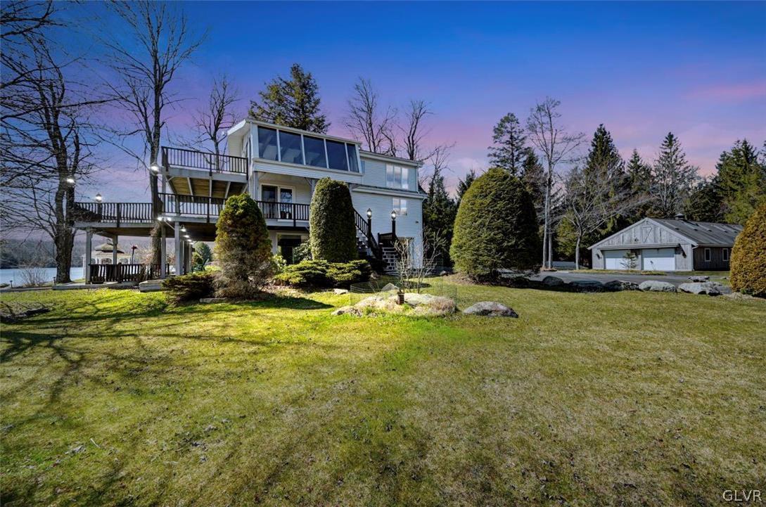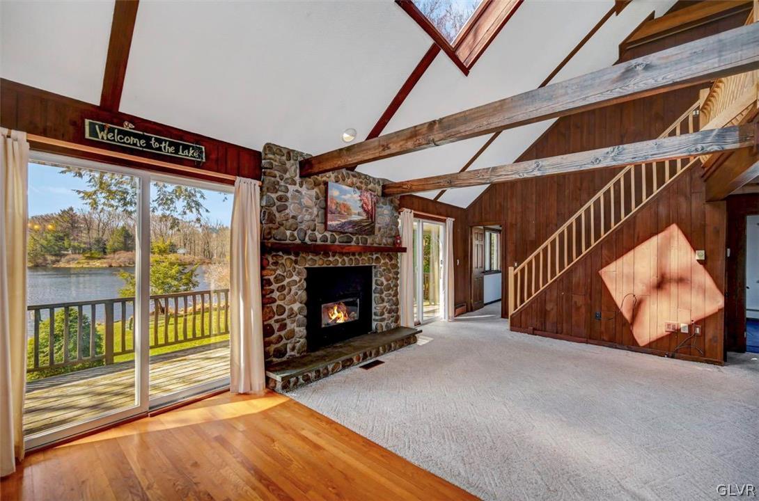 Welcome to 105 Buckhorn, where luxury meets tranquility on your very own private peninsula. This stunning three-story oasis offers over 700 feet of serene lake frontage, complete with a private covered dock, Amish Gazebo, and outdoor BBQ area, perfect for entertaining or simply soaking in the picturesque surroundings. Step inside this meticulously crafted lake-front home to discover three floors of spacious living, all above ground. Featuring a grand primary suite, complete with a private glass sunroom offering breathtaking views of the lake. With three additional bedrooms and two more baths, there's plenty of room for family and guests to unwind in comfort. Throughout the home, real cedar wood paneling adds warmth and character, creating a cozy ambiance that invites relaxation. Experience the ultimate in peace and serenity as you gaze out from every floor, taking in the tranquil beauty of the lake and surrounding grounds. Two stone fireplaces offer cozy warmth on cooler evenings, while a loft area reminiscent of a ship made of glass provides a unique retreat for quiet reflection or intimate gatherings.