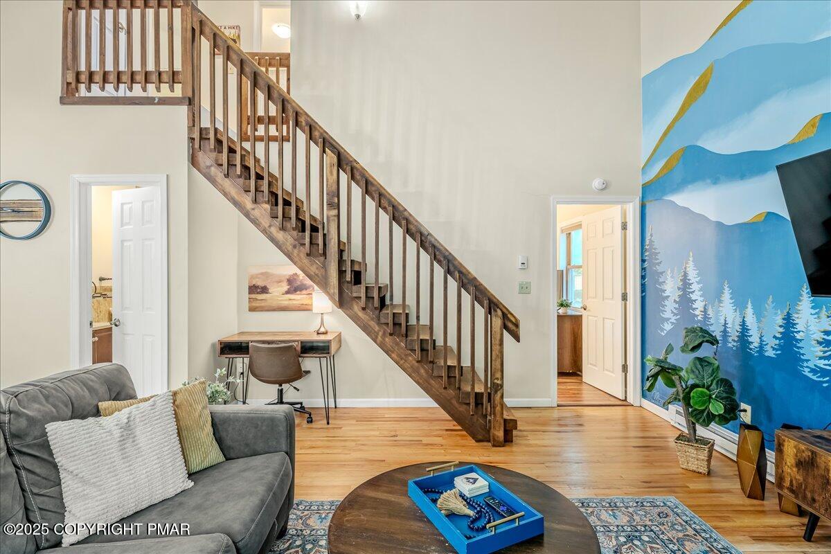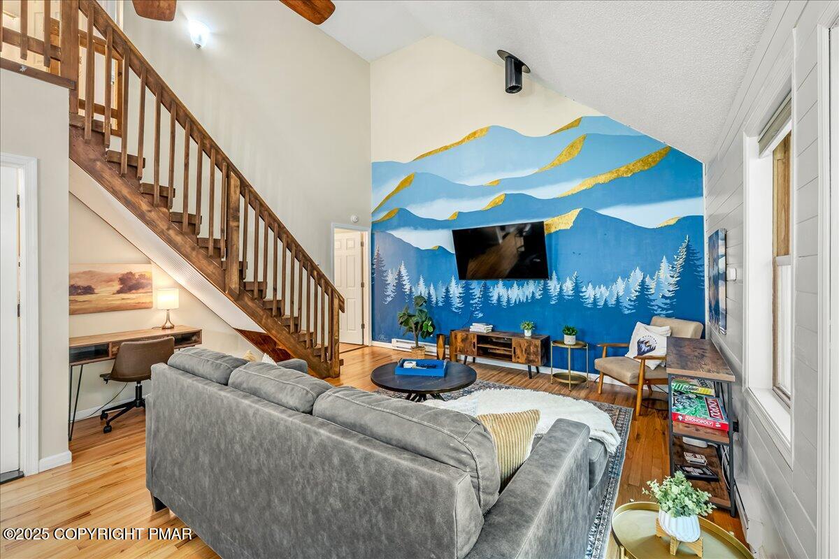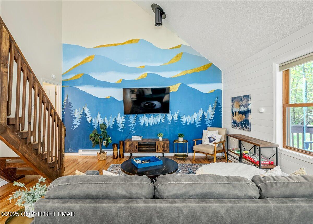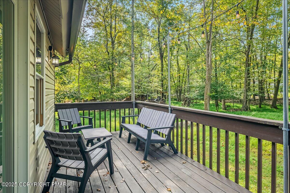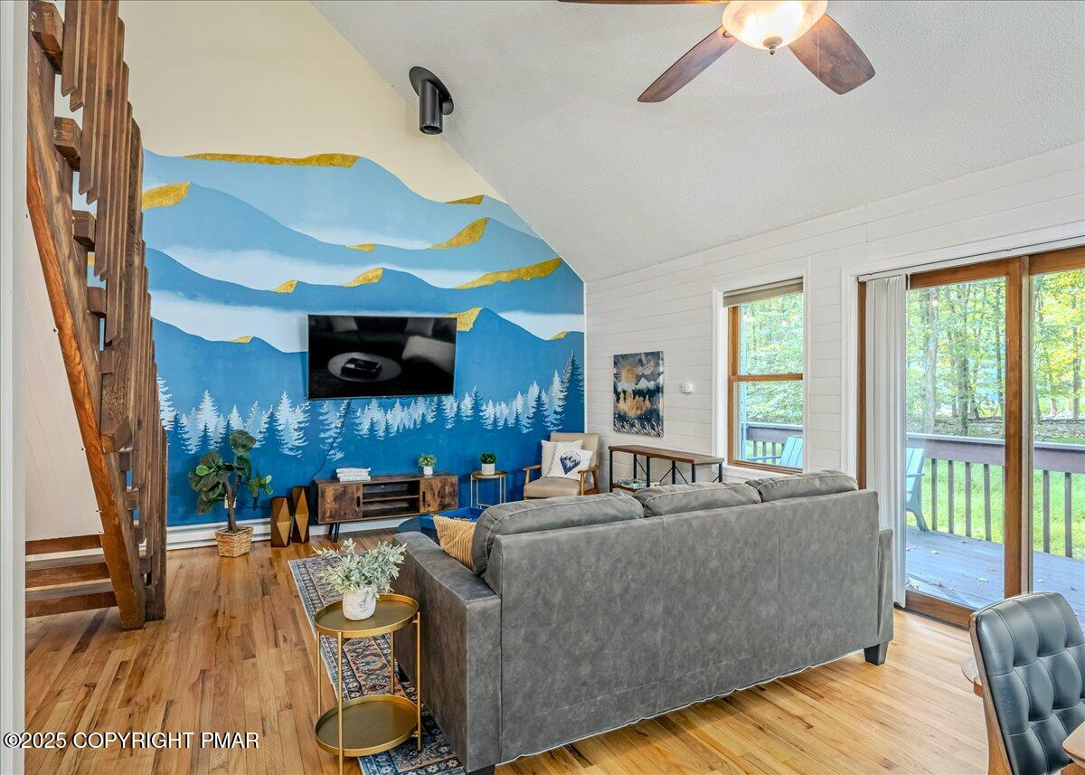 Set on a quiet wooded lot with a flat paved drive and easy access, this property hits the sweet spot between comfort and income. Inside, the vaulted great room stuns with a hand-painted mountain mural and open-concept living that flows to the dining area and sleek galley kitchen featuring white shaker cabinetry, stone counters, and stainless steel appliances. Step through sliding doors onto the full-length deck surrounded by trees--ideal for grilling, relaxing, or unwinding in the hot tub under the string lights. The main-level primary suite is paired with a beautifully tiled bath, while upstairs two guest rooms and a second updated bath complete the perfect layout for guests. Hardwood floors, stylish lighting, and thoughtful finishes create an inviting modern vibe.