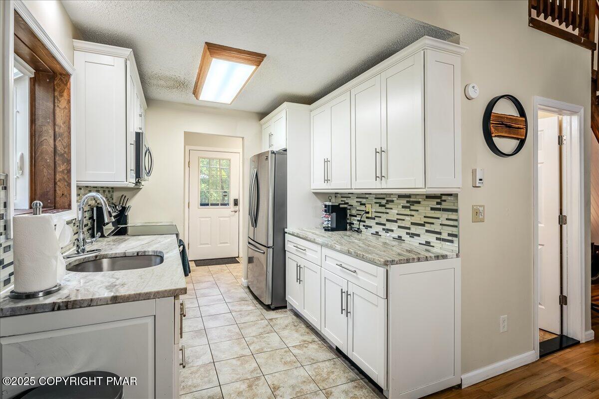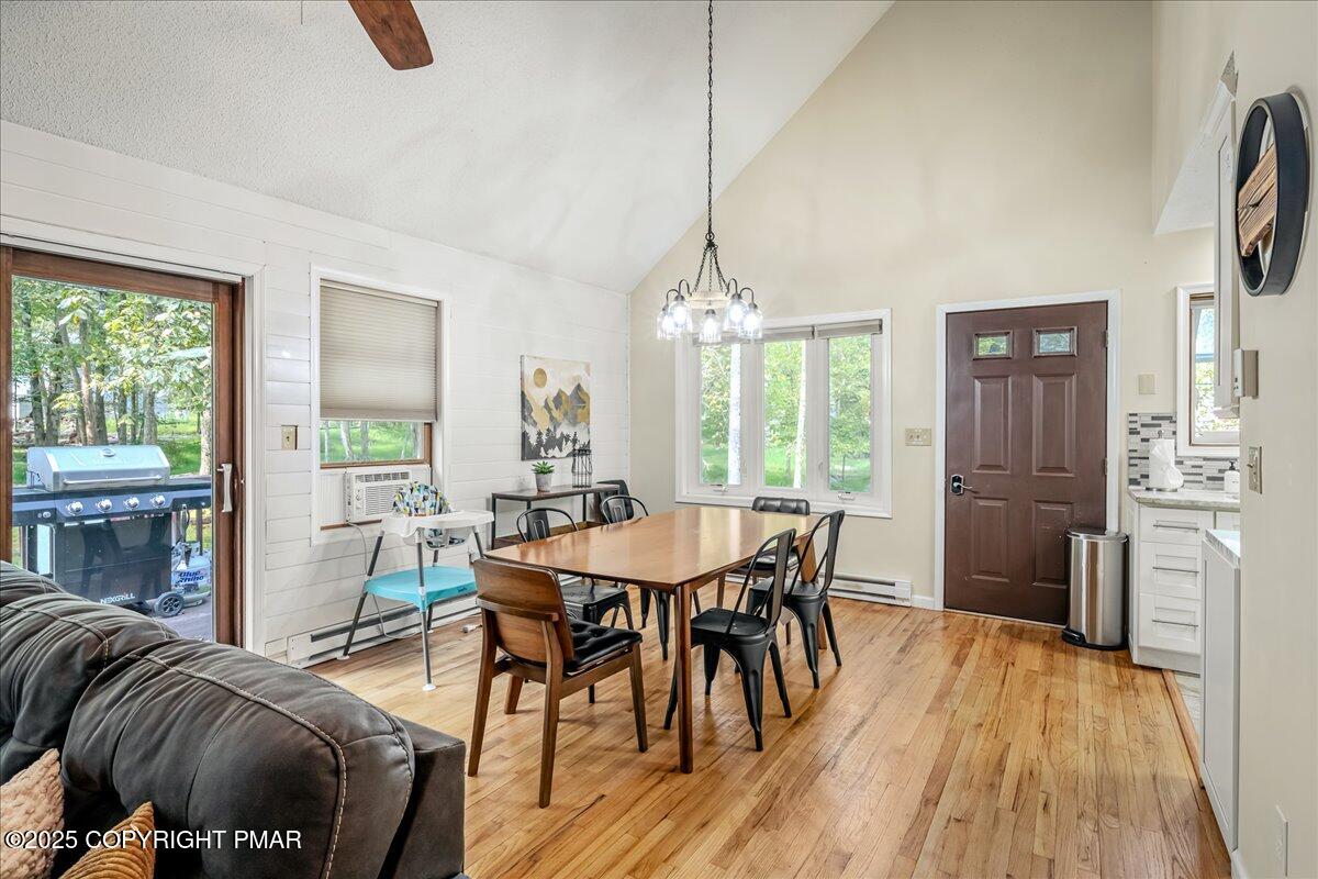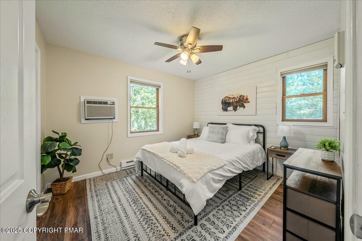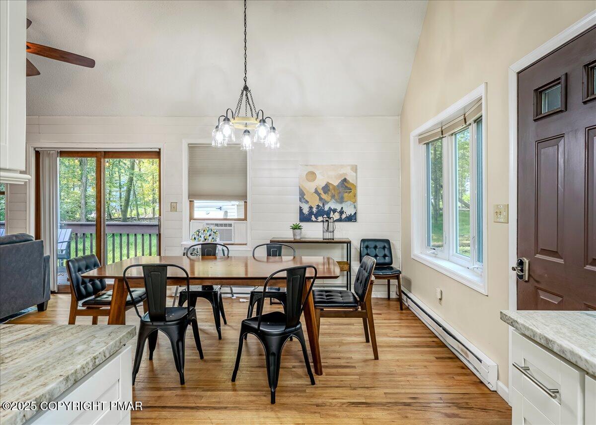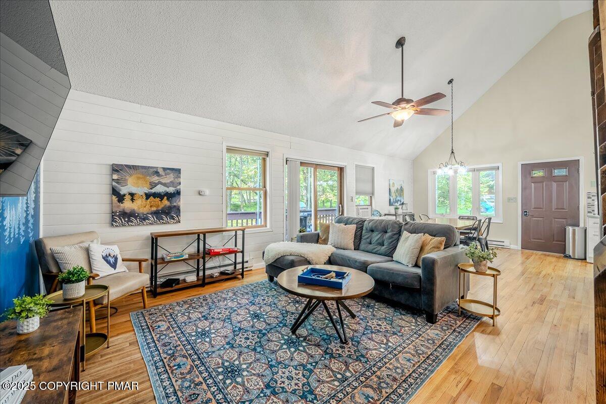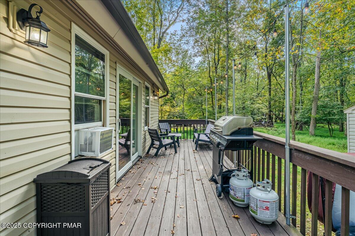 Set on a quiet wooded lot with a flat paved drive and easy access, this property hits the sweet spot between comfort and income. Inside, the vaulted great room stuns with a hand-painted mountain mural and open-concept living that flows to the dining area and sleek galley kitchen featuring white shaker cabinetry, stone counters, and stainless steel appliances. Step through sliding doors onto the full-length deck surrounded by trees--ideal for grilling, relaxing, or unwinding in the hot tub under the string lights. The main-level primary suite is paired with a beautifully tiled bath, while upstairs two guest rooms and a second updated bath complete the perfect layout for guests. Hardwood floors, stylish lighting, and thoughtful finishes create an inviting modern vibe.