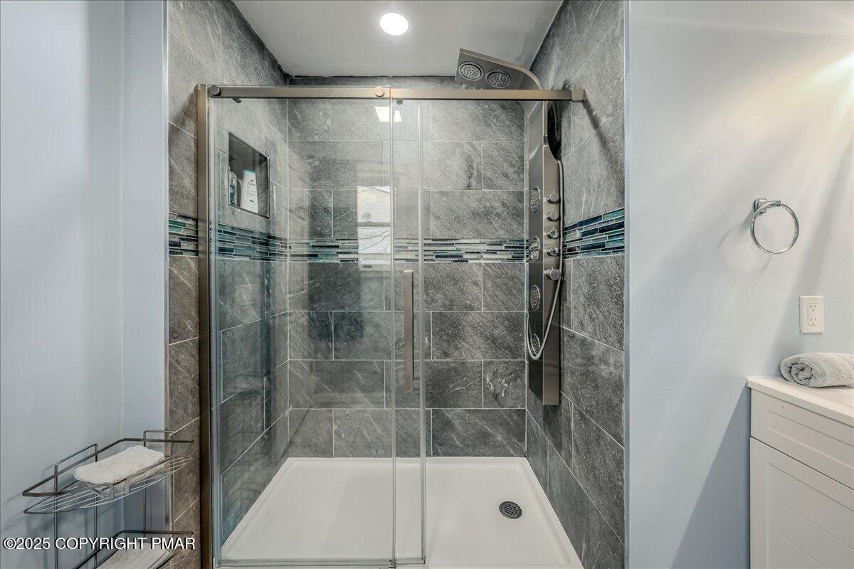 Do not miss this turnkey, fully furnished, and STR-ready in Pocono Farms Country Club priced under $300,000! This beautifully remodeled home delivers the ideal blend of modern comfort, eye-catching style, and unbeatable amenity access. Featuring vaulted ceilings, a stone fireplace, and an open-concept living area, the home feels bright, spacious, and perfect for hosting. The upgraded kitchen offers a large center island, granite counters, stainless appliances, and direct access to the deck and screened-in porch for seamless indoor/outdoor entertaining. The layout truly shines with a convenient first-floor bedroom suite, two additional bedrooms, updated baths, and a spacious bonus room perfect for a game room, lounge, or extra sleeping space. Step outside to a private backyard, oversized driveway, and a brand-new hot tub your guests will love. Added perks include a Tesla charger and RV hookup to boost rental appeal. Located in Pocono Farms Country Club, you'll enjoy access to a lakeside beach, championship golf course, fitness center, pool, restaurant, bar, and more. Minutes to Kalahari, Camelback skiing and waterparks, Mt. Airy Casino, state parks, shopping, and I-80, this property offers year-round demand and effortless rental potential. A fully furnished, move-in-ready opportunity like this is rare - don't wait to schedule your showing!