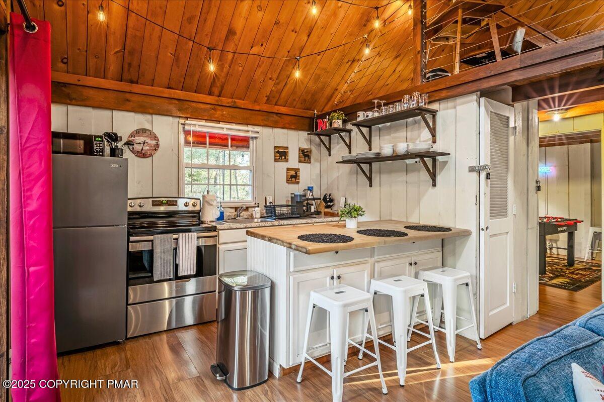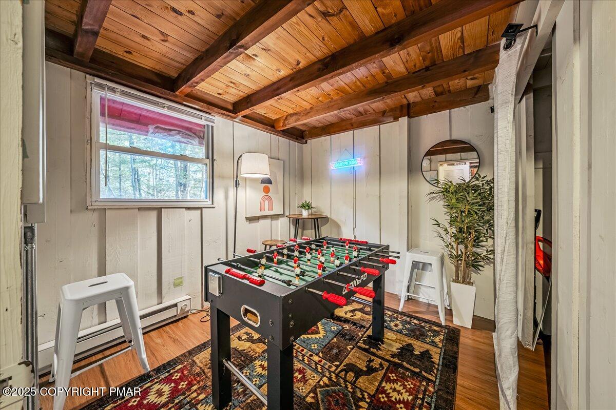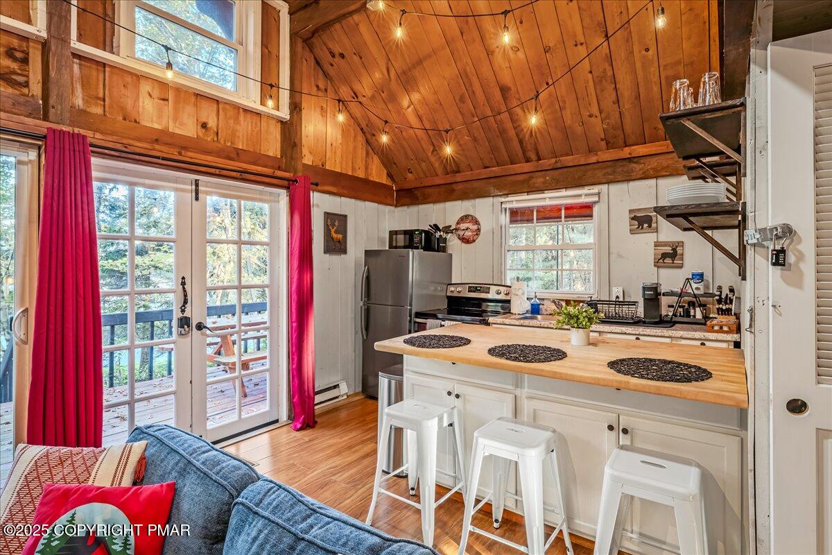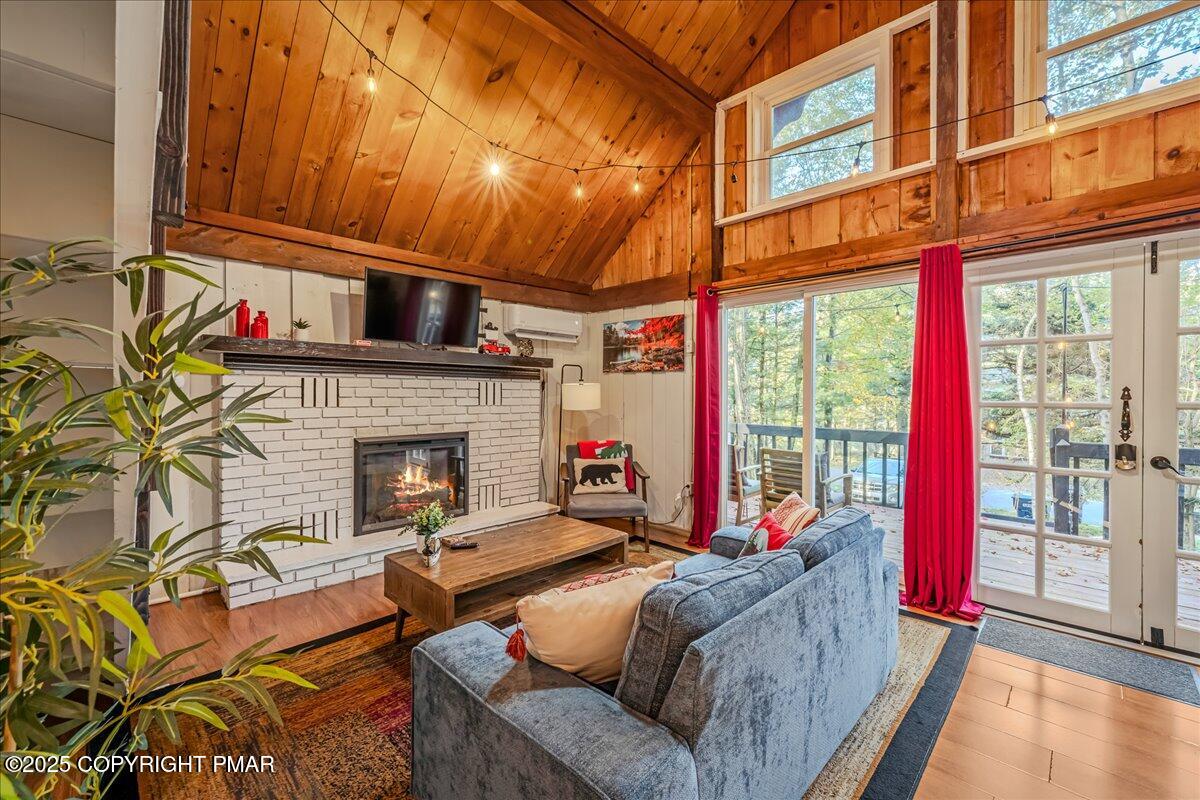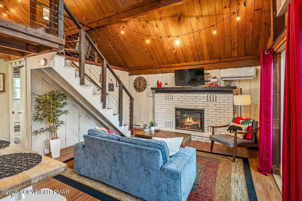 Inside, the home blends rustic warmth with modern comfort - vaulted wood ceilings, exposed beams, a cozy fireplace and bright open kitchen that flows to French doors and a wraparound deck under string lights. Outside, enjoy a private hot tub, firepit lounge and wooded backdrop ideal for year-round relaxation. Stunning open loft and main level bedroom provide flexible sleeping space, and the finished lower level adds fun with games and hangout zones.