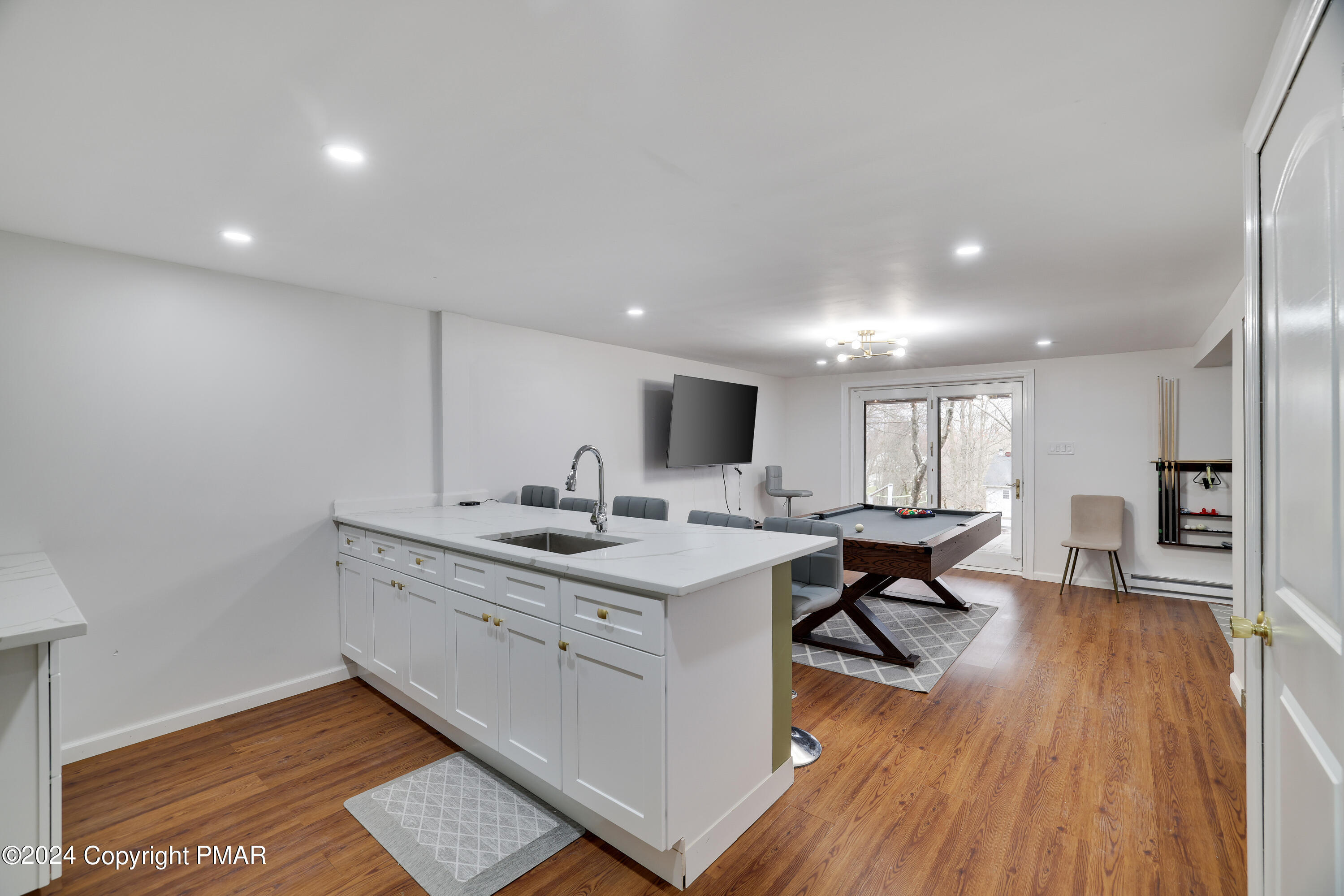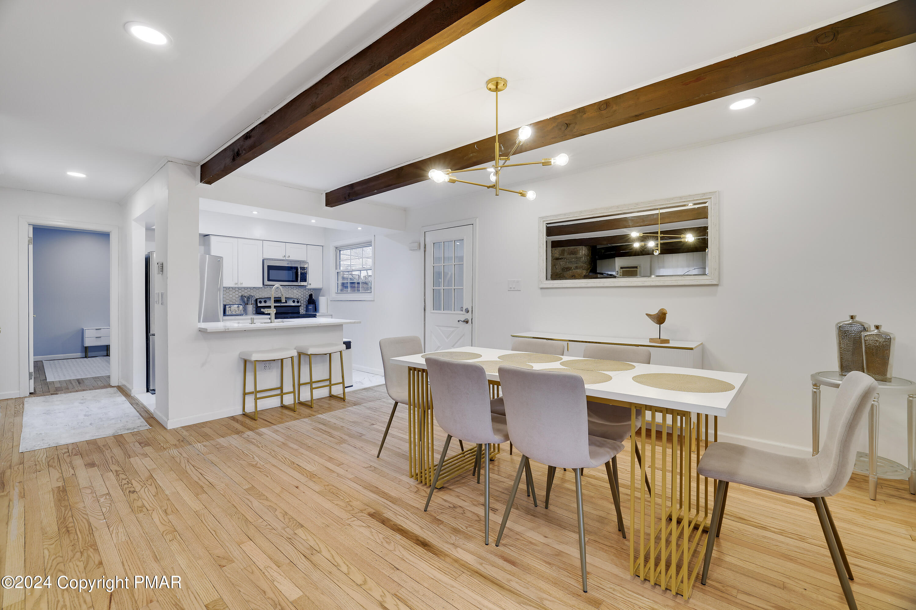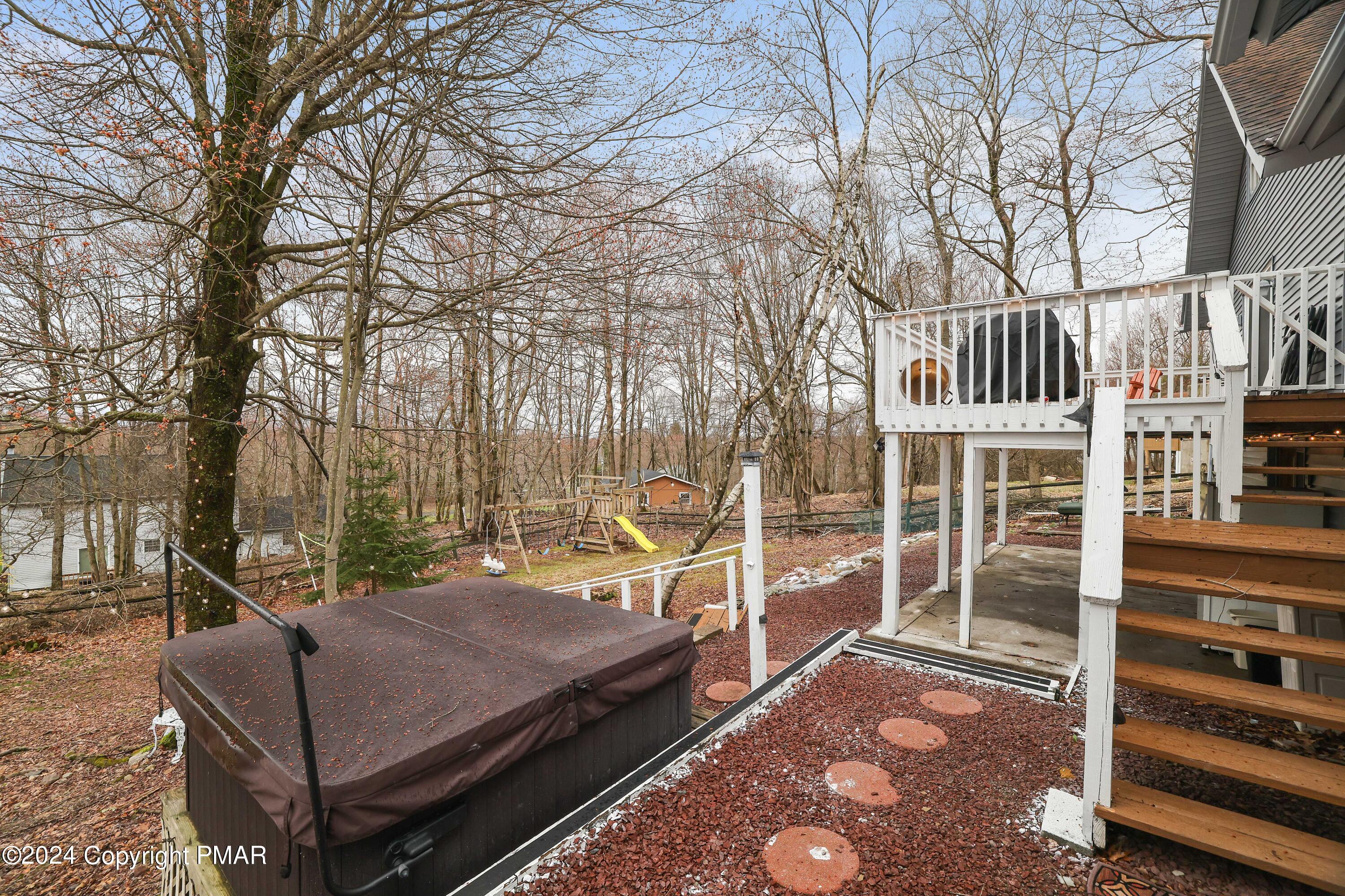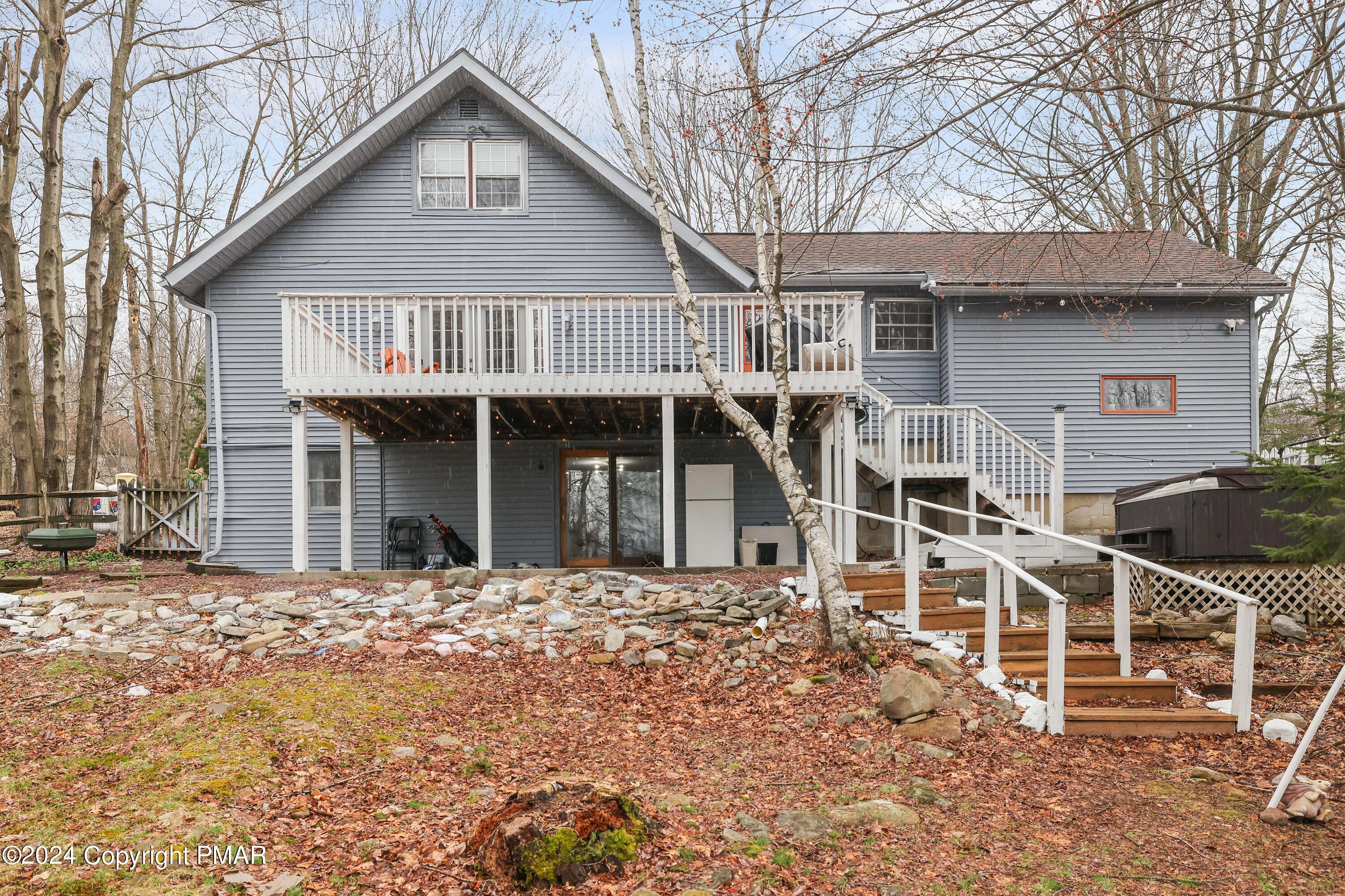 Newly renovated 6 bedroom, 3 full bath contemporary on a private 1/2 acre setting in the 5 lake community of Emerald Lakes within walking distance to the beaches of Emerald and Pine Tree Lakes. Entertain in the spacious open concept great room with exposed wood beams, a beautiful oversized impressive floor to ceiling stone fireplace, hardwood floors, recess lighting and french doors that open to the rear deck for outdoor gatherings and barbecues. There is a large entry foyer and sitting room, 2 bedrooms and a full bath on the main level. The upper level has 2 additional generous sized bedrooms and a full bath. The LL has a family/rec room with a 2nd stone FP, an amazing bar/2nd kitchen with a sliding door to a large patio with a hot tub and a fenced in private back yard. There are 2 more bedrooms and a 3rd full bath. Use the oversized built-in garage for all of your beach, boating, and ski gear. Enjoy all of the amenities Emerald Lakes has to offer, indoor and outdoor pools, swimming and boating, a clubhouse with a bar and grill, tennis and a fitness center. Or spend the day at a near by water park or ski area.