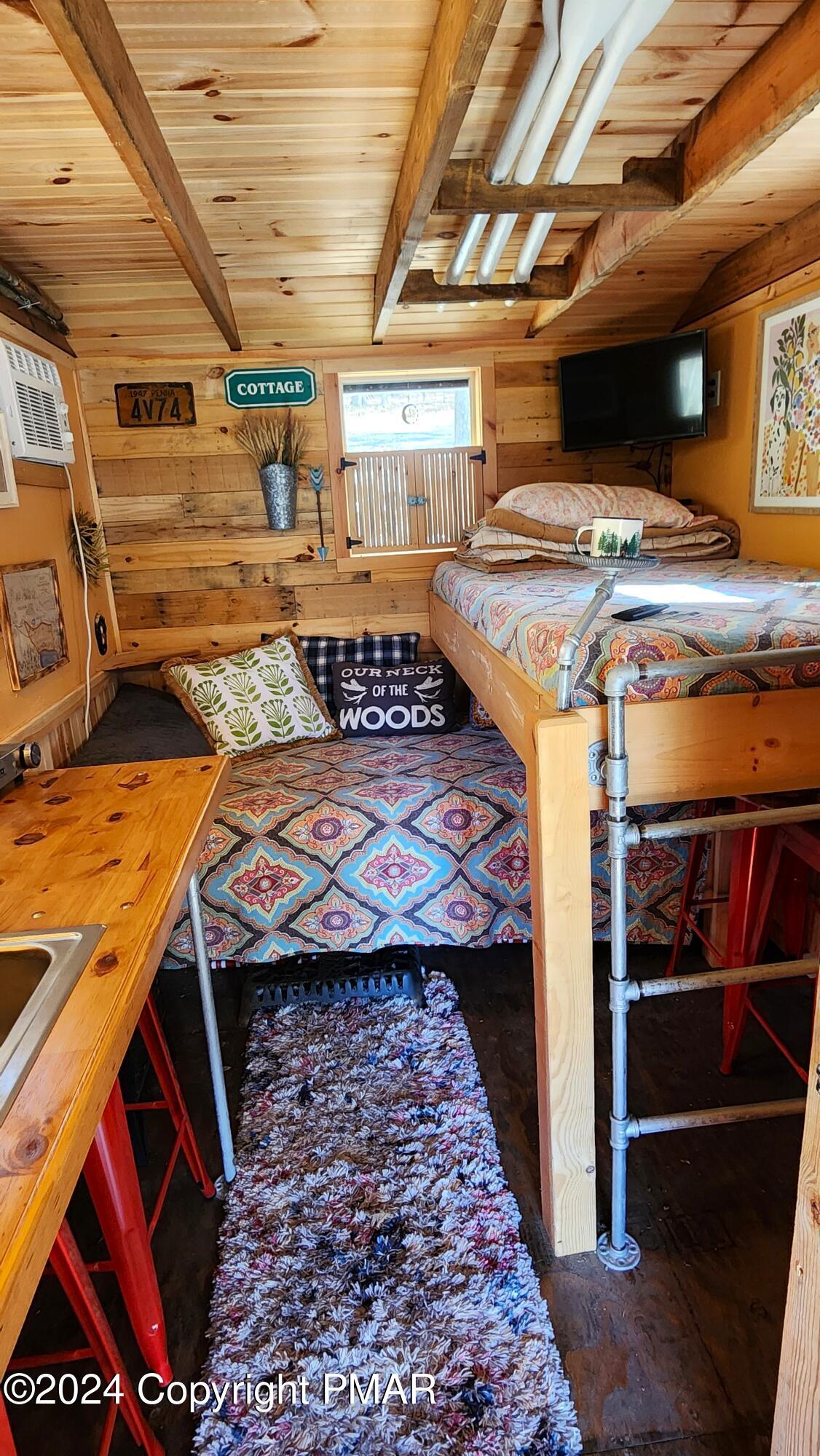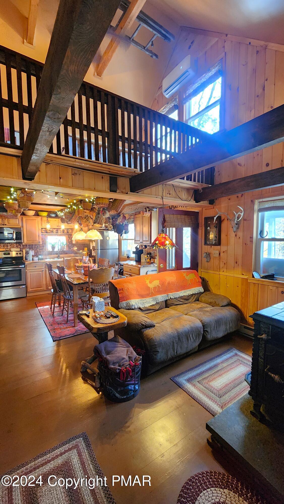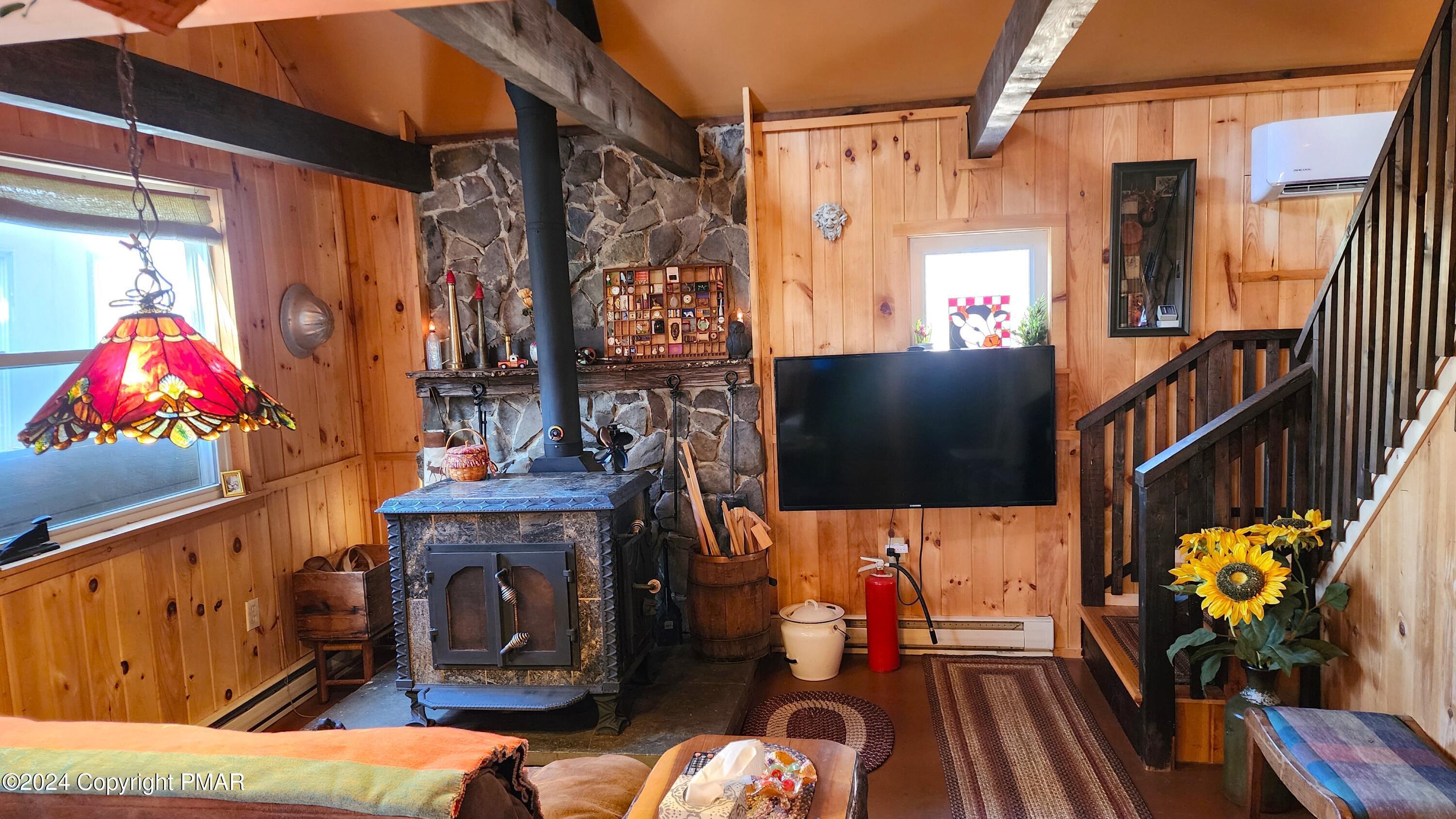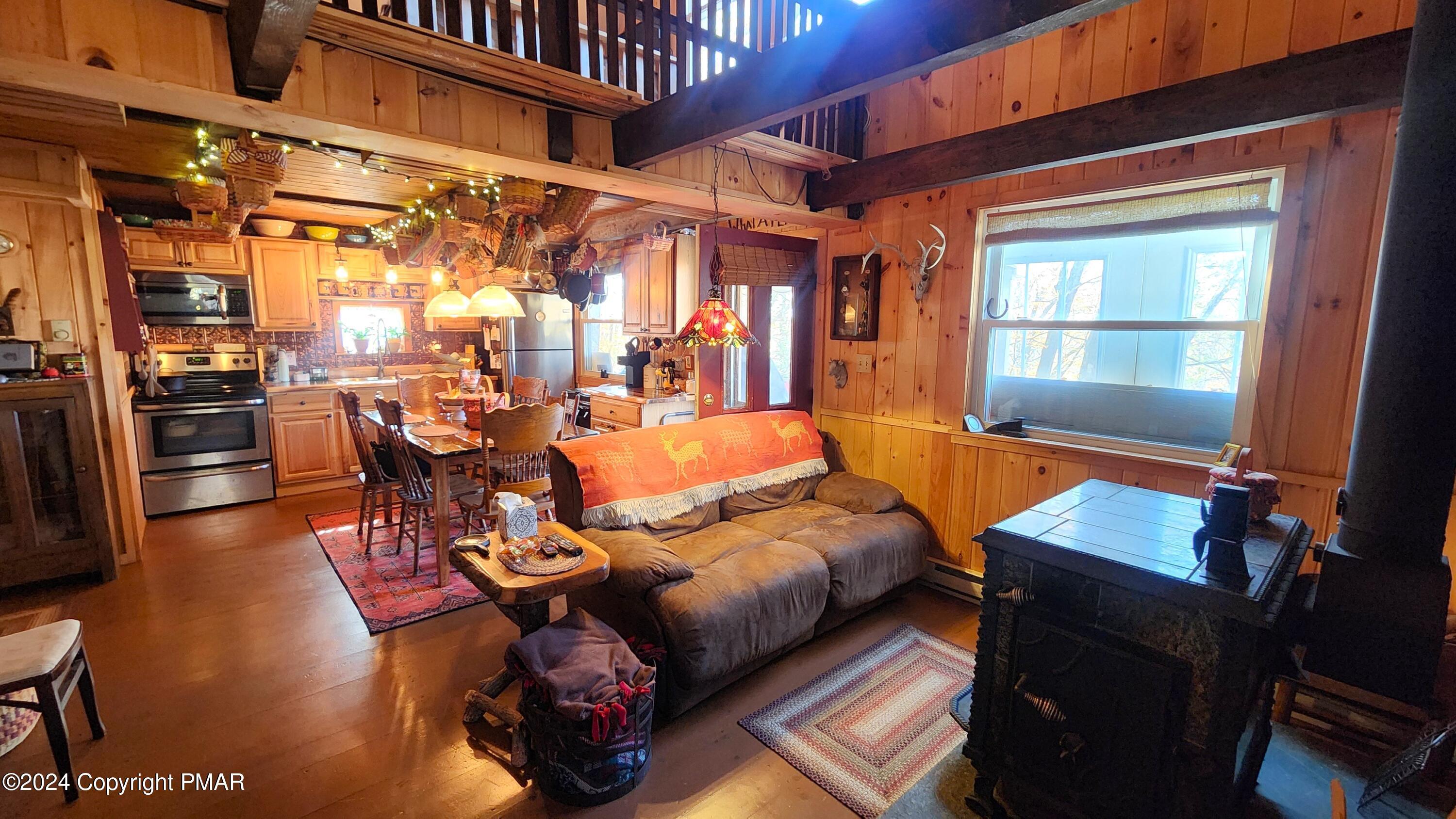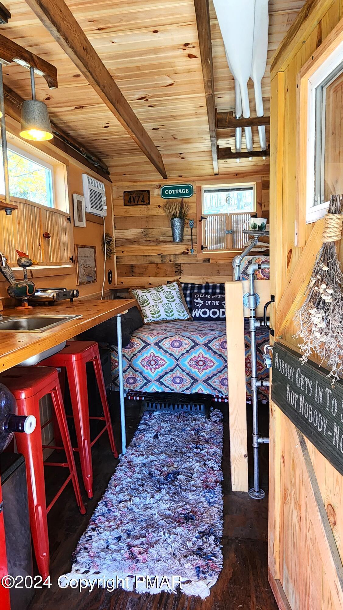Inside the main cabin, the warm and inviting living room features a cozy coal-burning stove, while the kitchen and dining area open into a family room with a classic wood-burning stove. The main level also includes a full bathroom with a clawfoot tub and solid brass fixtures, plus a convenient laundry room. Step outside to take in the mountain air from the deck or unwind in your private outdoor shower!