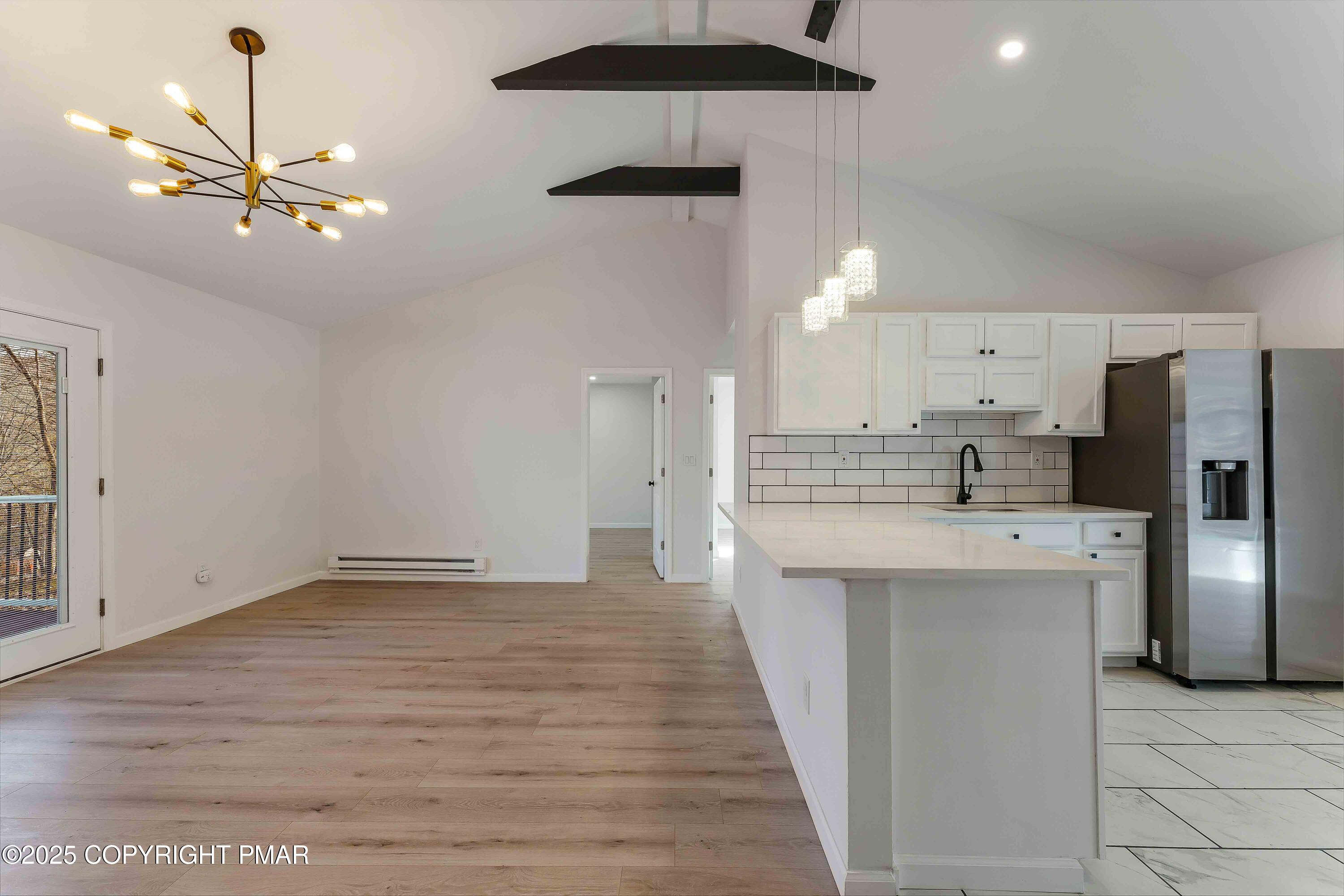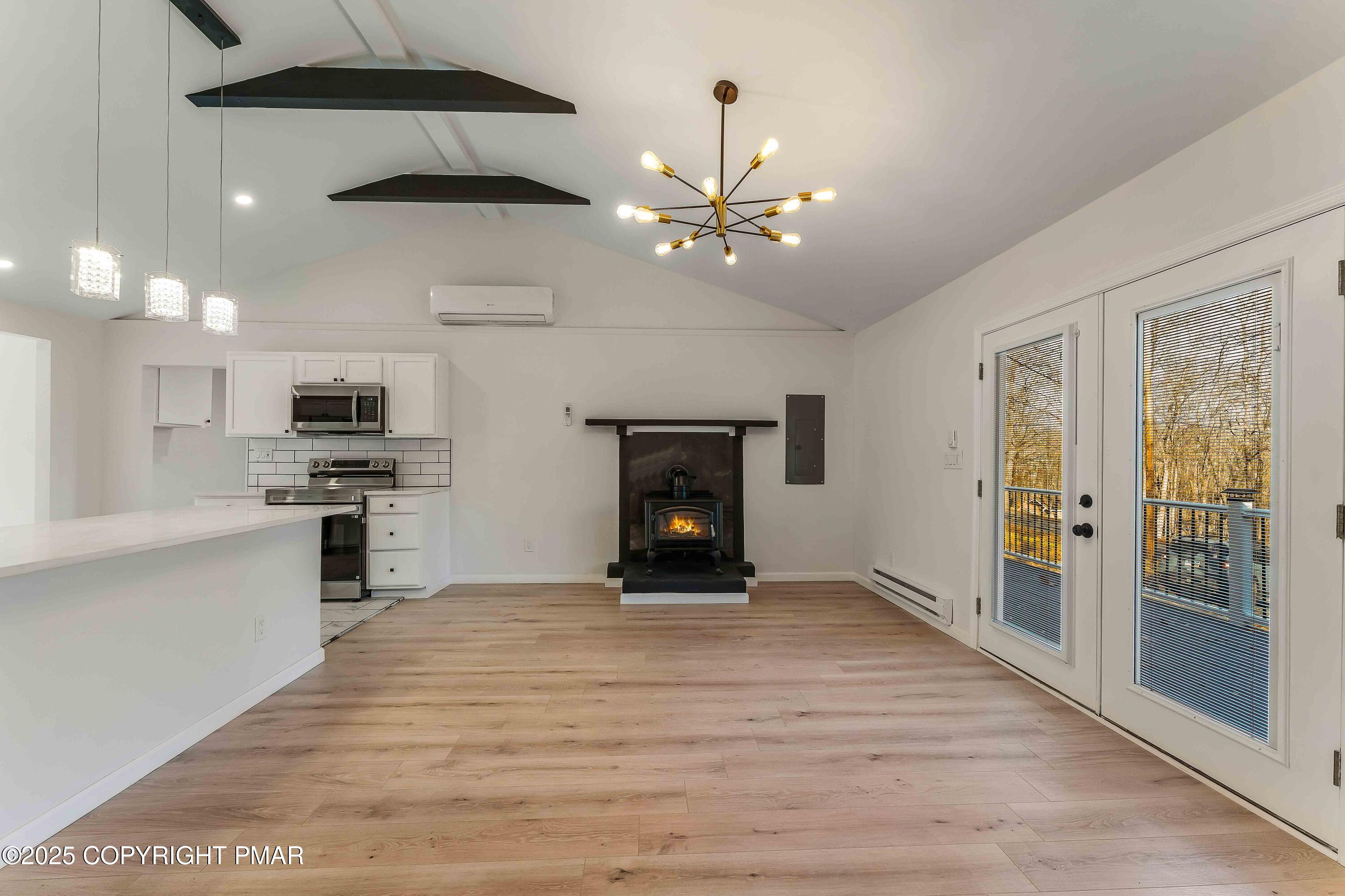 Inside, the open-concept layout features vaulted ceilings with exposed beams, a cozy wood-burning stove, and large windows that fill the space with natural light. The living room includes a newly installed split unit for efficient heating and cooling. A spacious rear addition provides a perfect second family room, dining room, or flexible bonus space to fit your lifestyle. Step outside to a nice deck, great for relaxing or entertaining.