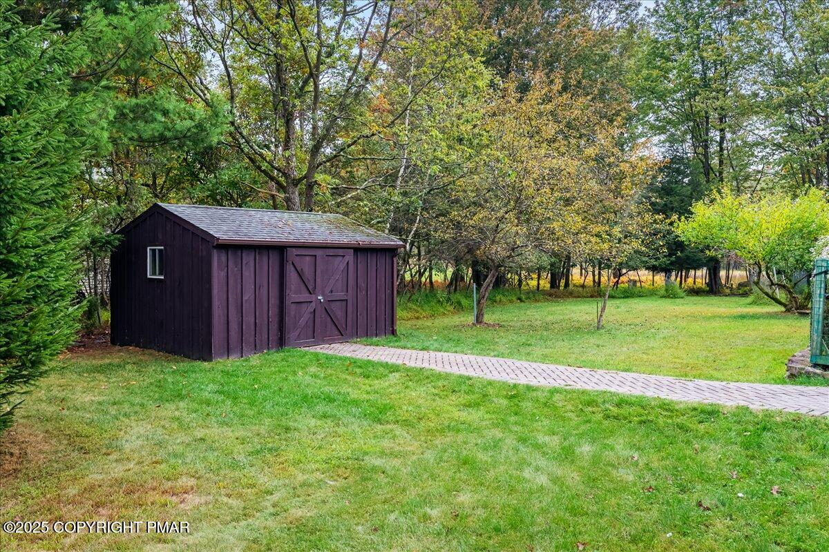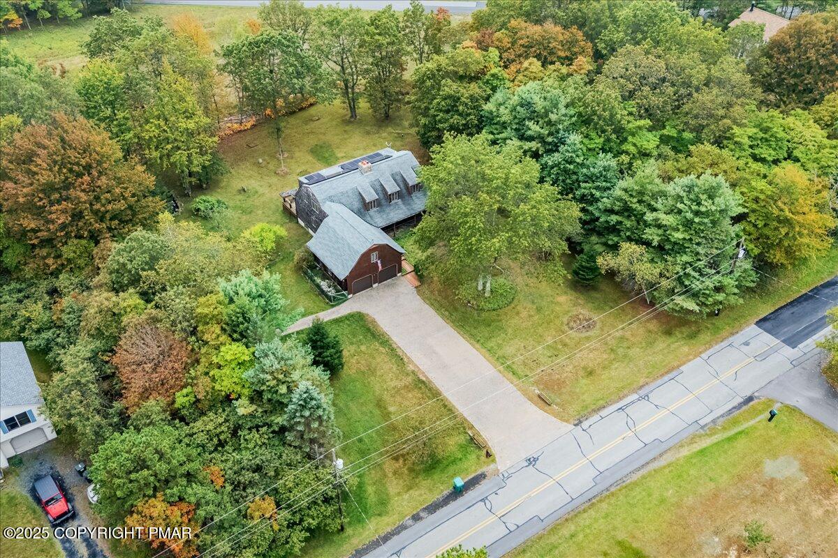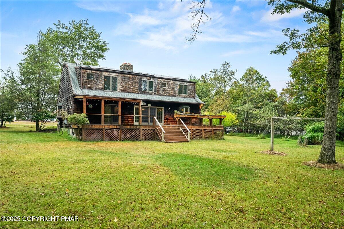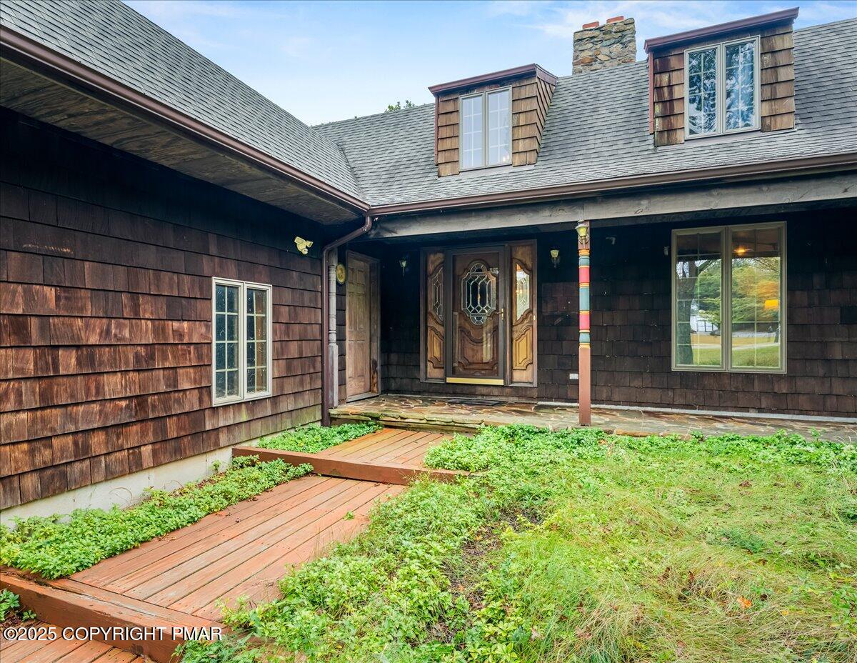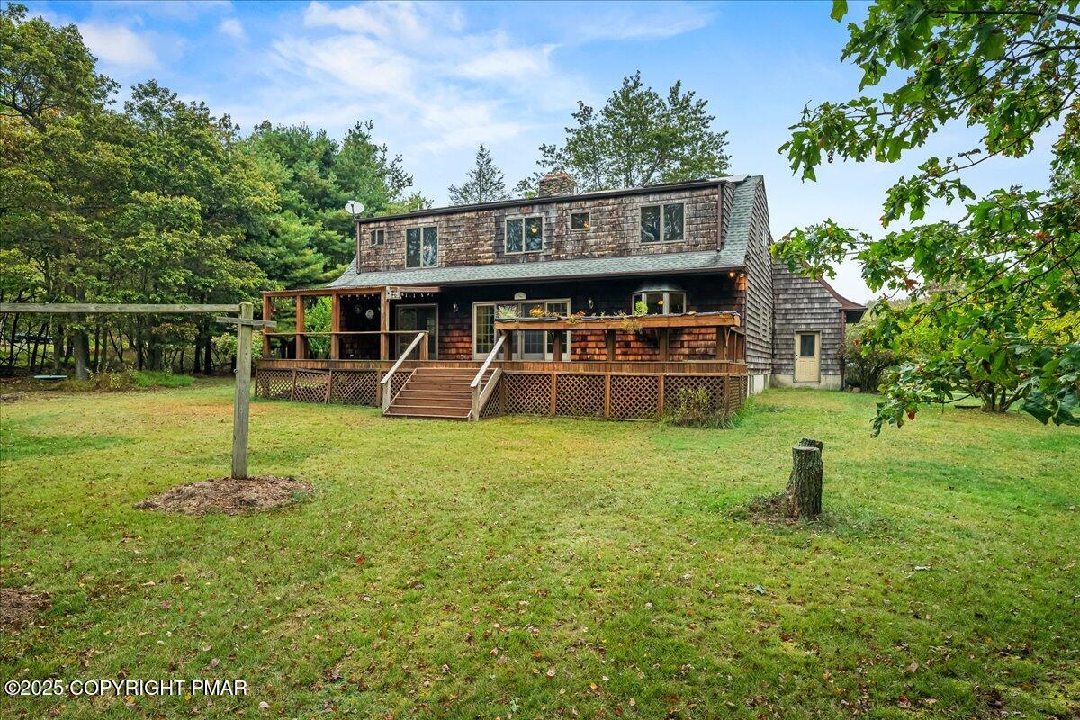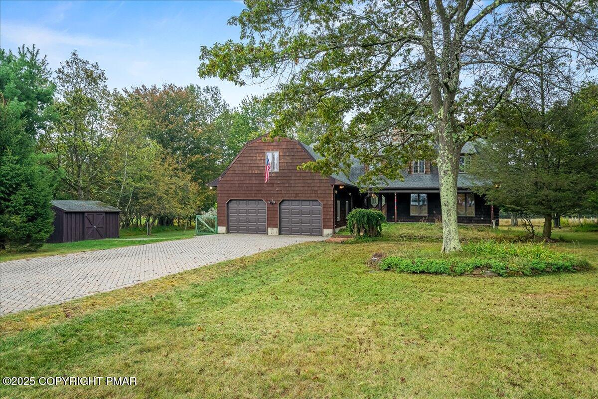 Set in a quiet, low-dues community just minutes from Pocono Raceway, Lake Harmony's Jack Frost/Big Boulder ski areas, and with easy access to Route 80, this custom-built wood-sided one-owner home offers incredible value and character. From the moment you arrive, the brick paver driveway makes a statement, leading to a two-car garage with walk-up bonus space and surrounded by a fully flat acre-plus lot dotted with fruit trees and open usable lawn that backs to preserved right-of-way.