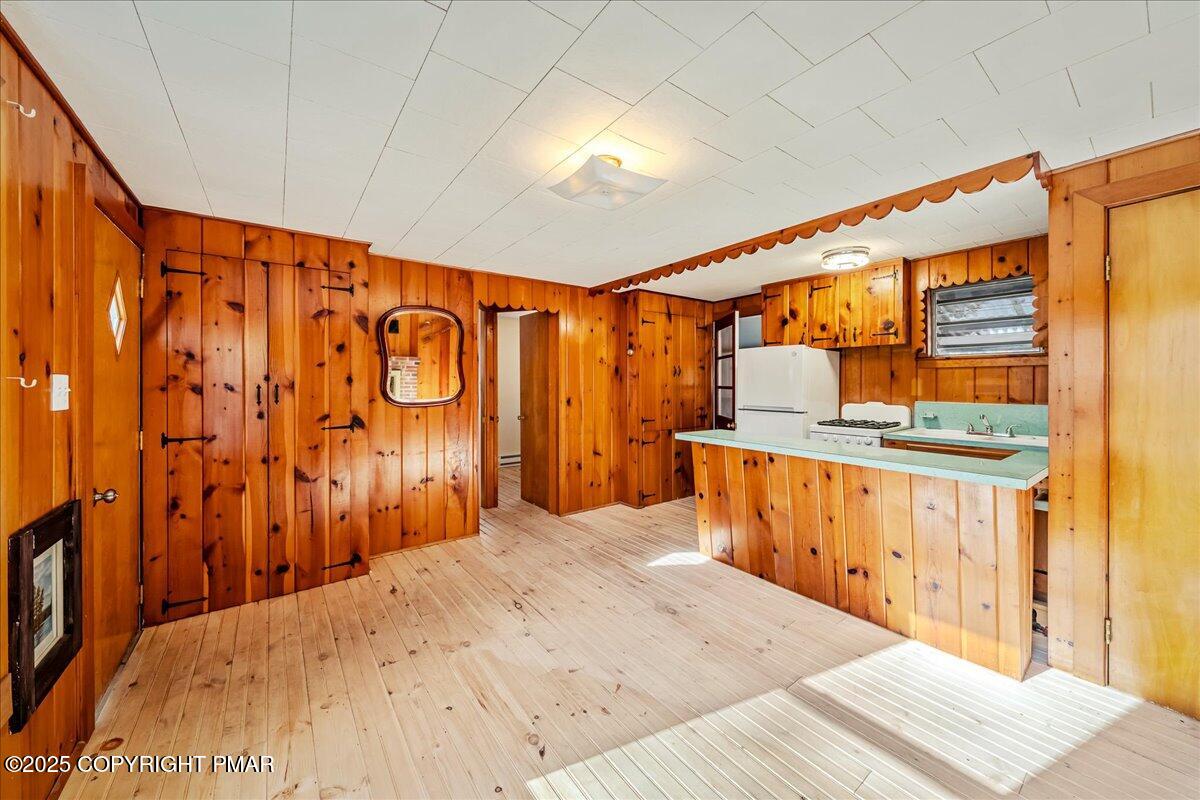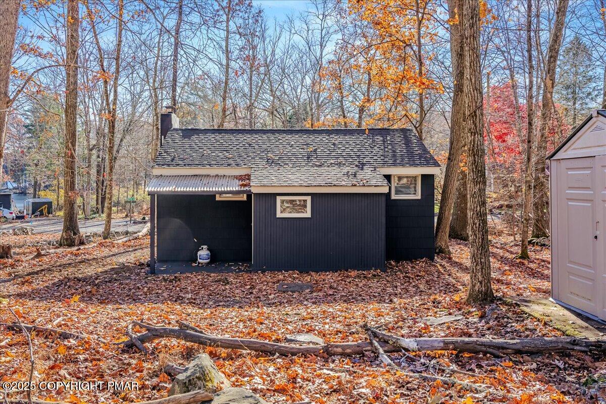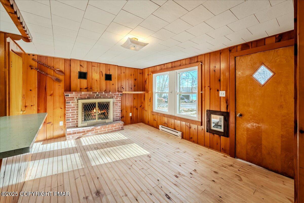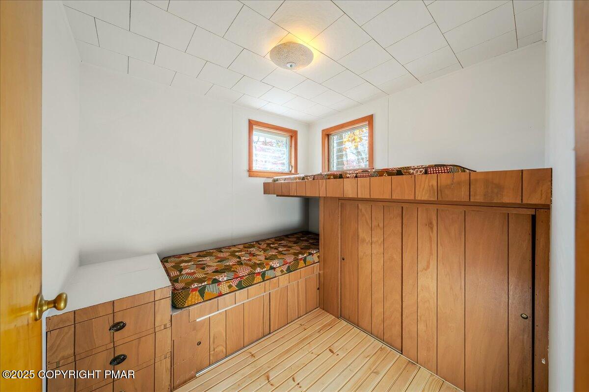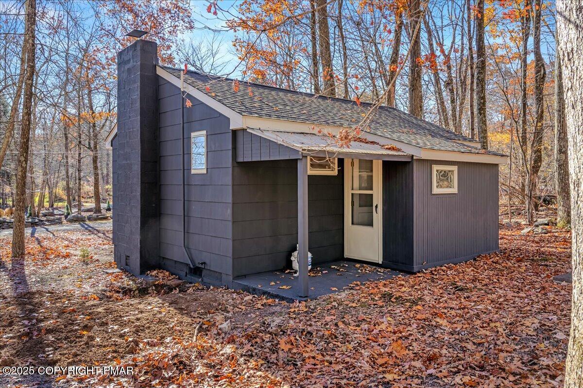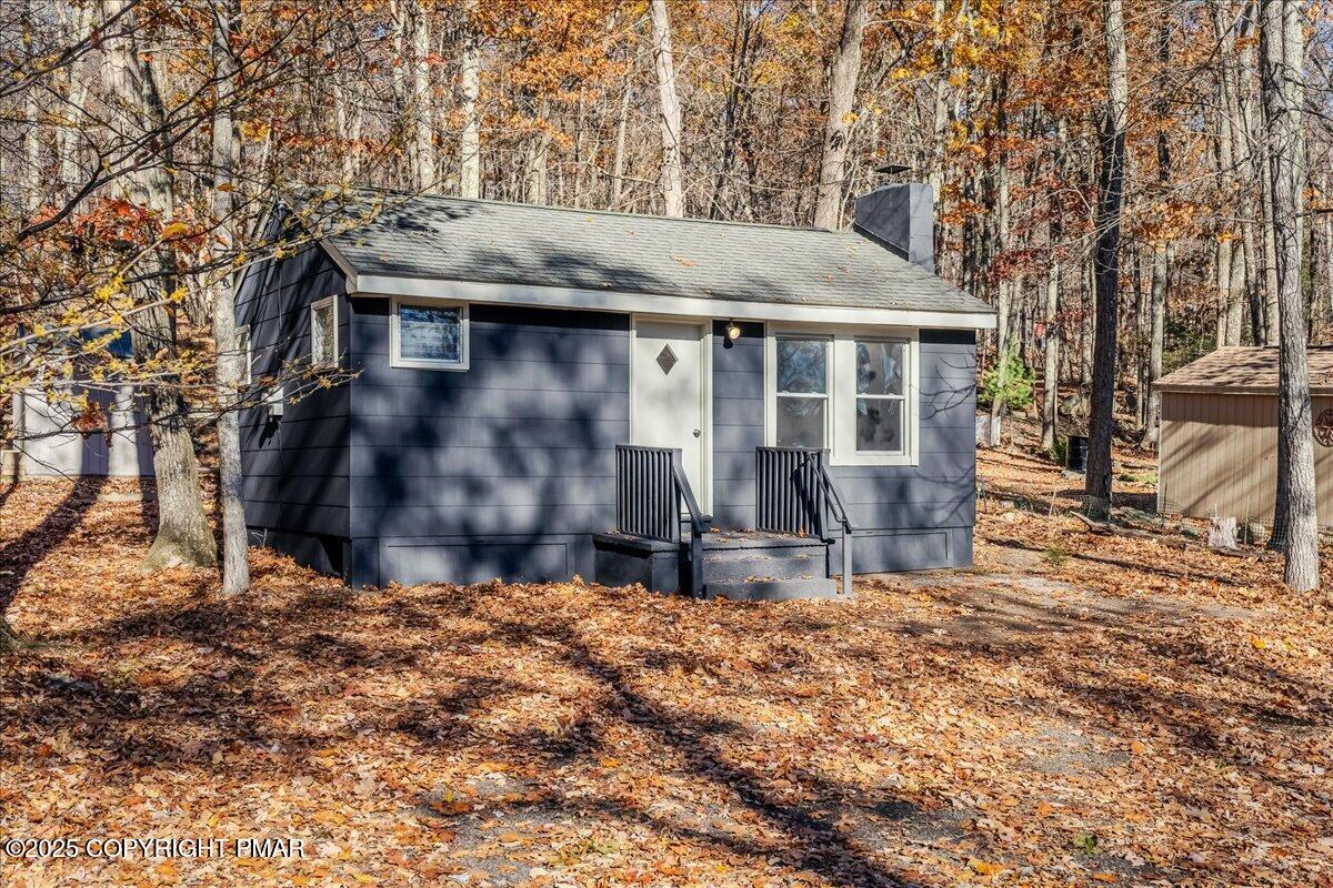 Do not wait to see this charming lakeview escape in the Monroe Lakes community of East Stroudsburg, where classic Pocono character meets peaceful woodland surroundings. This cozy two-bedroom, one-bath cabin has been lovingly maintained and captures the essence of a true mountain retreat. Step inside to find original craftsmanship throughout, from the warm knotty pine walls to the detailed wood trim that reflects timeless quality. The inviting living area centers around a brick fireplace, perfect for cozy evenings after a day by the lake. The kitchen features a working vintage Caloric gas stove, mint-green countertops, wood cabinetry with scalloped accents, blending nostalgic charm with everyday function. Both bedrooms make clever use of space with built-in storage and cozy sleeping nooks, while the screened porch and wooded lot invite outdoor relaxation. With partial lake views and access to beautiful Lake Monroe for fishing, kayaking, and swimming, this home offers a serene backdrop for weekend escapes or full-time simple living. Recent updates include a sharply painted exterior and brand new pine floors. Conveniently located near Route 80, downtown East Stroudsburg, and area attractions, this affordable cabin offers a rare opportunity to enjoy the best of Pocono living. Sale includes additional lot next door for added privacy and space! Priced below $90,000, this hidden gem won't last long - schedule your tour today!