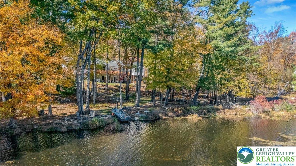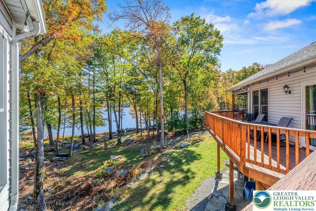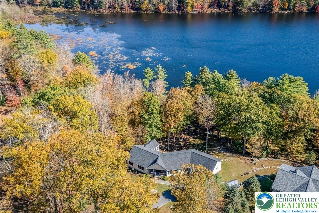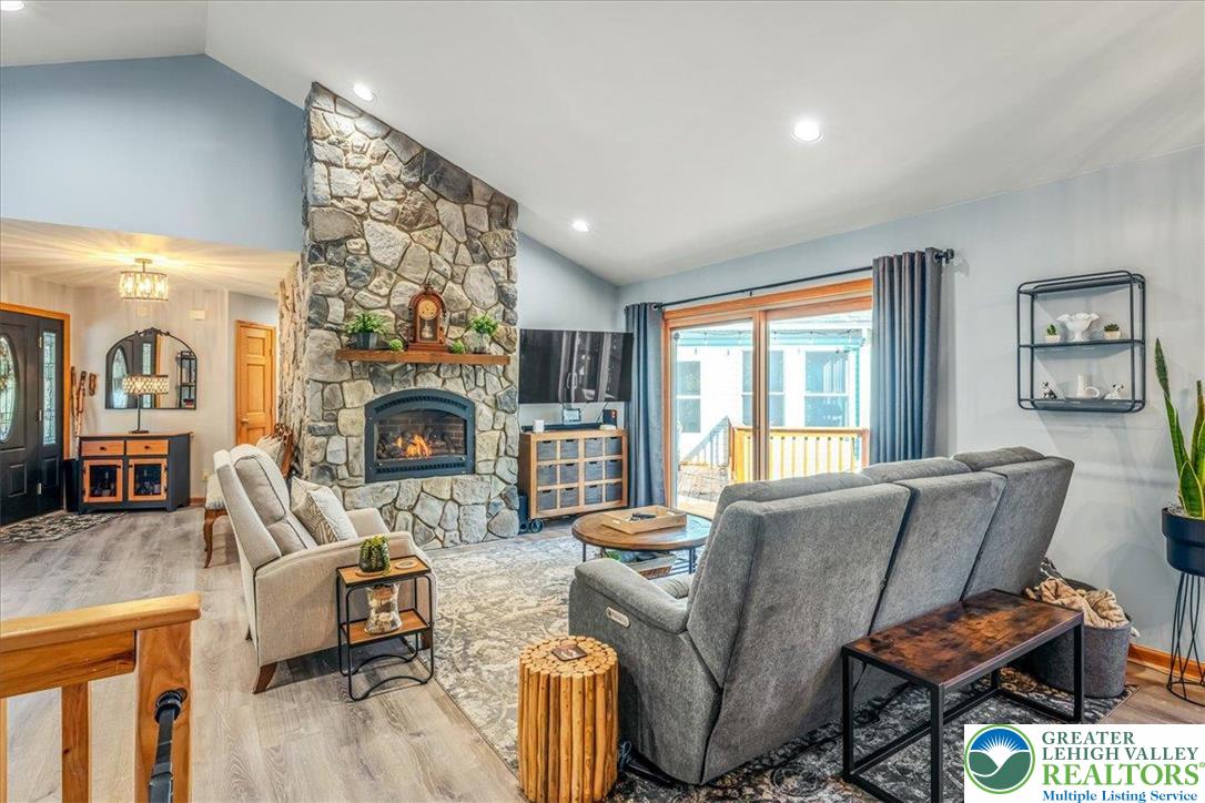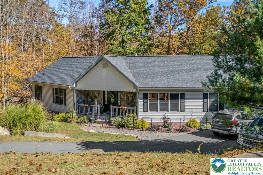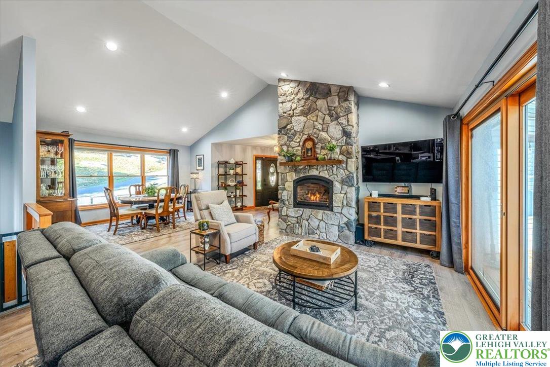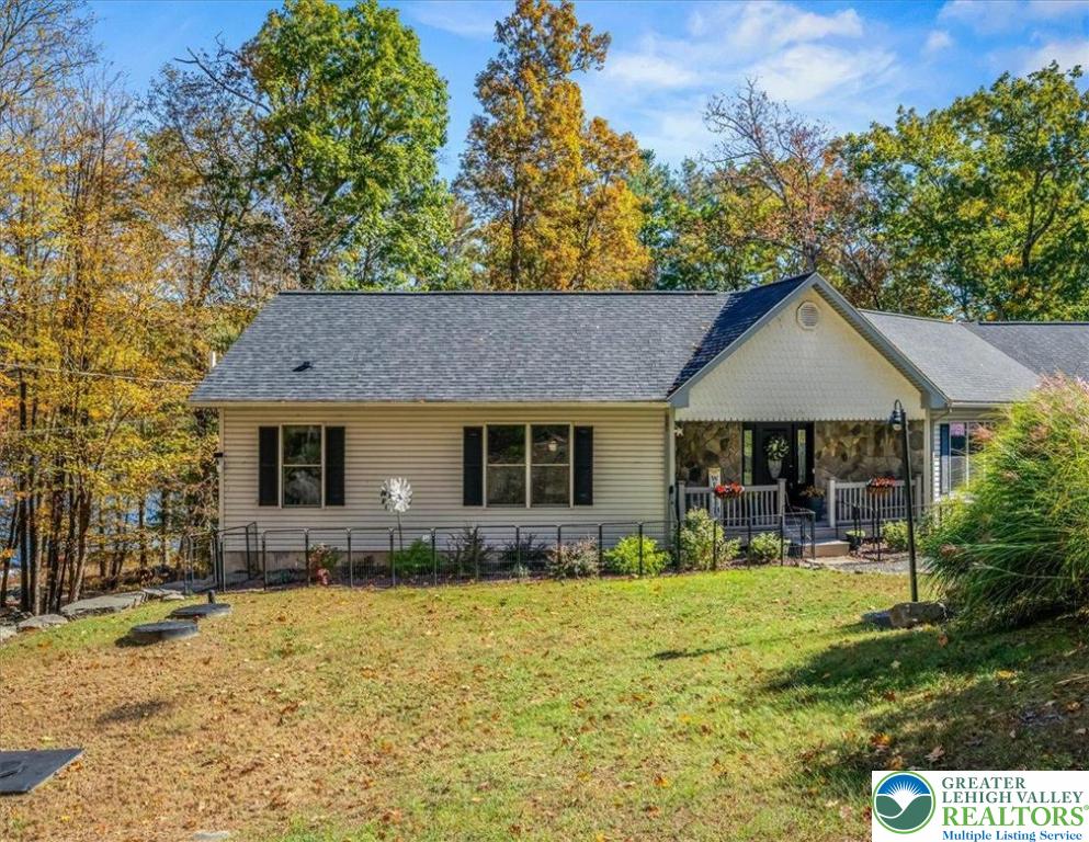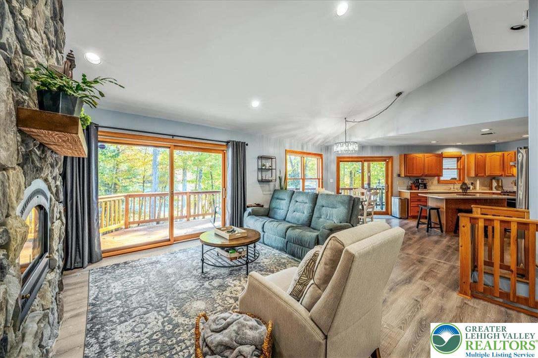 Welcome to 320 Tinkwig Drive, a beautifully maintained lakefront ranch offering four bedrooms and three baths in a peaceful wooded setting. This property blends comfort and style with direct lake access and serene water views throughout. The main level features an open-concept design with vaulted ceilings, abundant natural light, and a striking floor-to-ceiling stone fireplace as the centerpiece of the living area. The kitchen includes generous cabinetry, stainless steel appliances, a center island with seating, and an adjoining dining area that opens to a spacious rear deck overlooking the lake. The private primary suite offers an ensuite bath and direct access to a charming sunroom, a warm and inviting space to relax and take in the wooded and lake views. The fully finished walkout lower level provides a large family room with built-in shelving, a kegerator, full-sized refrigerator, and direct access to the covered patio and backyard. Additional upgrades include an on-demand water heater, soothing hot tub, and a whole house generator for peace of mind. The gently sloped lot leads to your own private lakefront with a small launch area, perfect for kayaking, fishing, or simply enjoying the tranquil setting. Located just minutes from Lake Wallenpaupack, this home is ideal as a full-time residence, vacation getaway, or investment property. Short-term rentals are permitted--schedule your private tour today!