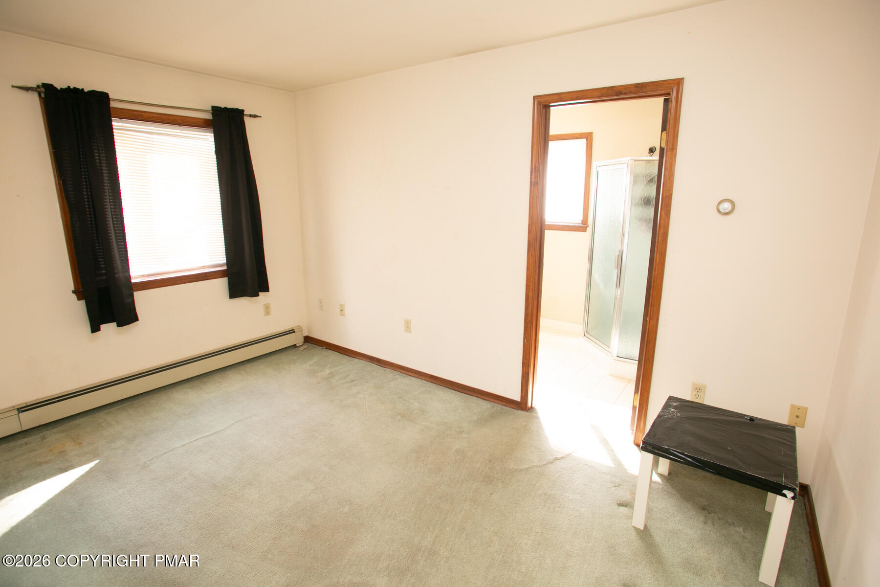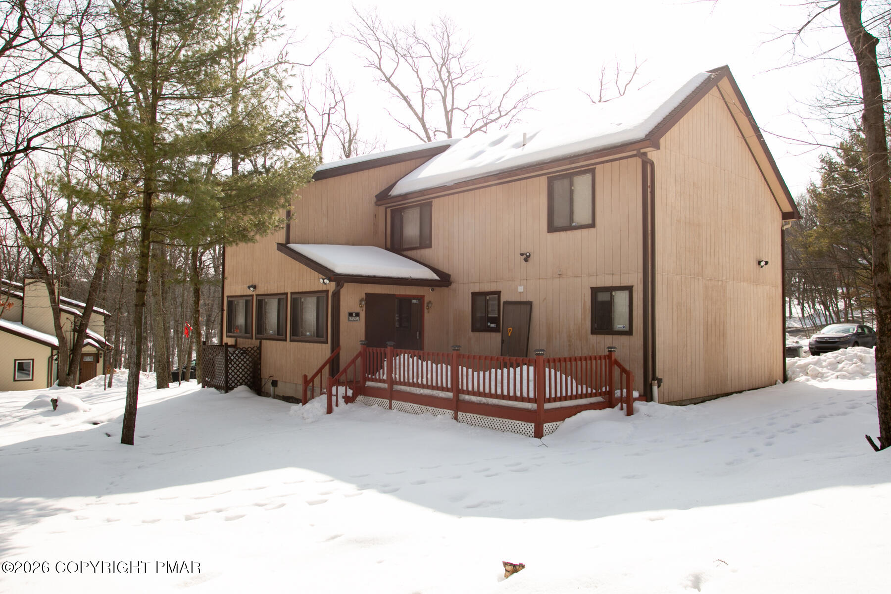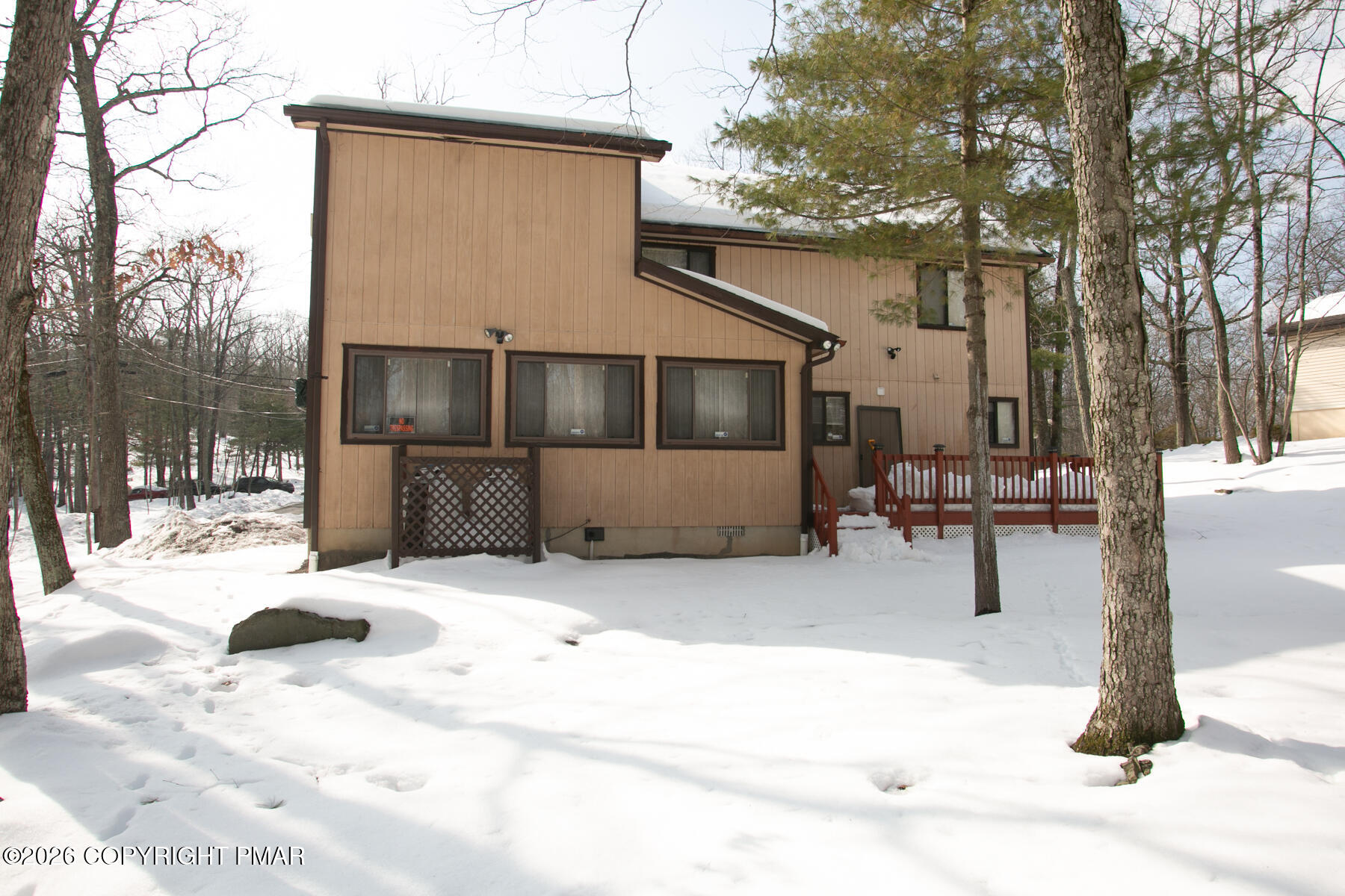 Four bedroom, 3 full bath contemporary home in the Stroud Township section of Penn Estates. Ask your realtor why that could be an advantage. With a bit of TLC, this home will shine. Sitting on top of the hill there is excellent sunlight and a lovely forested back yard. A circular driveway makes parking easy. There's a spacious four season room and a nice deck for grilling and chilling. There's a full bathroom and bedroom on the first floor for your convenience, plus two full baths on the second floor. Lots of natural light and a beautiful, wood burning brick fireplace in the living room. Only 10 minutes to drive to downtown for entertainment, medical, shopping, restaurants. There's even a convenient shop in the community!