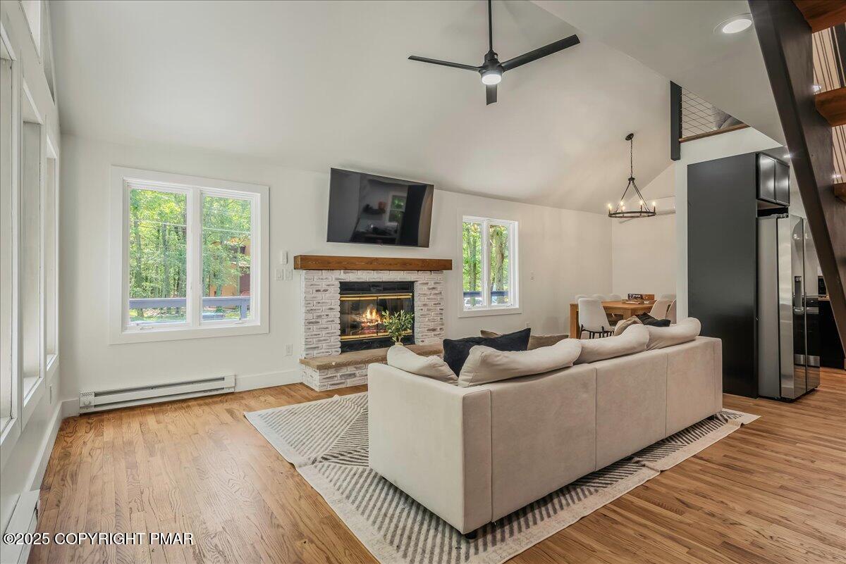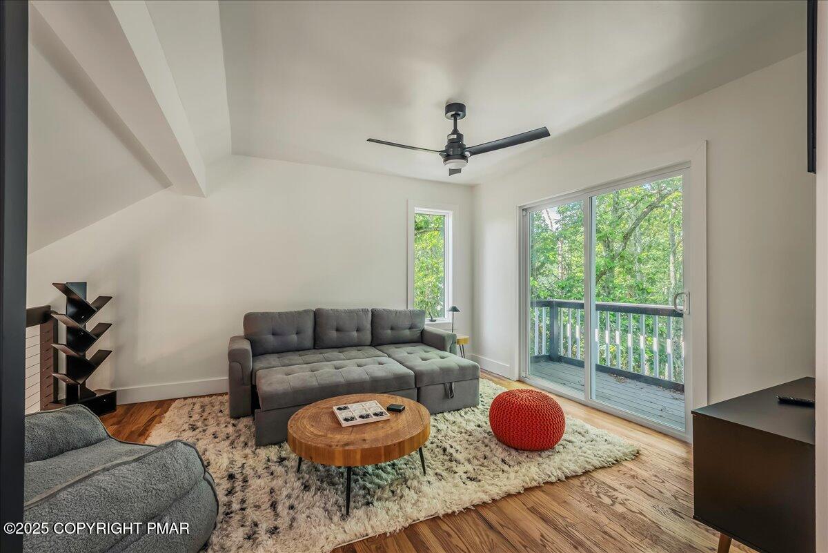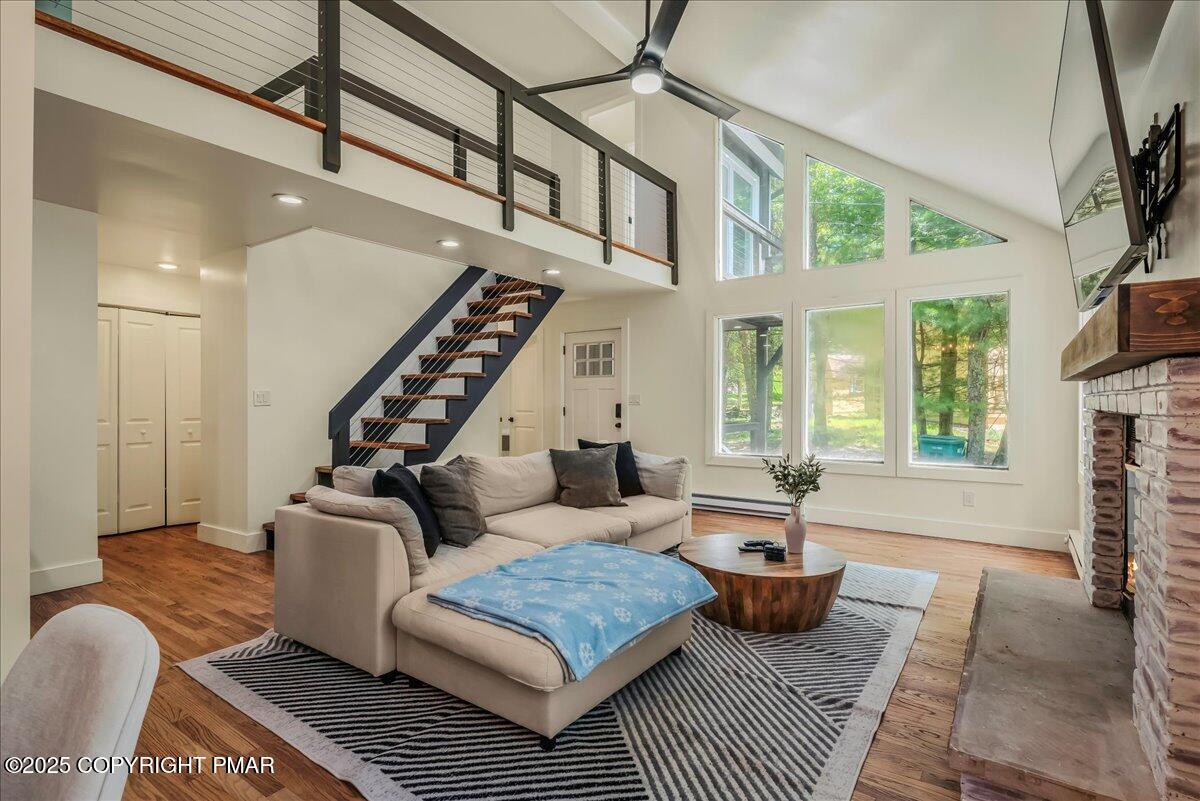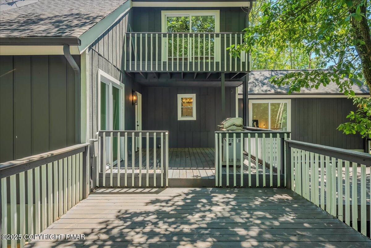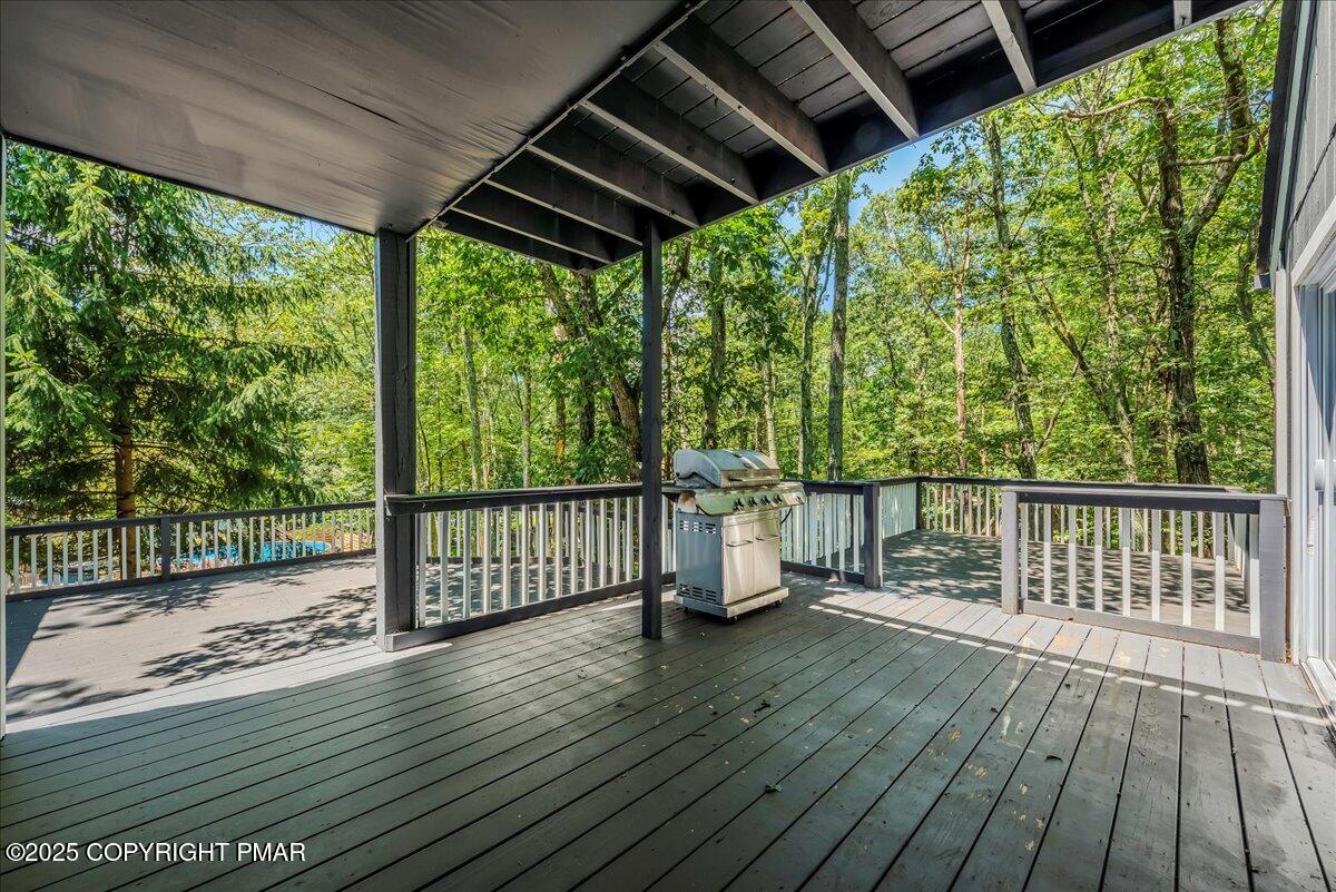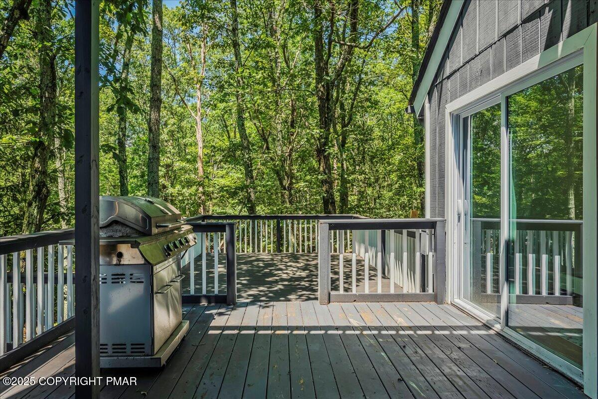 The spacious living room boasts vaulted ceilings and a cozy fireplace, while sliders open to an expansive wraparound deck ideal for grilling, relaxing, and soaking in the wooded surroundings. Bedrooms are generously sized, with multiple suites for comfort and privacy. Baths have been thoughtfully updated, including a stunning dual-shower spa retreat.