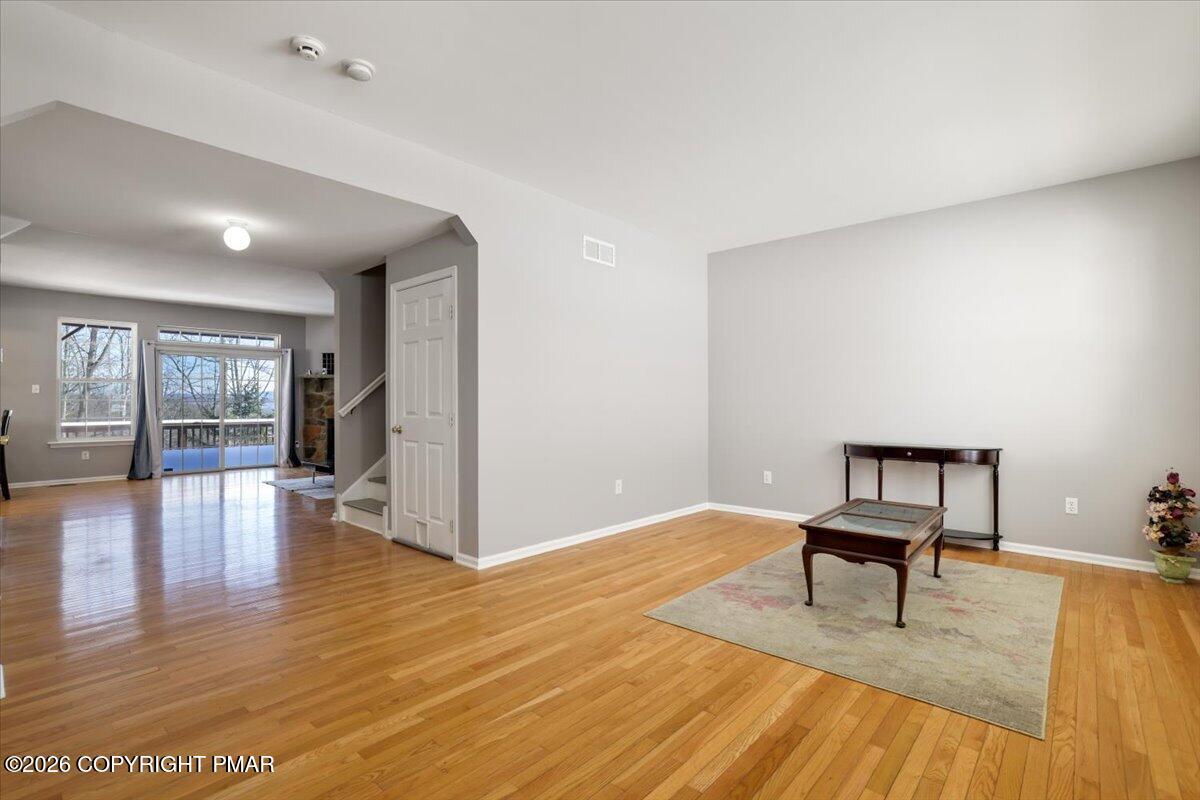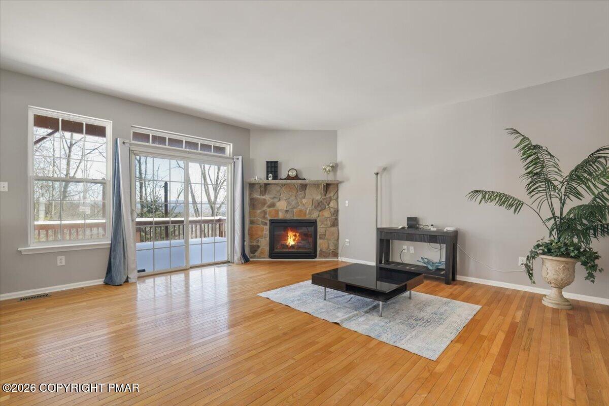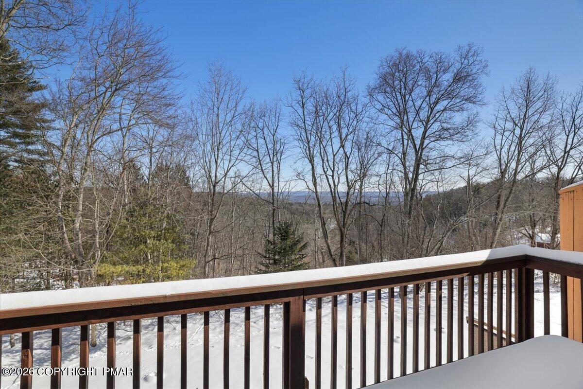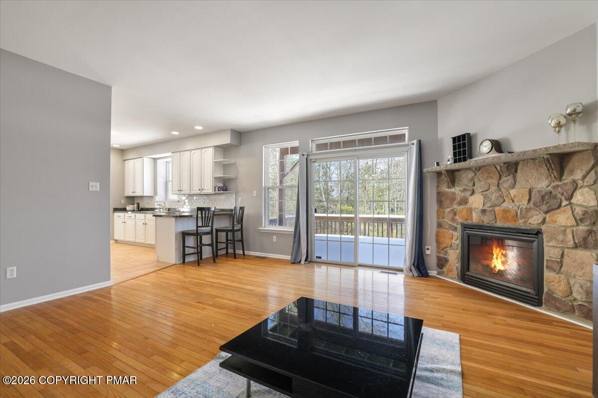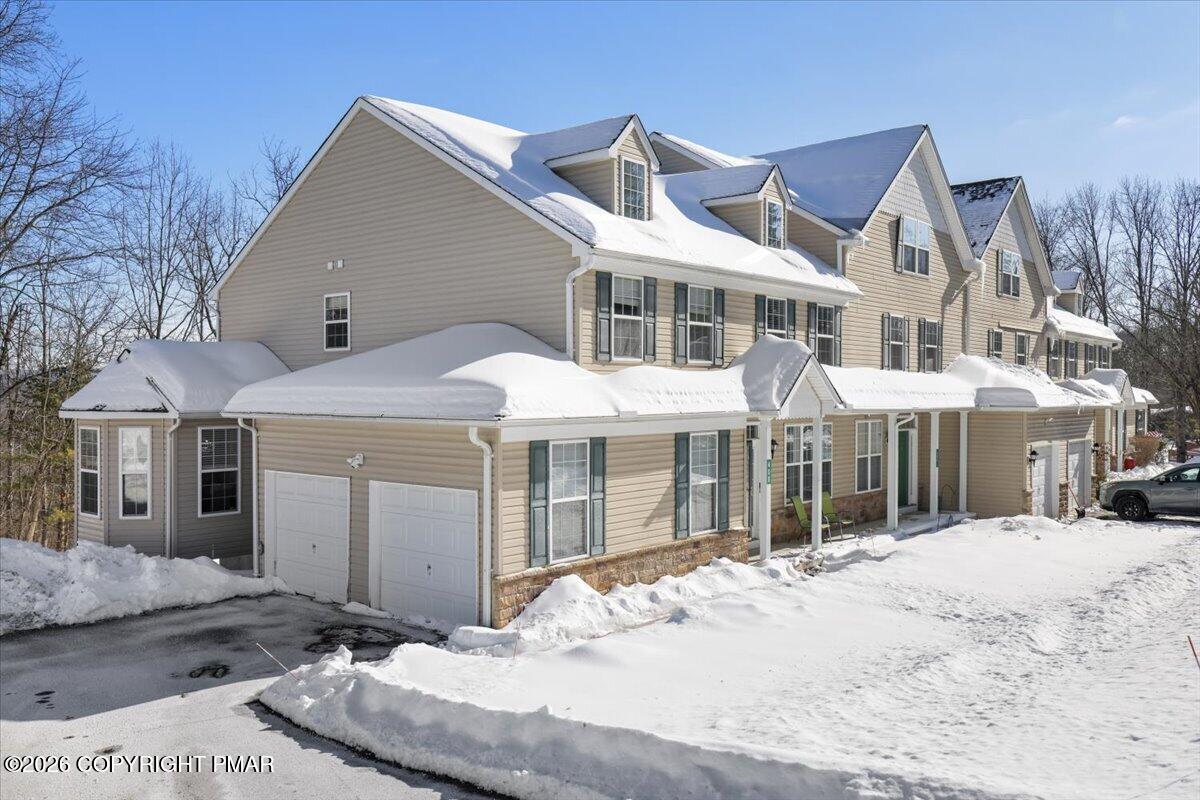 Spanning over 3,000 square feet across three finished levels, this Stroudsburg School District townhouse provides the scale of a single-family home with the convenience of a rental. The main floor is defined by 9-foot ceilings and hardwood floors, utilizing a semi-open layout that creates distinct yet connected spaces. The kitchen is designed with extensive cabinet and counter space, flowing naturally into a bright dining area. The living room features a stone fireplace as its focal point and provides direct access to a private outdoor deck, ideal for extending the living space outside. The upper level houses the primary suite, which includes a private en-suite bathroom, a walk-in closet, and its own balcony. The secondary bedrooms are well-sized, offering practical space for furniture and storage. A fully finished walk-out basement adds significant square footage, providing a versatile area for a home office, fitness studio, or secondary living room. Practical exterior features include an attached garage and multiple outdoor decks for seating and dining. The community offers resident-only amenities, including an outdoor pool, tennis courts, and a lake. Situated minutes from major commuter routes, local shopping centers, and dining, this property offers a low-maintenance lifestyle in a prime Poconos location. This home delivers a functional, multi-level layout without the overhead of exterior property maintenance. Do not delay - schedule your tour today!