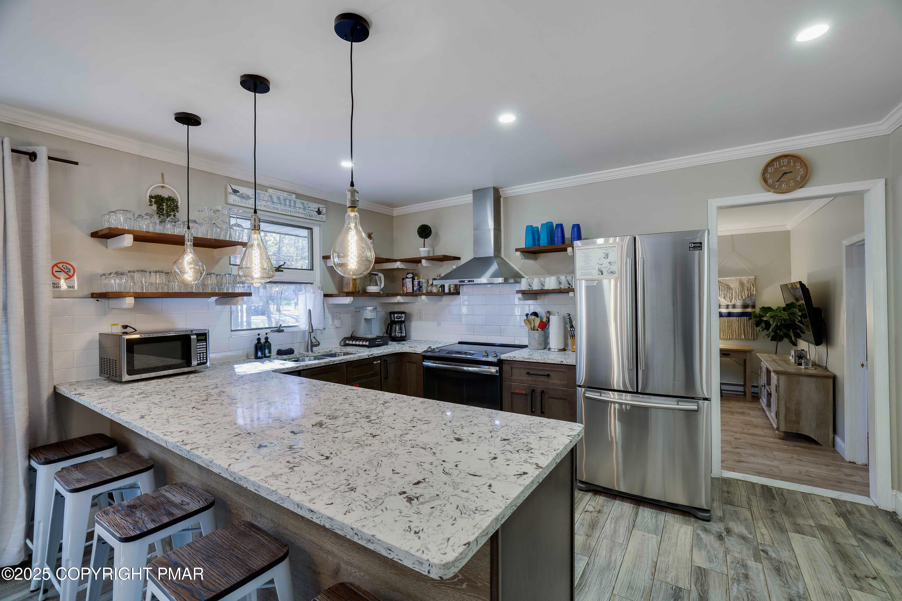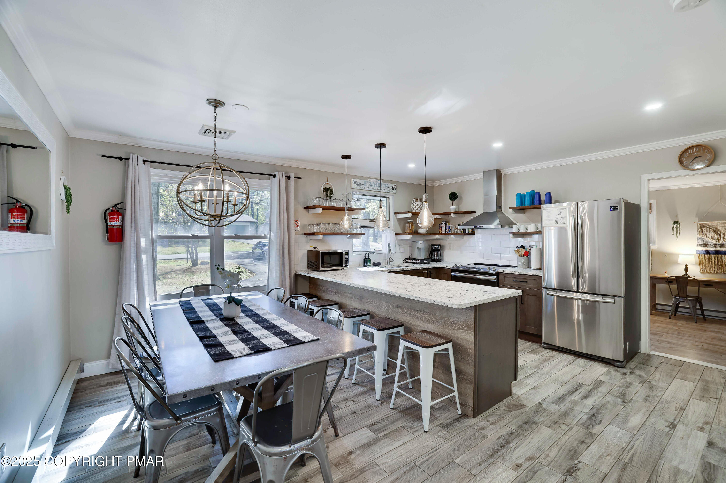 As you enter, you'll be captivated by the first of three welcoming living spaces, perfect for relaxing or entertaining guests. The beautifully updated eat-in kitchen serves as the heart of the home, featuring plenty of room for a large dining table and a chic breakfast bar with seating for 5-6 barstools, ideal for both casual and formal dining experiences.