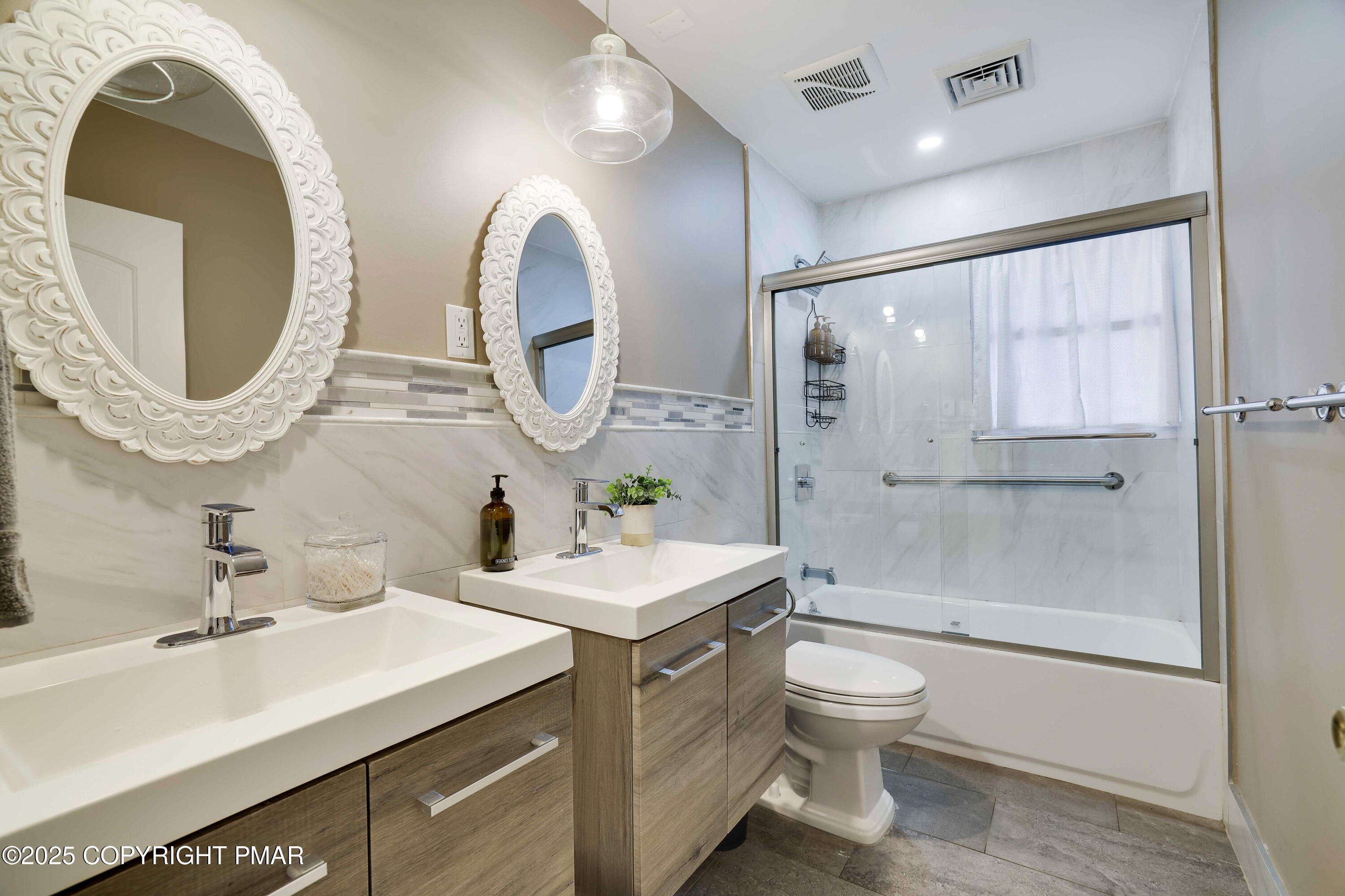 This home features two sizable primary bedrooms, each crafted as a serene retreat. The bathrooms have been thoughtfully updated with modern fixtures and elegant tiling, delivering a spa-like atmosphere that enhances the home's luxurious feel.
