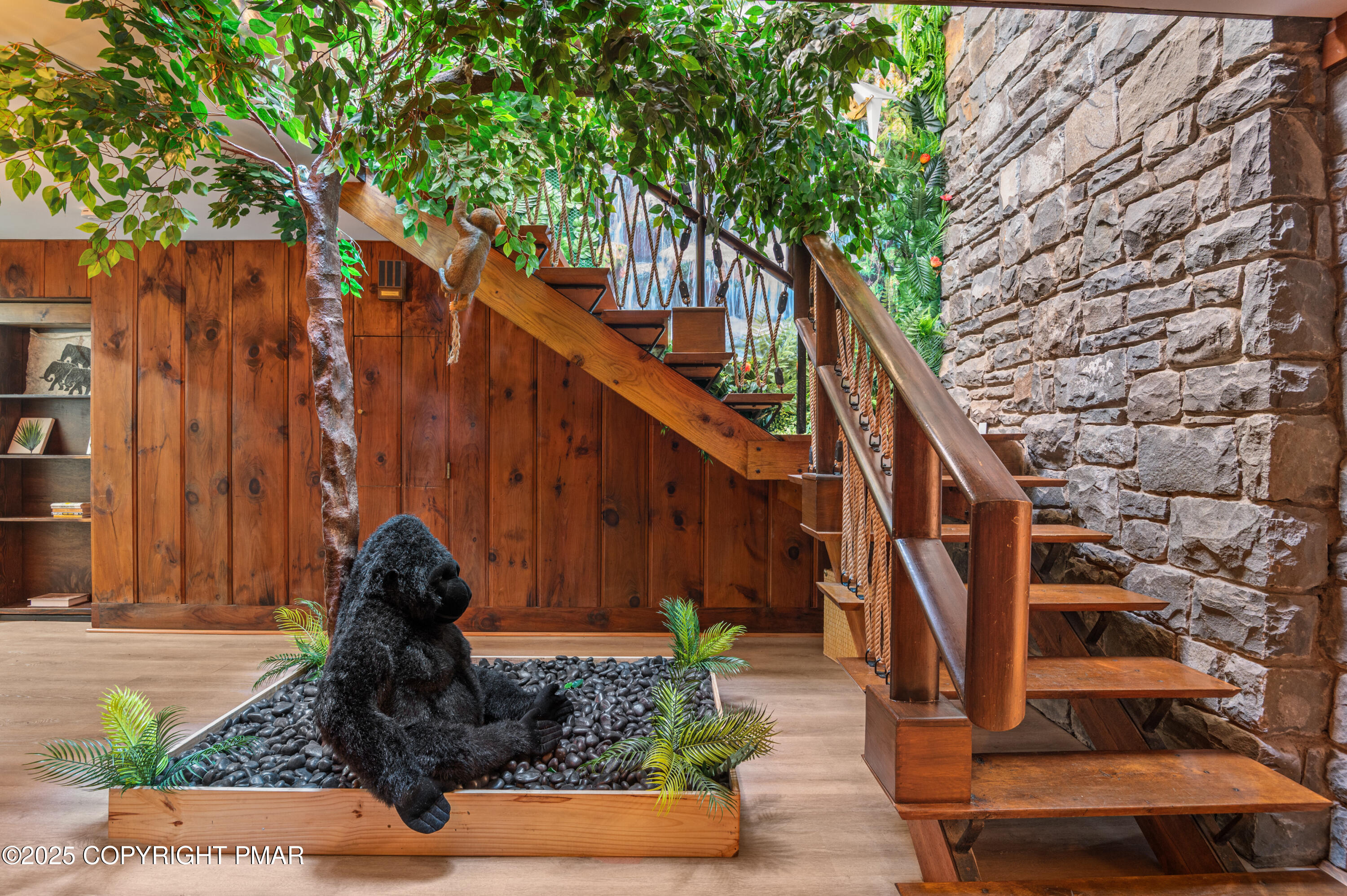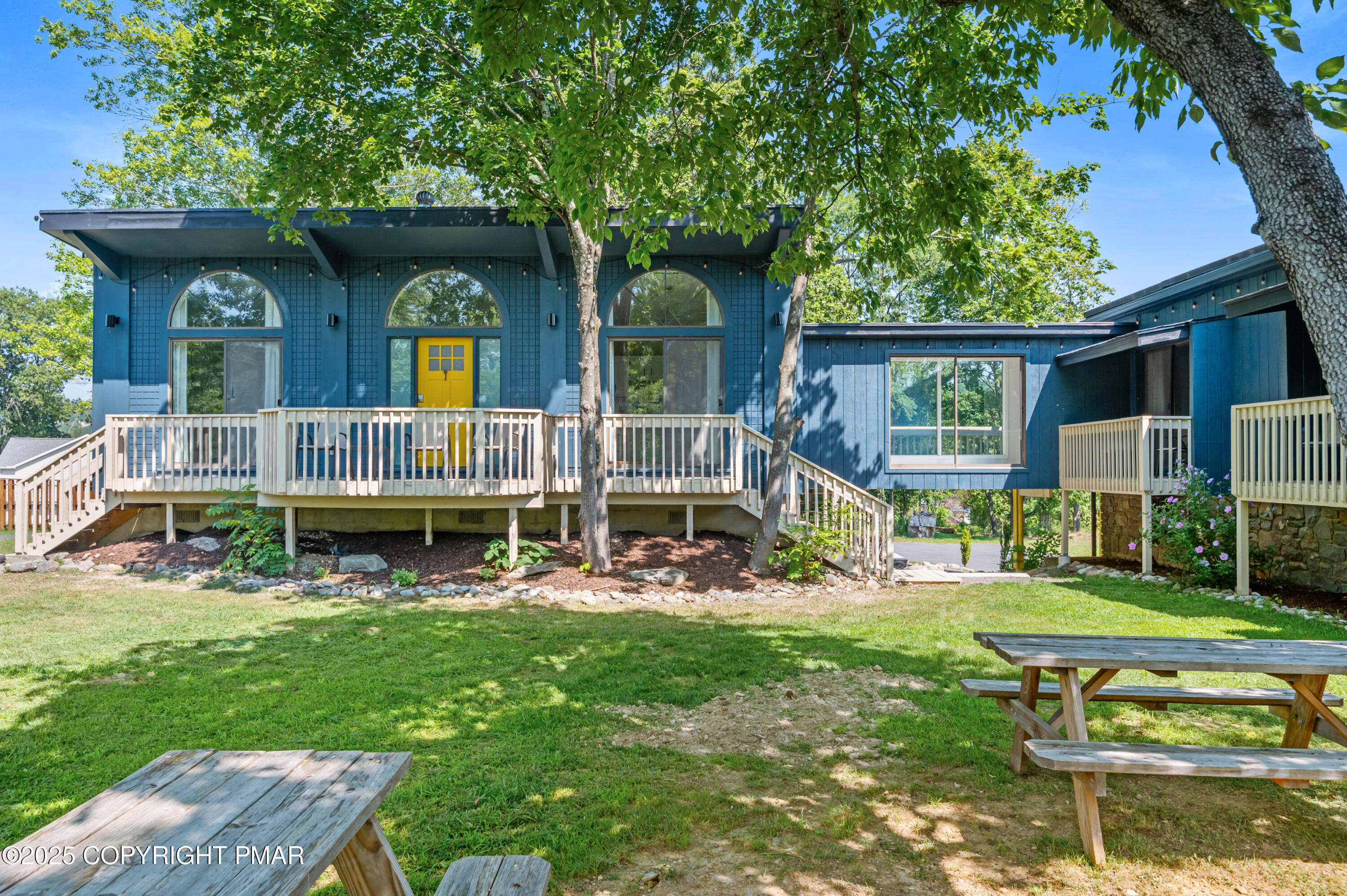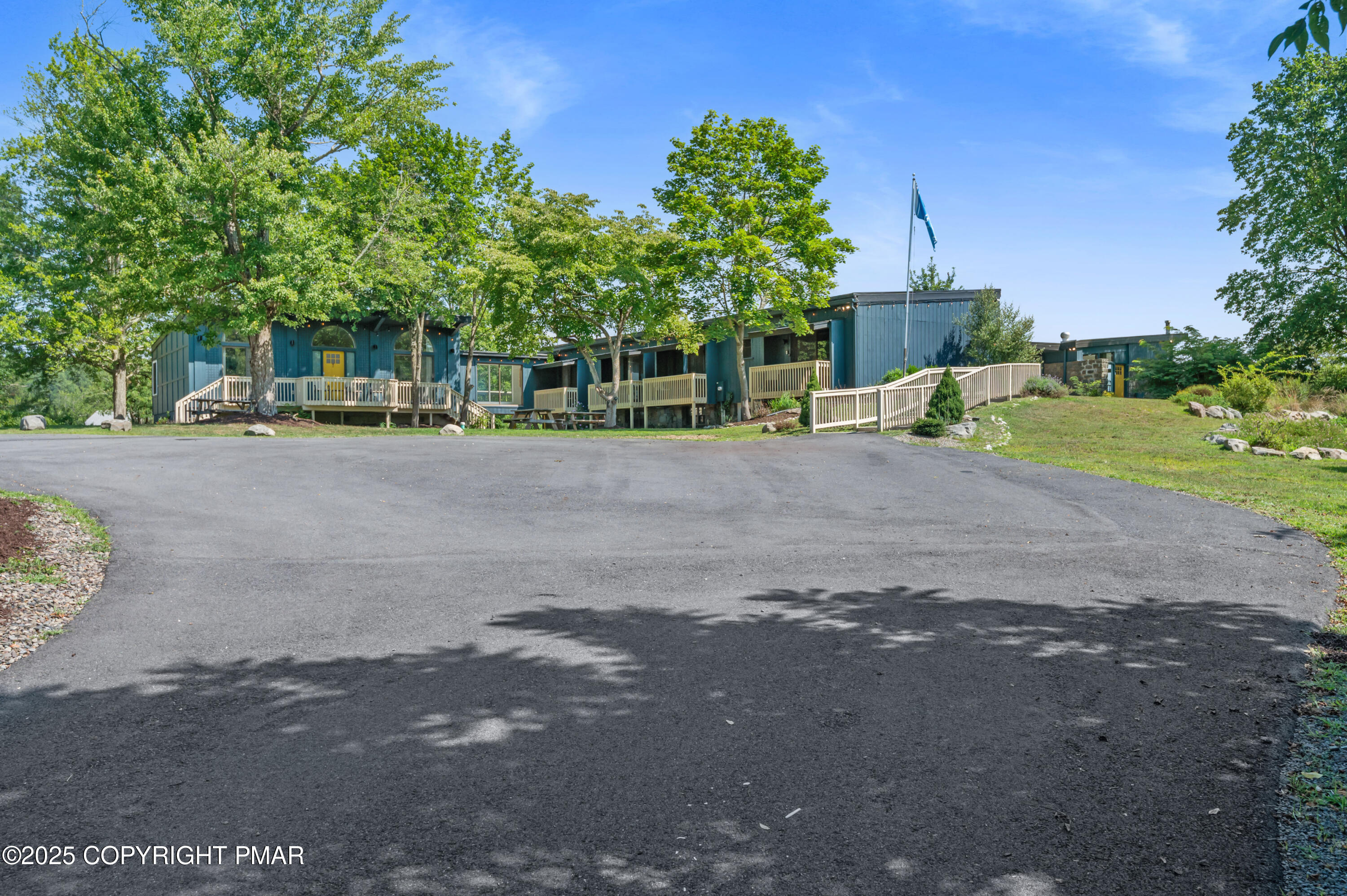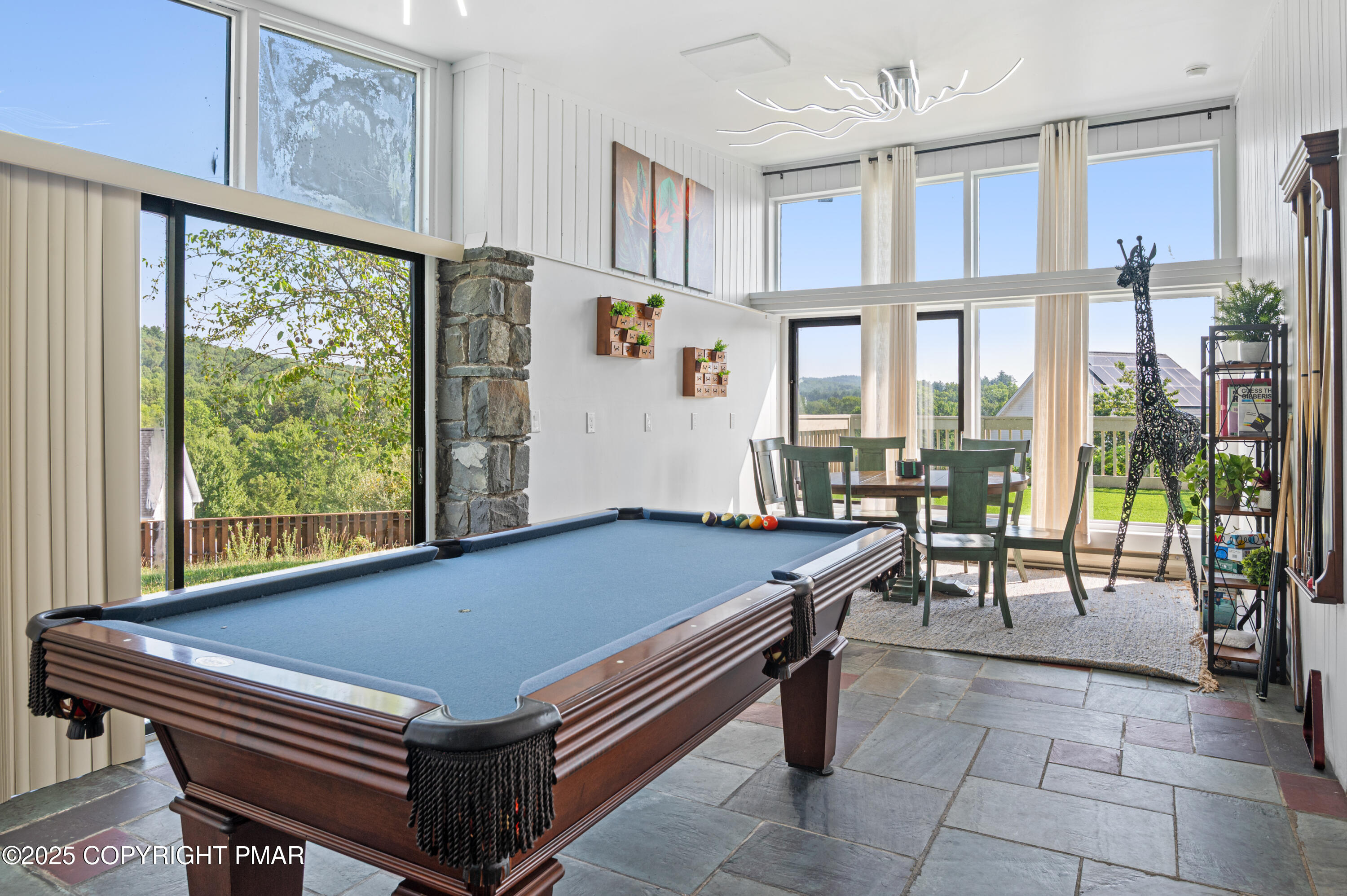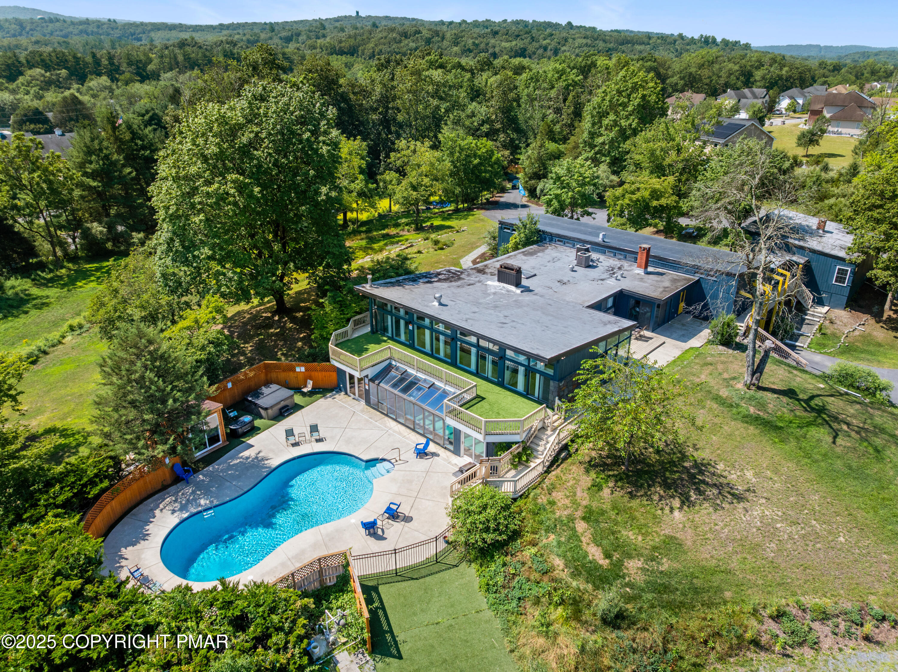 Welcome to paradise! Discover a premier Poconos destination with this extraordinary home, boasting nearly 10,000 square feet of luxurious living space on a sprawling 3.7-acre lot. This magnificent property features its own private pond and ample space to create your dream landscape while enjoying the privacy that it has to offer. This home is an architectural masterpiece with lofty ceilings, expansive walls of windows showcasing the views, and a chic mid-century modern design enhanced with unique touches by the current owners. As an active vacation rental, it generates significant income and holds immense potential for the right operator. Or, make this spectacular home your own private retreat. Need a pool? How about two of them!--an outdoor pool for seasonal enjoyment and an indoor pool for year-round relaxation. Additionally, the home includes a sauna, hot tub, and cold plunge for the ultimate spa experience. Upon entering the spacious foyer, you'll be greeted by a lush wall of jungle-themed greenery, a design element that flows throughout the home. The main living area features floor-to-ceiling windows overlooking the outdoor deck and pool area, a cozy fireplace, ample seating, and a unique epoxy table. The main floor also includes two game rooms and a charming breakfast area, which is next to the contemporary kitchen which is fully equipped to meet all your culinary needs. The main level hosts five uniquely themed bedrooms, each with its own in-room seating area and rich design themes including the ''Tiger Room'' and ''Peacock Room,''the reasons for these names being evident as you tour the home. Three of these bedrooms also feature private balconies. A separate guest suite, accessible via a delightful walkway, offers a more traditional design with its own full kitchen, lofted living space, two spacious bedrooms, and a full bath, functioning as a complete home within the home. The lower level adds to the home's appeal with a large custom bunkroom, laundry facilities with three sets of washers and dryers, a second spacious living area with a fireplace, a full bath adjacent to the indoor pool area, and a unique mystery room. Utility rooms, abundant storage, and garage space complete this level. Situated just 1.5 hours from NYC and a short drive from many premier Poconos destinations including Kalahari Waterpark, Camelback & Shawnee Ski areas, Bushkill Falls, and many more, this home offers endless entertainment options. Shopping, dining, and golf are also within minutes. With so much to do, you might never want to leave this paradise! Don't miss the chance to own this piece of Poconos paradisecome takethe tour and experience it for yourself!