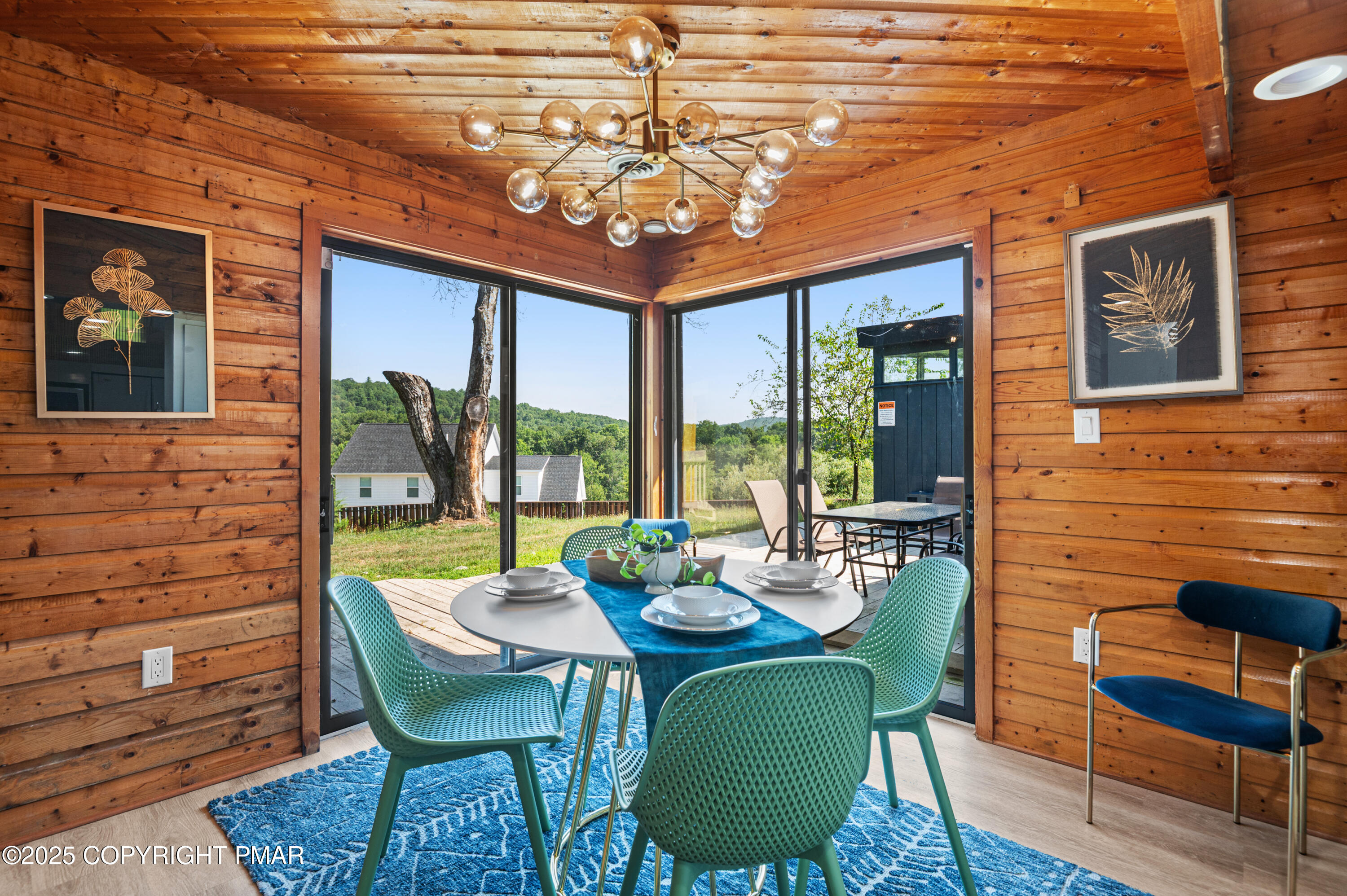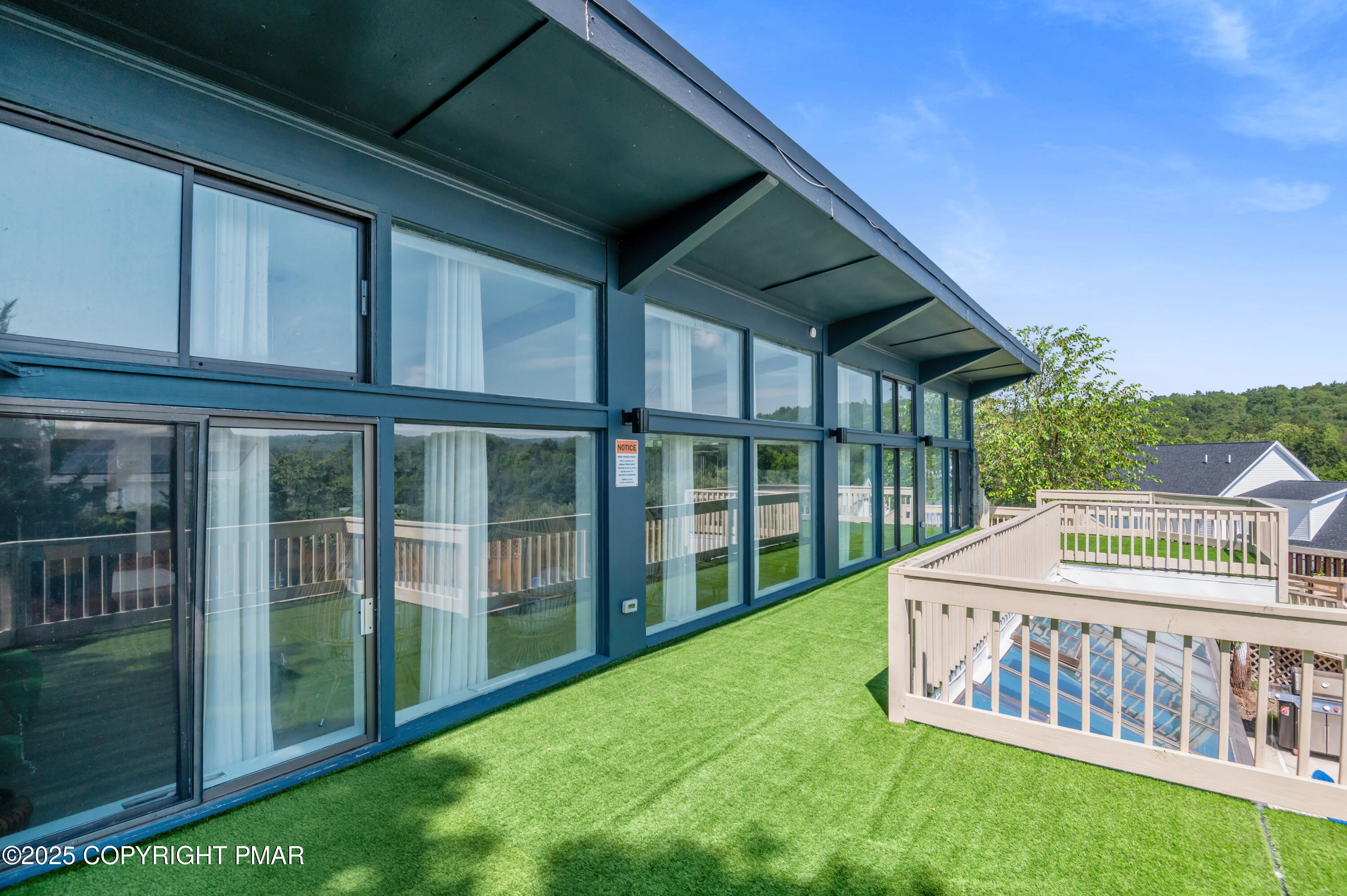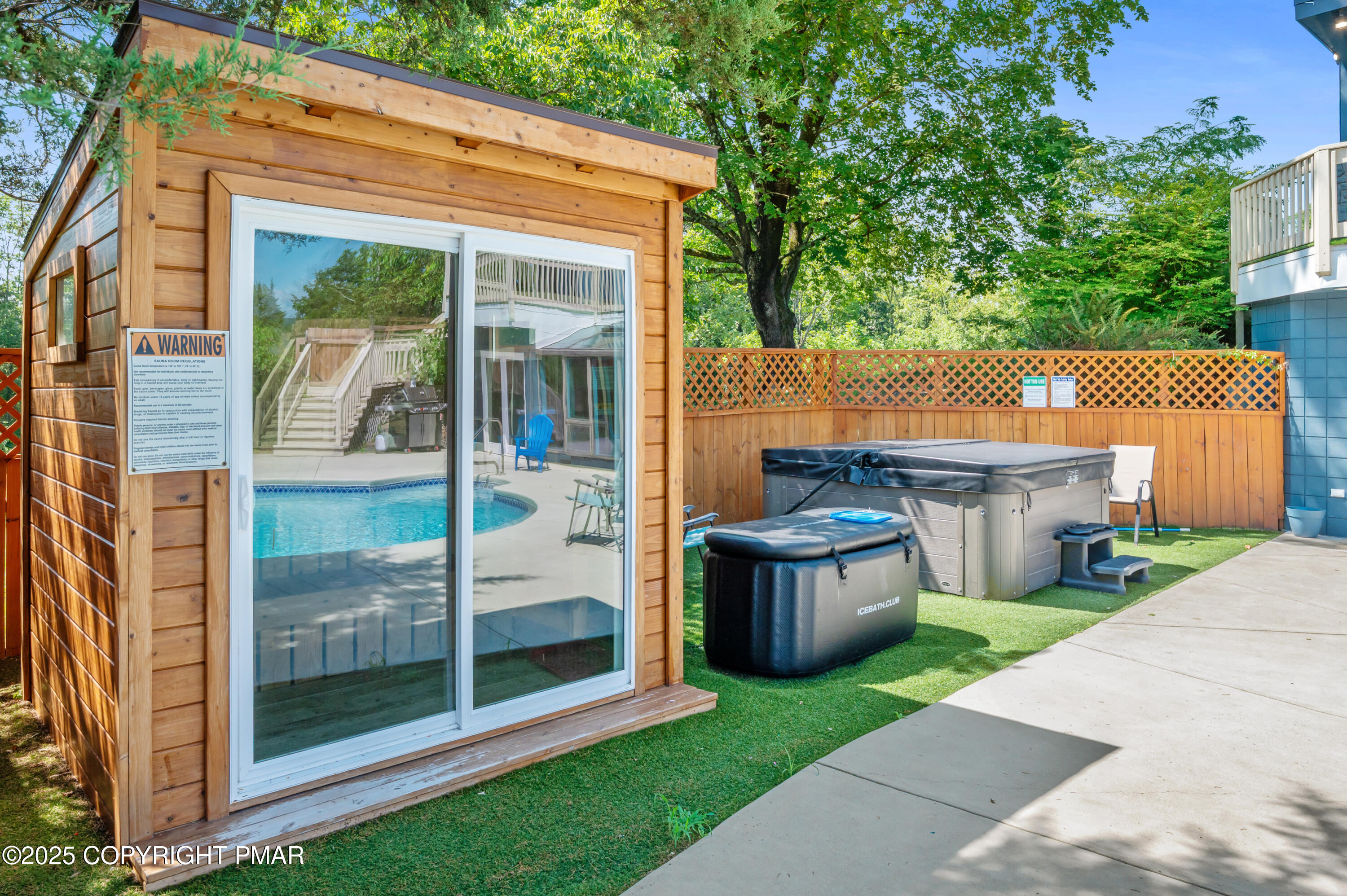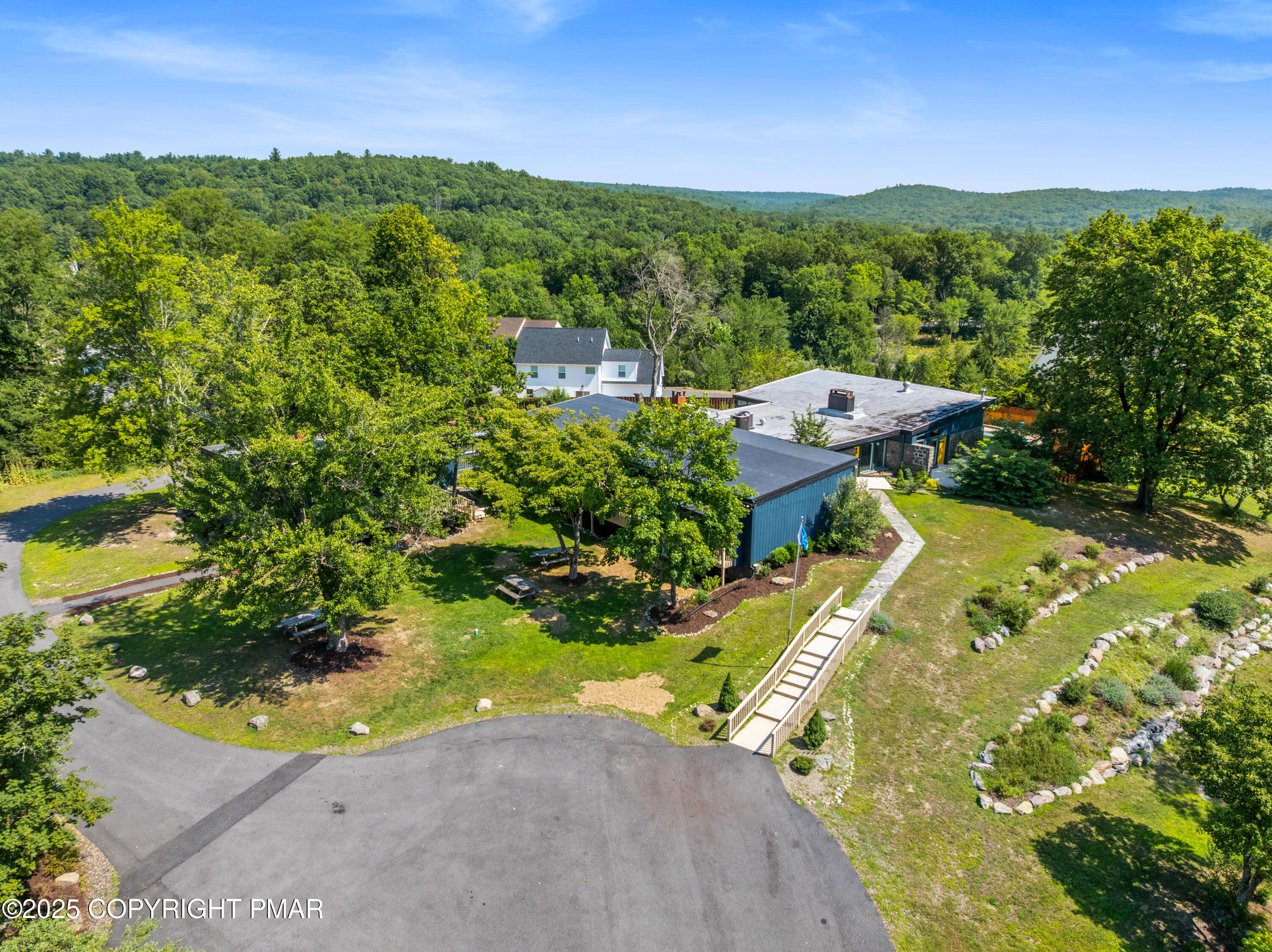 Welcome to paradise! Discover a premier Poconos destination with this extraordinary home, boasting nearly 10,000 square feet of luxurious living space on a sprawling 3.7-acre lot. This magnificent property features its own private pond and ample space to create your dream landscape while enjoying the privacy that it has to offer. This home is an architectural masterpiece with lofty ceilings, expansive walls of windows showcasing the views, and a chic mid-century modern design enhanced with unique touches by the current owners. As an active vacation rental, it generates significant income and holds immense potential for the right operator. Or, make this spectacular home your own private retreat. Need a pool? How about two of them!--an outdoor pool for seasonal enjoyment and an indoor pool for year-round relaxation. Additionally, the home includes a sauna, hot tub, and cold plunge for the ultimate spa experience. Upon entering the spacious foyer, you'll be greeted by a lush wall of jungle-themed greenery, a design element that flows throughout the home. The main living area features floor-to-ceiling windows overlooking the outdoor deck and pool area, a cozy fireplace, ample seating, and a unique epoxy table. The main floor also includes two game rooms and a charming breakfast area, which is next to the contemporary kitchen which is fully equipped to meet all your culinary needs. The main level hosts five uniquely themed bedrooms, each with its own in-room seating area and rich design themes including the ''Tiger Room'' and ''Peacock Room,''the reasons for these names being evident as you tour the home. Three of these bedrooms also feature private balconies. A separate guest suite, accessible via a delightful walkway, offers a more traditional design with its own full kitchen, lofted living space, two spacious bedrooms, and a full bath, functioning as a complete home within the home. The lower level adds to the home's appeal with a large custom bunkroom, laundry facilities with three sets of washers and dryers, a second spacious living area with a fireplace, a full bath adjacent to the indoor pool area, and a unique mystery room. Utility rooms, abundant storage, and garage space complete this level. Situated just 1.5 hours from NYC and a short drive from many premier Poconos destinations including Kalahari Waterpark, Camelback & Shawnee Ski areas, Bushkill Falls, and many more, this home offers endless entertainment options. Shopping, dining, and golf are also within minutes. With so much to do, you might never want to leave this paradise! Don't miss the chance to own this piece of Poconos paradisecome takethe tour and experience it for yourself!