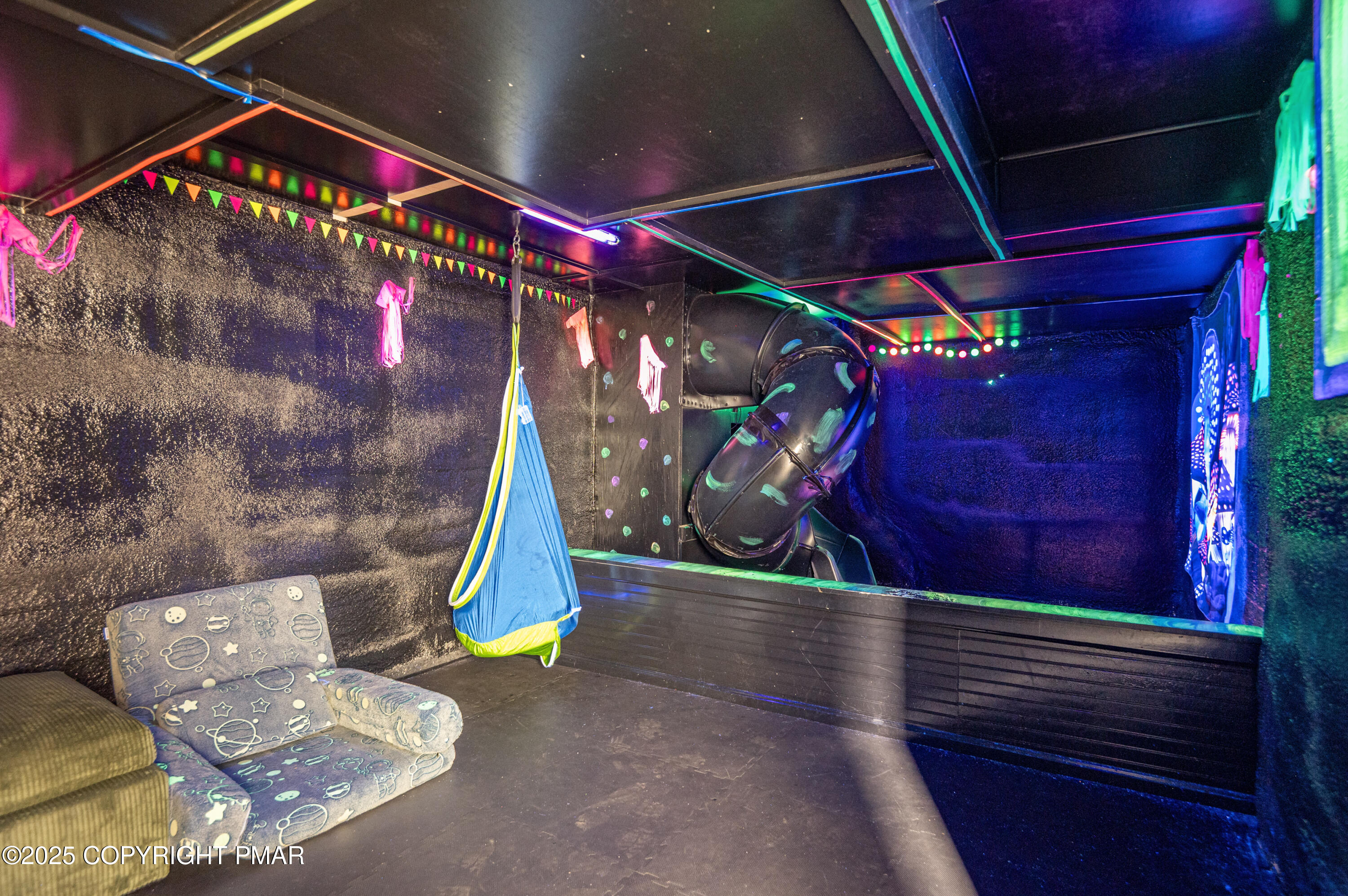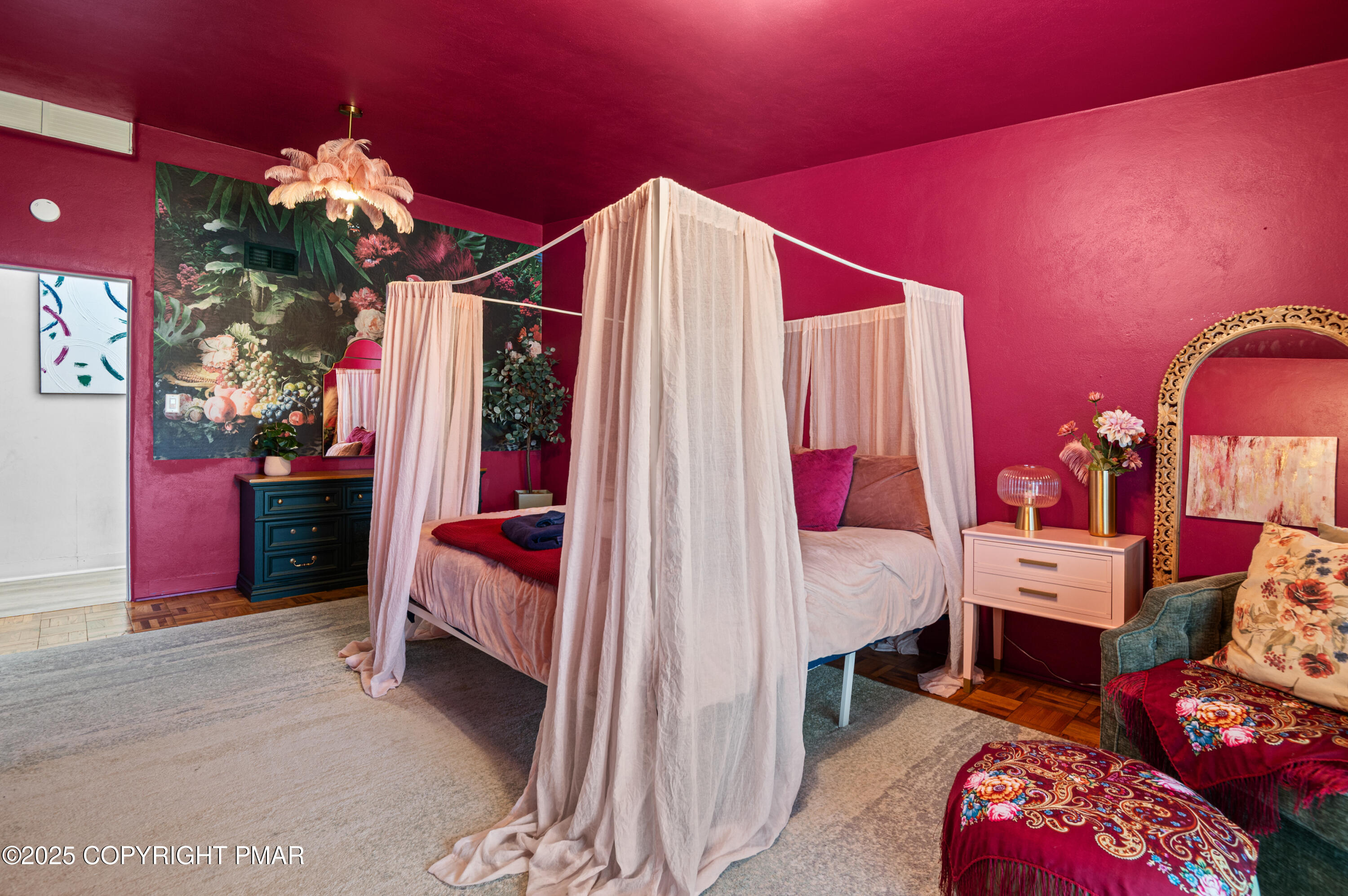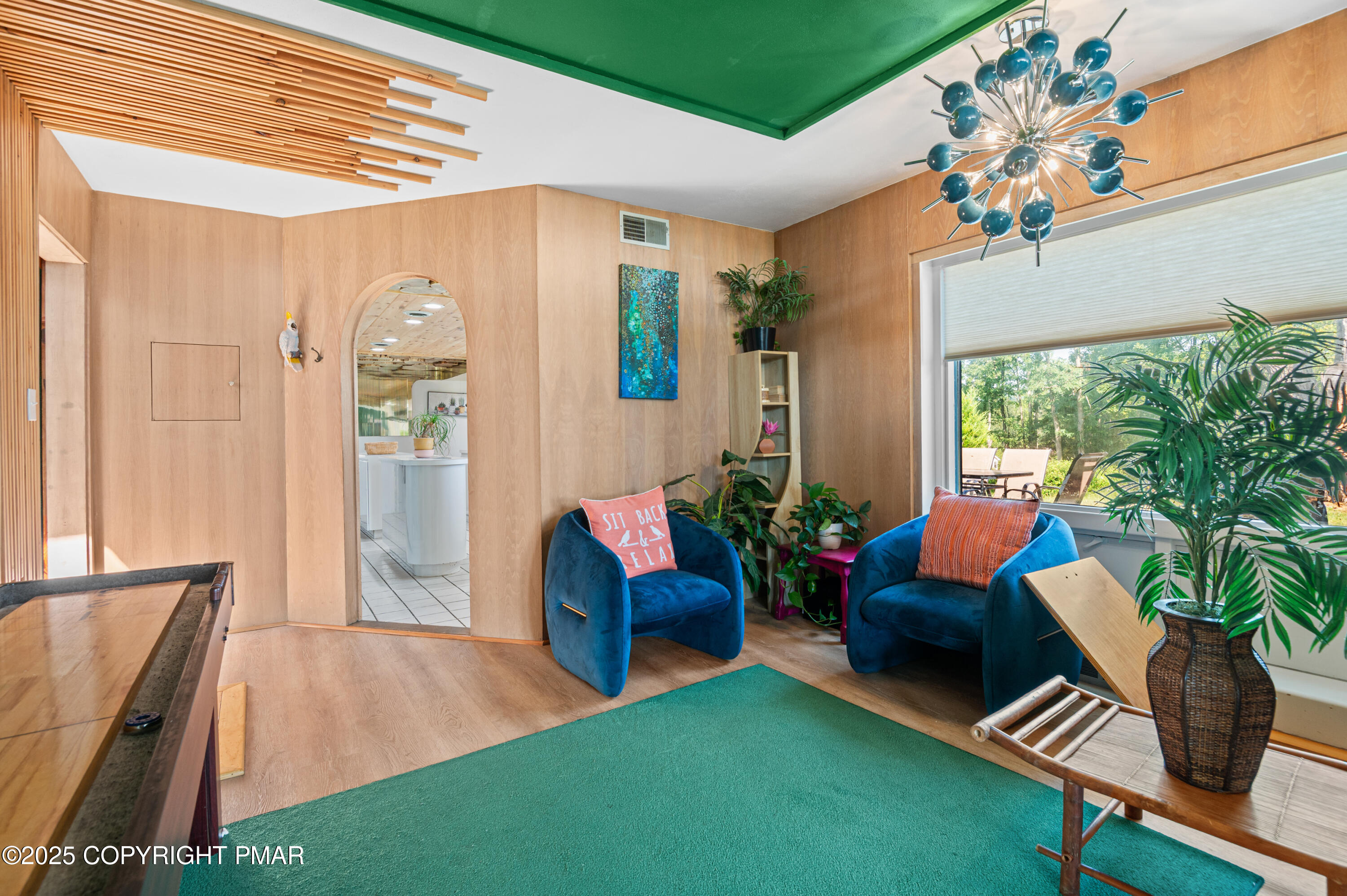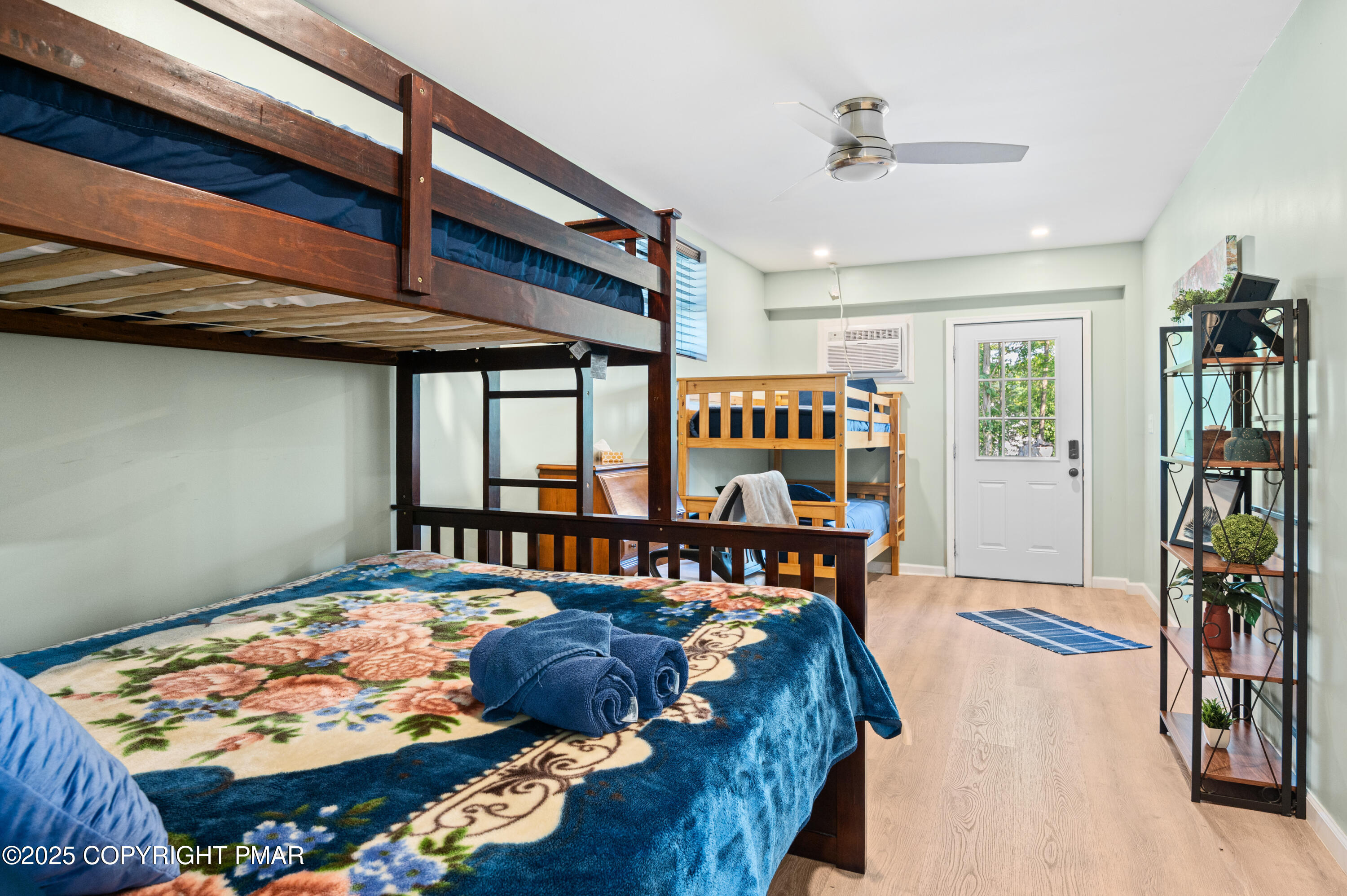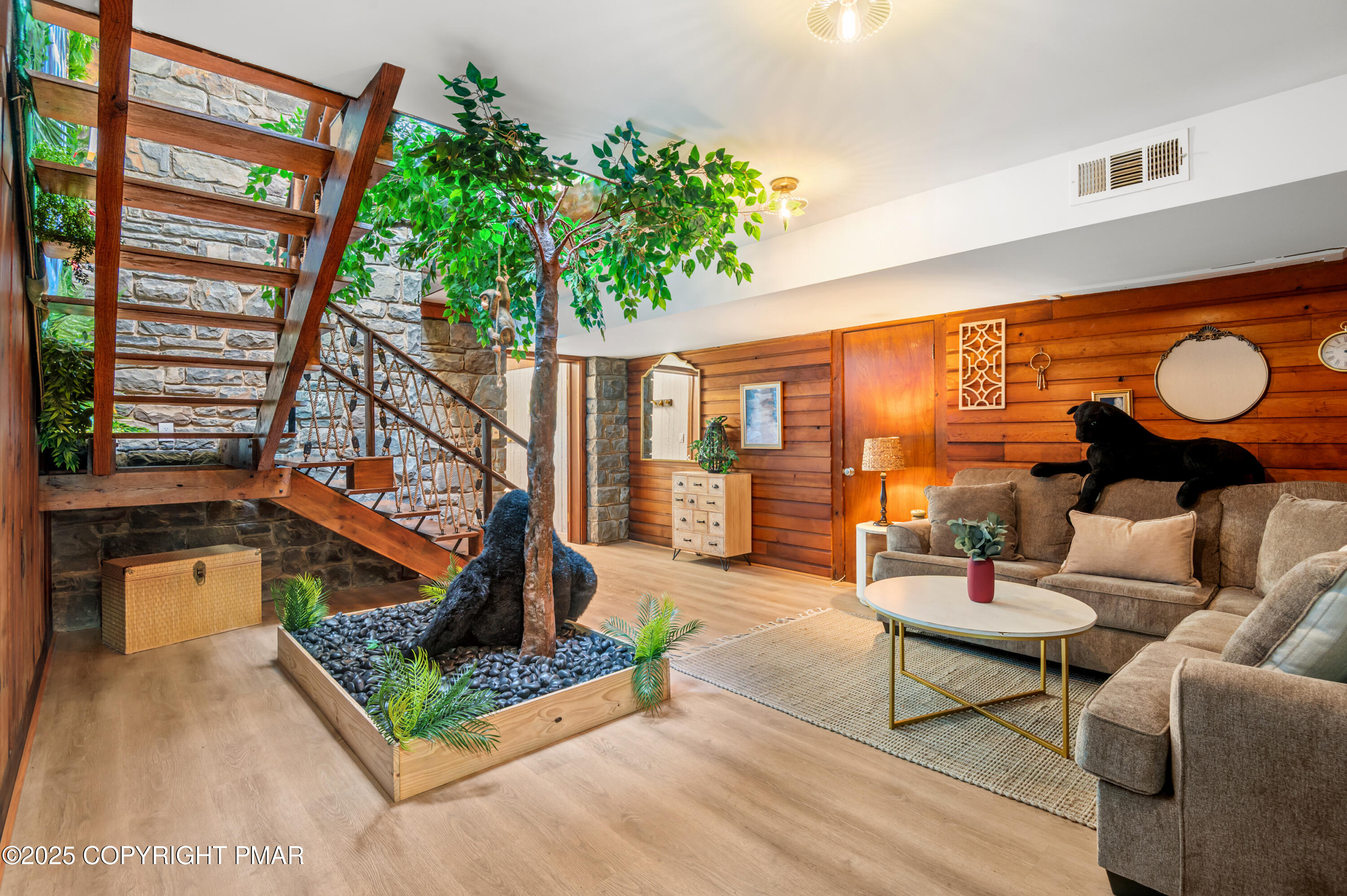 Welcome to paradise! Discover a premier Poconos destination with this extraordinary home, boasting nearly 10,000 square feet of luxurious living space on a sprawling 3.7-acre lot. This magnificent property features its own private pond and ample space to create your dream landscape while enjoying the privacy that it has to offer. This home is an architectural masterpiece with lofty ceilings, expansive walls of windows showcasing the views, and a chic mid-century modern design enhanced with unique touches by the current owners. As an active vacation rental, it generates significant income and holds immense potential for the right operator. Or, make this spectacular home your own private retreat. Need a pool? How about two of them!--an outdoor pool for seasonal enjoyment and an indoor pool for year-round relaxation. Additionally, the home includes a sauna, hot tub, and cold plunge for the ultimate spa experience. Upon entering the spacious foyer, you'll be greeted by a lush wall of jungle-themed greenery, a design element that flows throughout the home. The main living area features floor-to-ceiling windows overlooking the outdoor deck and pool area, a cozy fireplace, ample seating, and a unique epoxy table. The main floor also includes two game rooms and a charming breakfast area, which is next to the contemporary kitchen which is fully equipped to meet all your culinary needs. The main level hosts five uniquely themed bedrooms, each with its own in-room seating area and rich design themes including the ''Tiger Room'' and ''Peacock Room,''the reasons for these names being evident as you tour the home. Three of these bedrooms also feature private balconies. A separate guest suite, accessible via a delightful walkway, offers a more traditional design with its own full kitchen, lofted living space, two spacious bedrooms, and a full bath, functioning as a complete home within the home. The lower level adds to the home's appeal with a large custom bunkroom, laundry facilities with three sets of washers and dryers, a second spacious living area with a fireplace, a full bath adjacent to the indoor pool area, and a unique mystery room. Utility rooms, abundant storage, and garage space complete this level. Situated just 1.5 hours from NYC and a short drive from many premier Poconos destinations including Kalahari Waterpark, Camelback & Shawnee Ski areas, Bushkill Falls, and many more, this home offers endless entertainment options. Shopping, dining, and golf are also within minutes. With so much to do, you might never want to leave this paradise! Don't miss the chance to own this piece of Poconos paradisecome takethe tour and experience it for yourself!