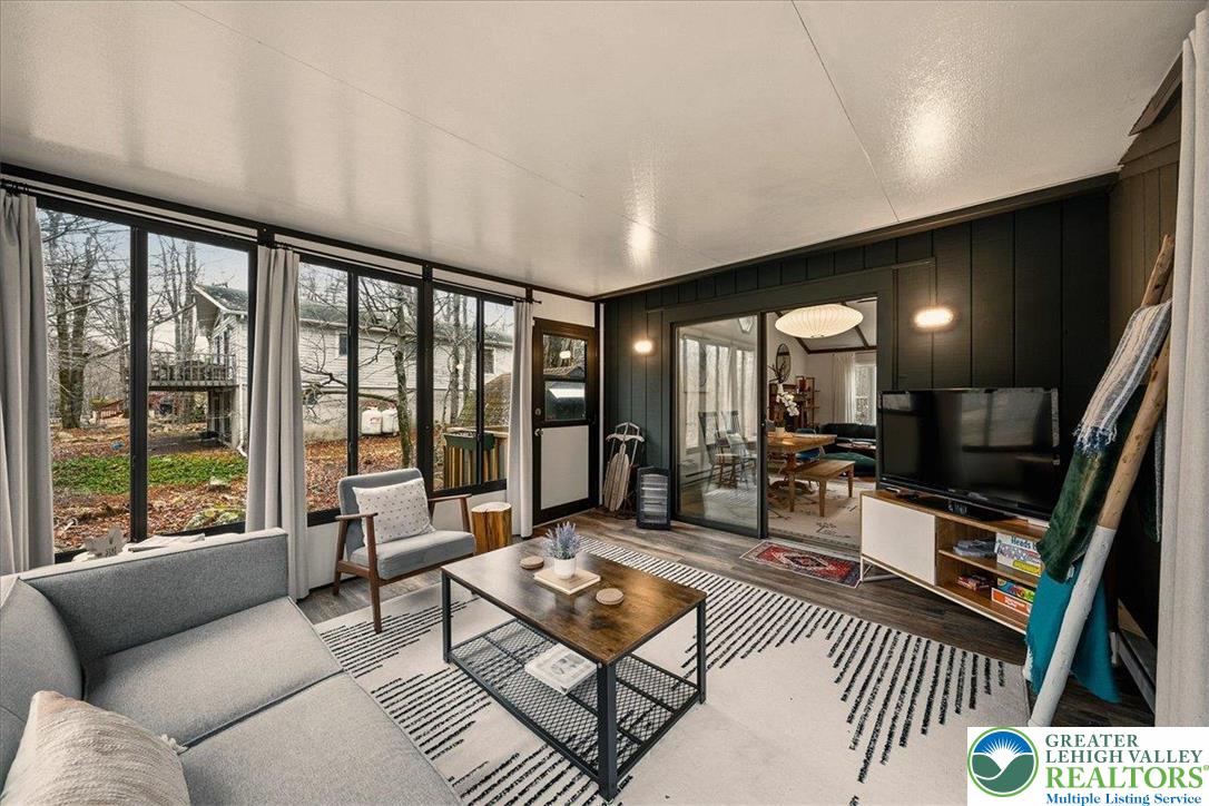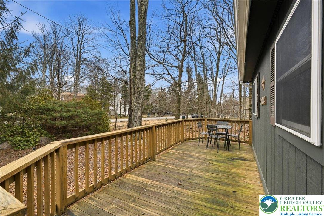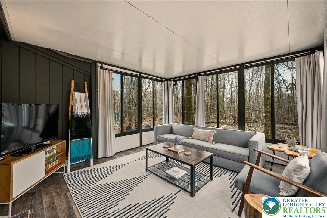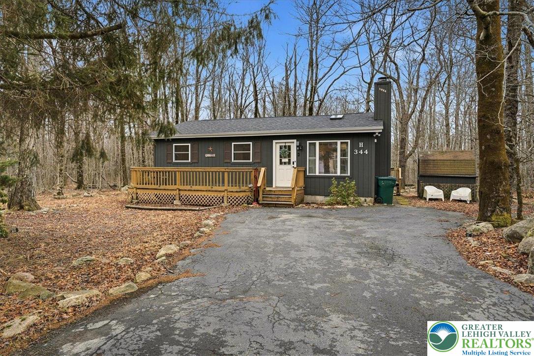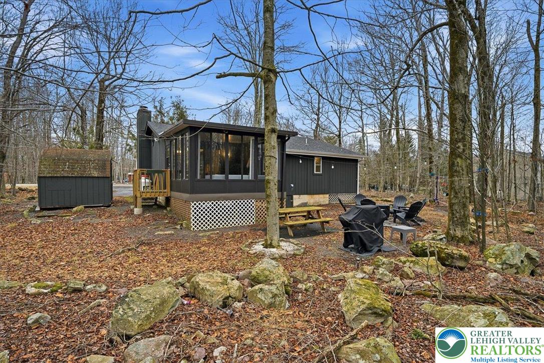 Do Not Wait To See This Fully Turnkey Pocono Retreat Backing Directly To State Land In STR Friendly Pocono Country Place! Set on a rare, ultra-private lot with no rear neighbors, this property delivers the peaceful mountain setting buyers are searching for while still offering strong short term rental potential. Sold fully furnished, this is a true plug-and-play opportunity ready for immediate use or income. Step inside to a bright and inviting layout featuring a stunning vaulted ceiling living space with exposed beams and a cozy fireplace that anchors the home. The open flow into the dining area and kitchen creates an ideal setup for entertaining or hosting guests. Just beyond, a beautiful enclosed porch brings the outdoors in and offers a perfect space to relax year-round. The home offers three comfortable bedrooms including a primary suite with its own bath and walk-in closet, plus an additional full bath and convenient laundry area. Outdoor living shines with an expansive front deck and a private backyard fire pit area surrounded by nature. Located in amenity-filled Pocono Country Place with pools, lakes, clubhouse, and more, and just minutes to Kalahari, Camelback, Mount Airy Casino, and major highways. A rare combination of privacy, condition, and STR upside. Do Not Delay Call Today.