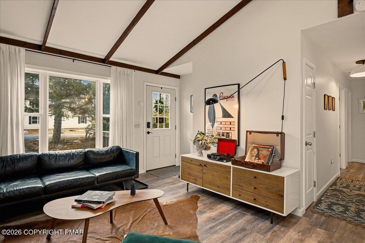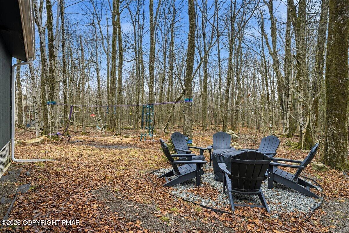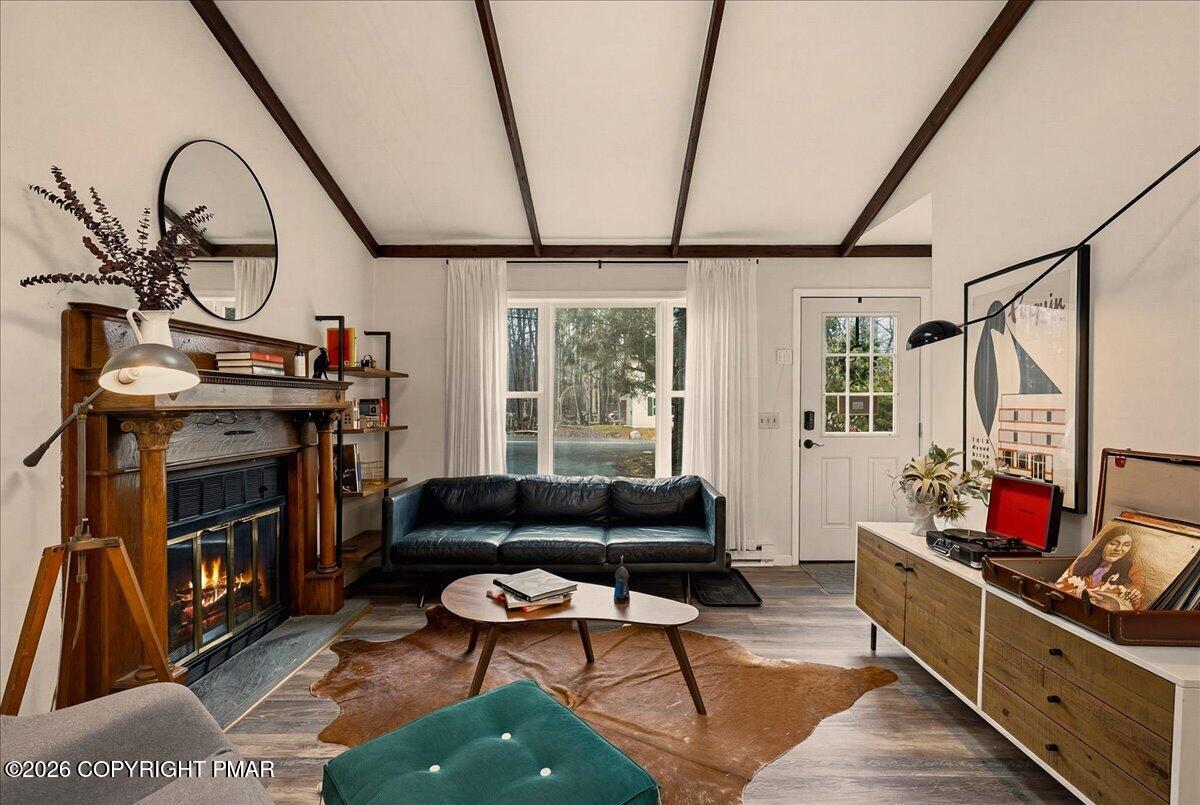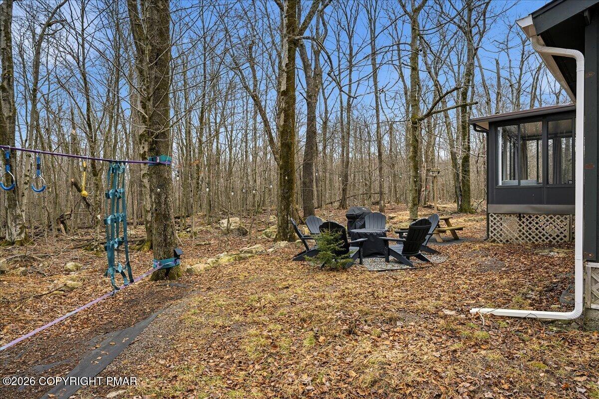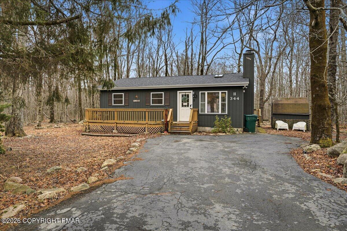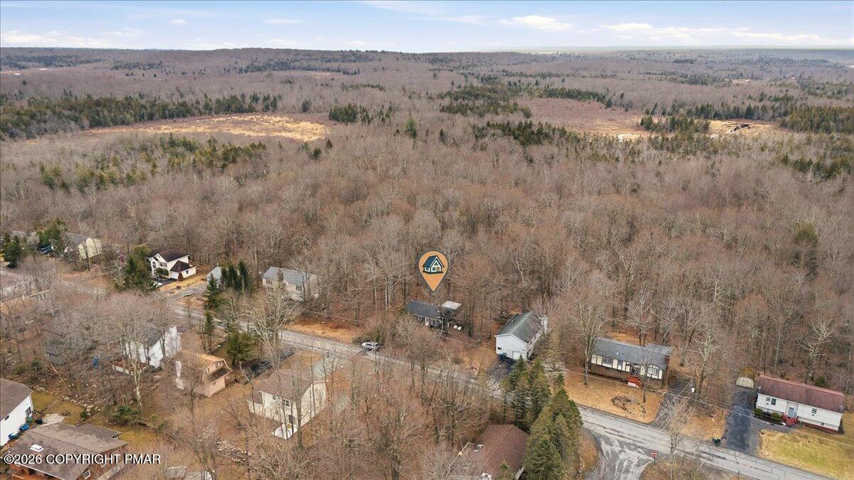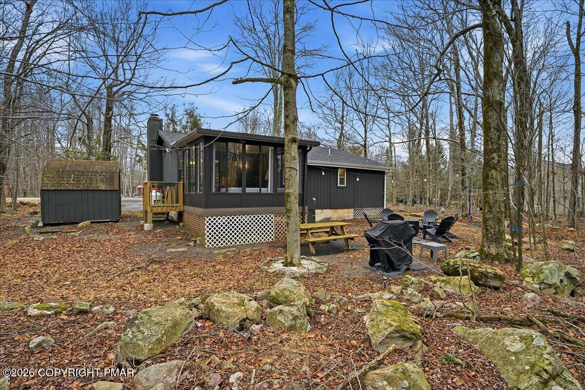 Do Not Wait To See This Fully Turnkey Pocono Retreat Backing Directly To State Land In STR Friendly Pocono Country Place! Set on a rare, ultra-private lot with no rear neighbors, this property delivers the peaceful mountain setting buyers are searching for while still offering strong short term rental potential. Sold fully furnished, this is a true plug-and-play opportunity ready for immediate use or income. Step inside to a bright and inviting layout featuring a stunning vaulted ceiling living space with exposed beams and a cozy fireplace that anchors the home. The open flow into the dining area and kitchen creates an ideal setup for entertaining or hosting guests. Just beyond, a beautiful enclosed porch brings the outdoors in and offers a perfect space to relax year-round. The home offers three comfortable bedrooms including a primary suite with its own bath and walk-in closet, plus an additional full bath and convenient laundry area. Outdoor living shines with an expansive front deck and a private backyard fire pit area surrounded by nature. Located in amenity-filled Pocono Country Place with pools, lakes, clubhouse, and more, and just minutes to Kalahari, Camelback, Mount Airy Casino, and major highways. A rare combination of privacy, condition, and STR upside. Do Not Delay Call Today.