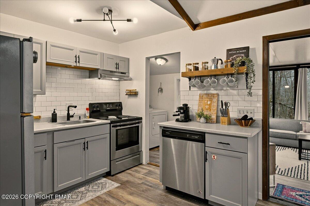 Appliances Electric Range, Refrigerator, Water Heater, Dishwasher, Stainless Steel Appliance(s), Washer, Dryer