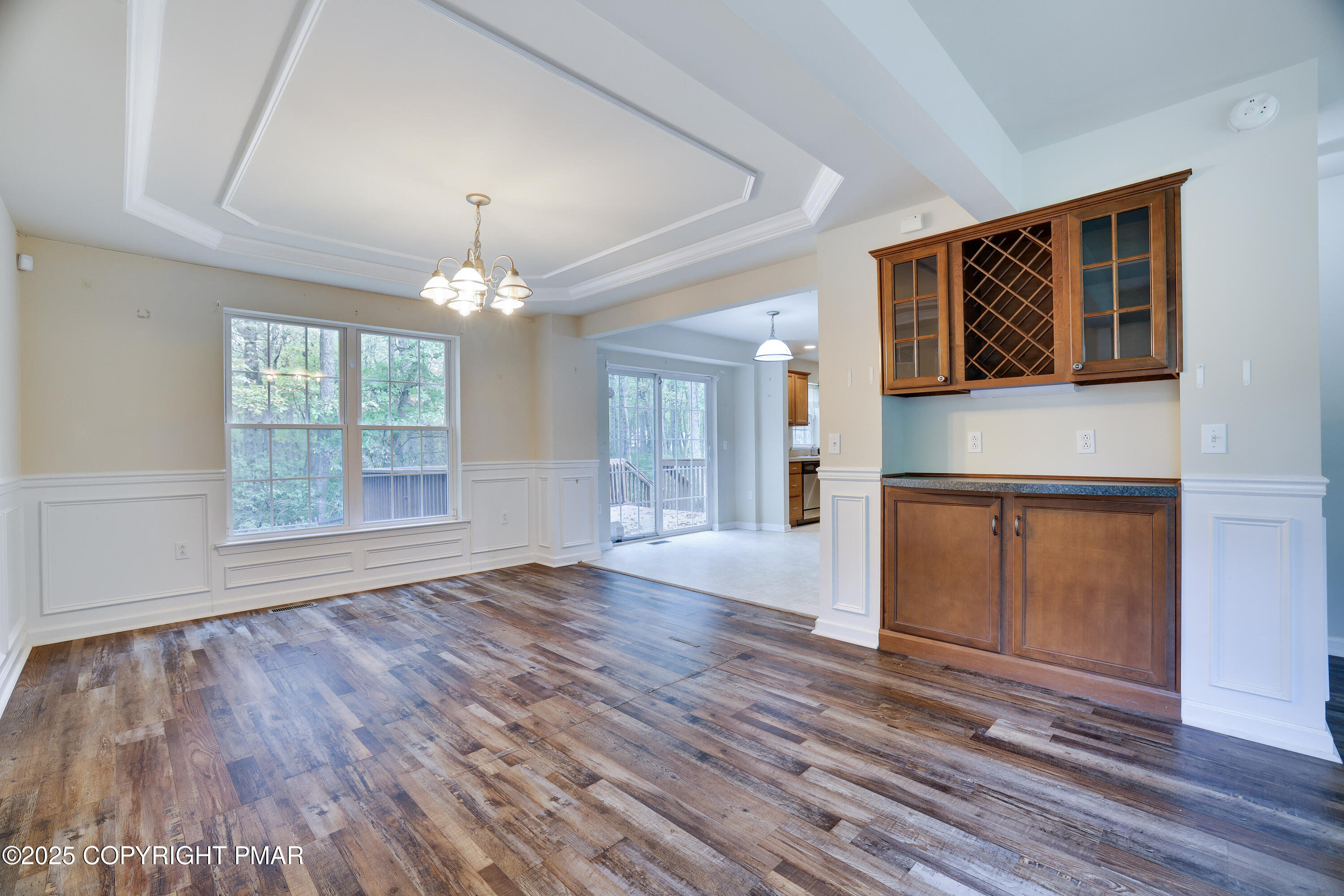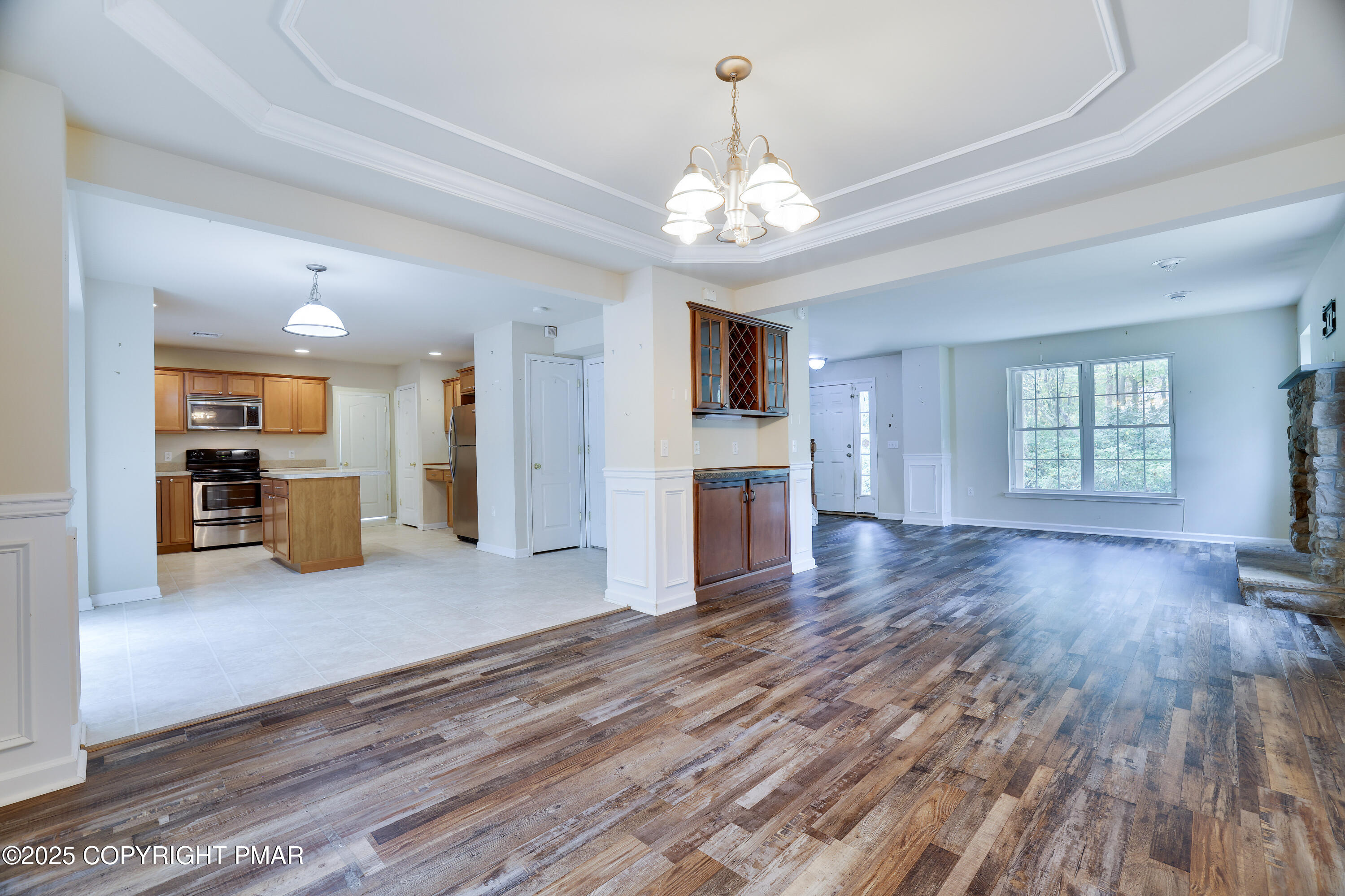Inside, the open layout is bright and welcoming. A stone-faced wood-burning fireplace anchors the living room and flows to an elegant dining area with tray ceiling, crisp wainscoting, and a built-in wine hutch/serving bar. The spacious kitchen offers a center island, stainless appliances, ample cabinetry, a breakfast nook, and sliders to the deck for effortless indoor-outdoor living. A handy main-level laundry, mud entry from the garage, and a neatly placed half bath round out the first floor.