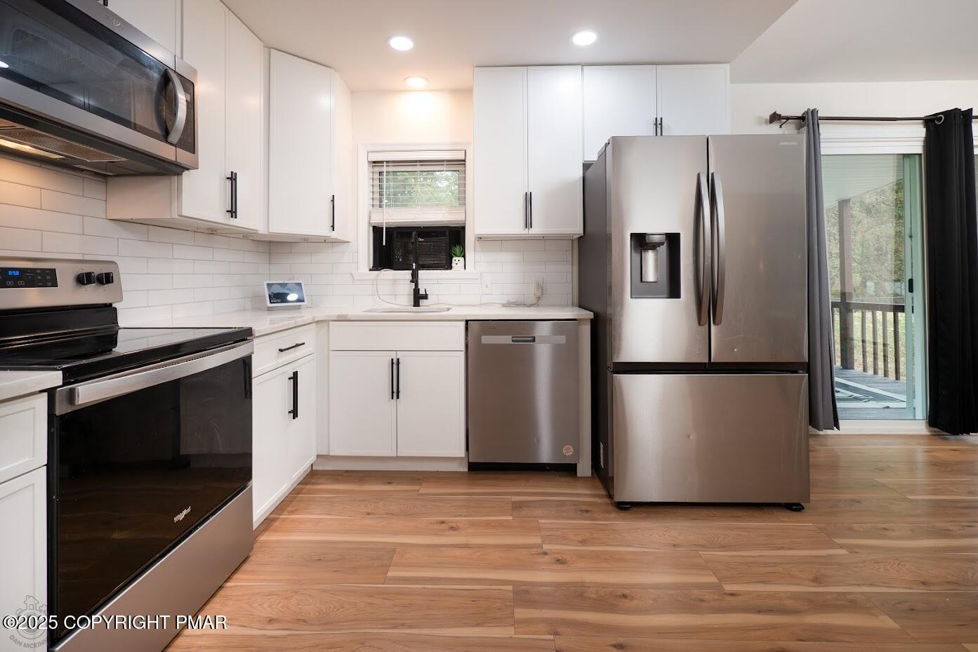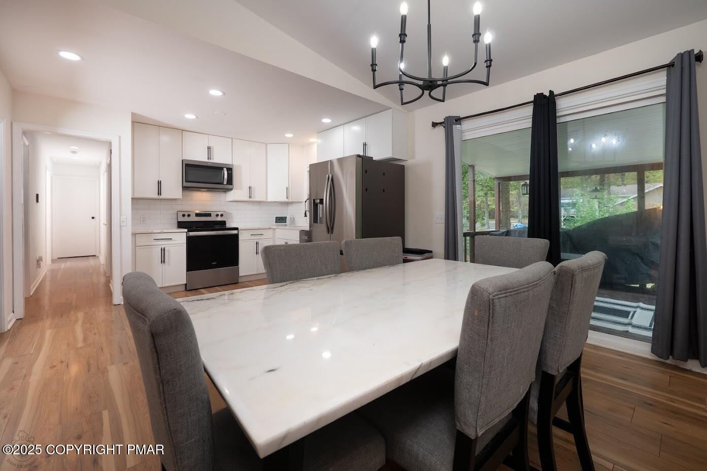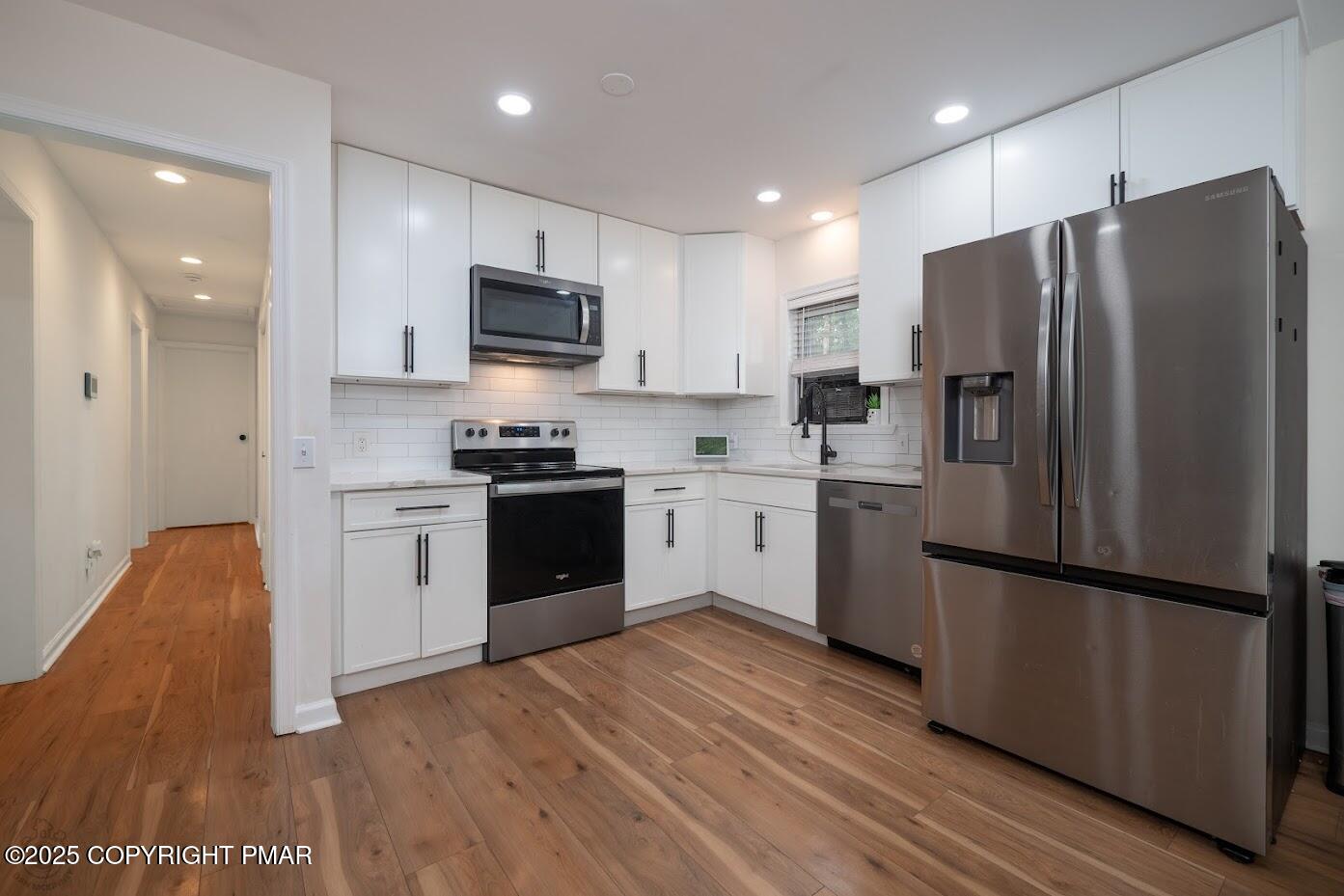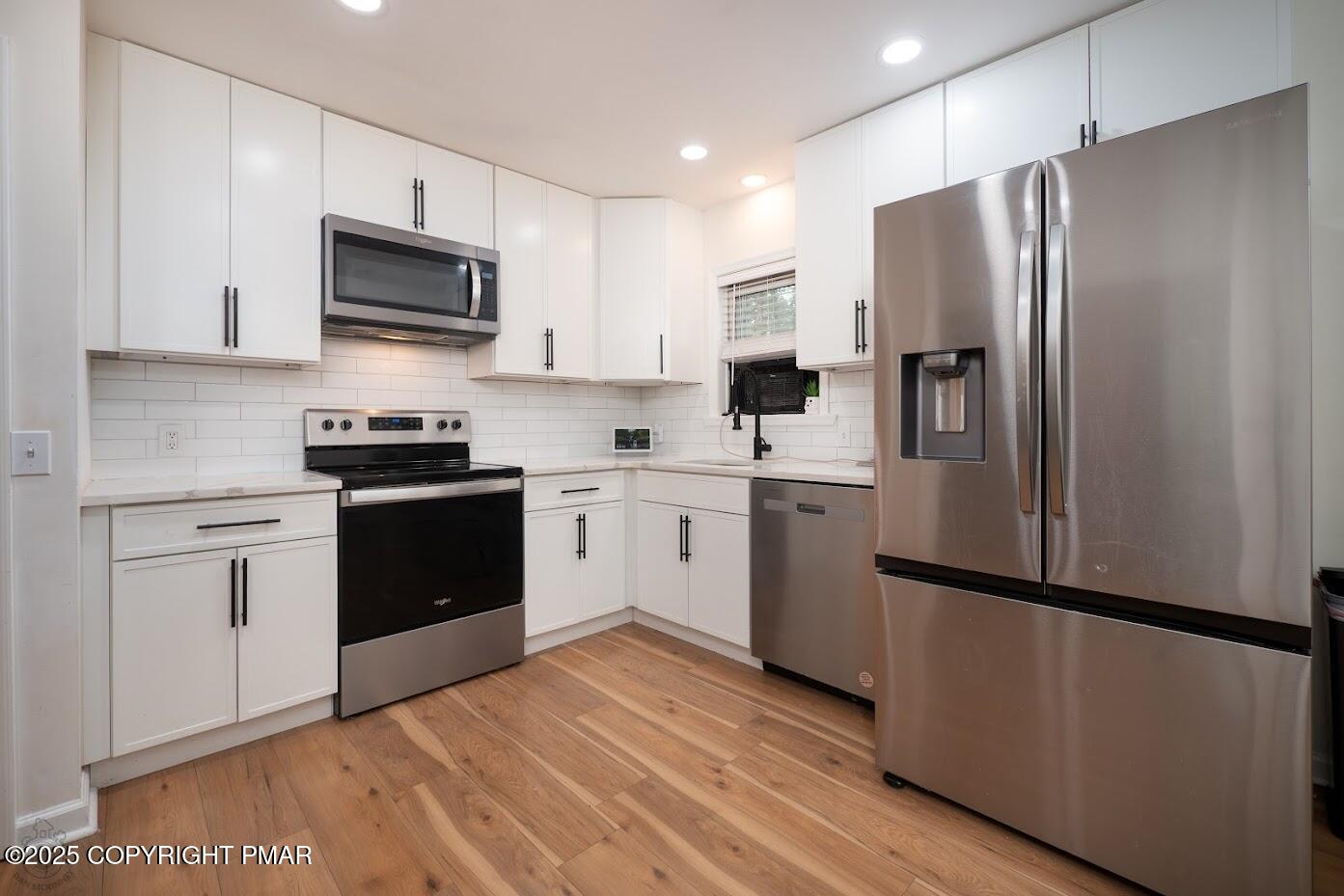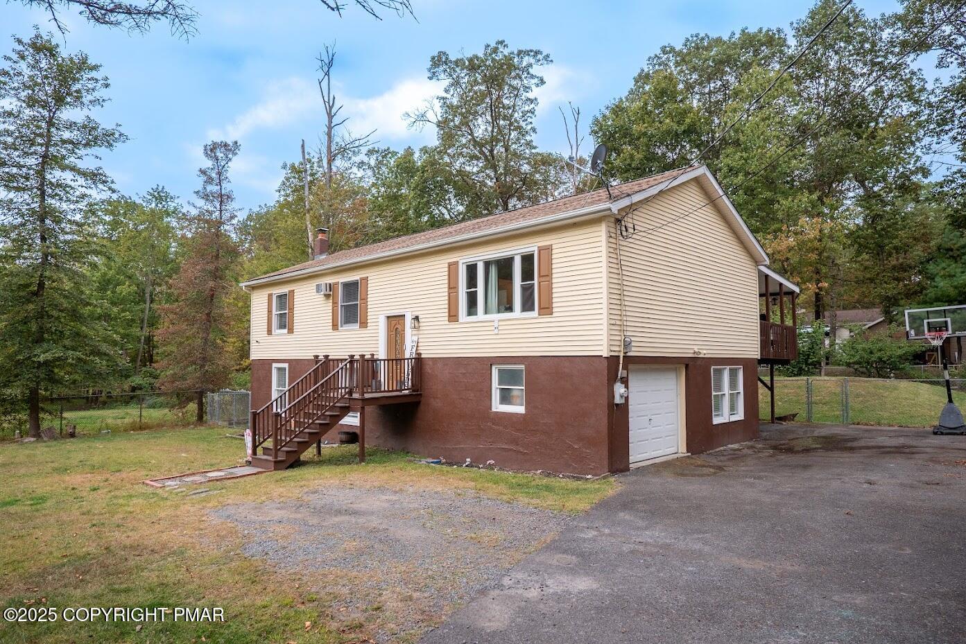 This beautifully updated 4-bedroom, 3-full-bath home is truly move-in ready. The bright white kitchen is a showstopper, featuring quartz countertops, soft-close upper and lower cabinetry, SS appliances, and an effortless flow into the dining area. From here, step through sliding doors to a covered deck--perfect for morning coffee, outdoor dining, or simply enjoying the fresh air. Luxury vinyl plank flooring runs throughout the home, adding both style and durability. The lower level offers a private retreat with its own bedroom and full bathroom, ideal for guests, in-laws, or a quiet home office. With its walk-out design, this level also provides added privacy and flexible living space. Each bedroom features recessed lighting and has pre-wired, capped locations for ceiling fans, adding both convenience and comfort. Outside, the property shines with a large, flat lot and a fully fenced backyard--great for pets, play, or entertaining. The long driveway expands generously in front of the garage, offering plenty of parking for multiple vehicles. Conveniently located just 10 minutes from downtown East Stroudsburg, this home balances modern finishes, comfort, and accessibility. Don't miss your chance to make this gem yours--schedule a showing today!