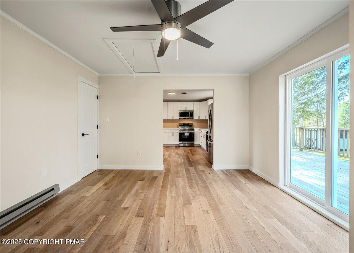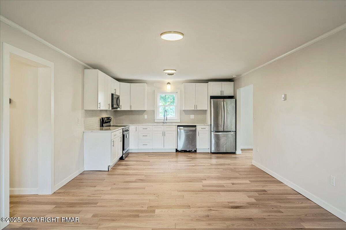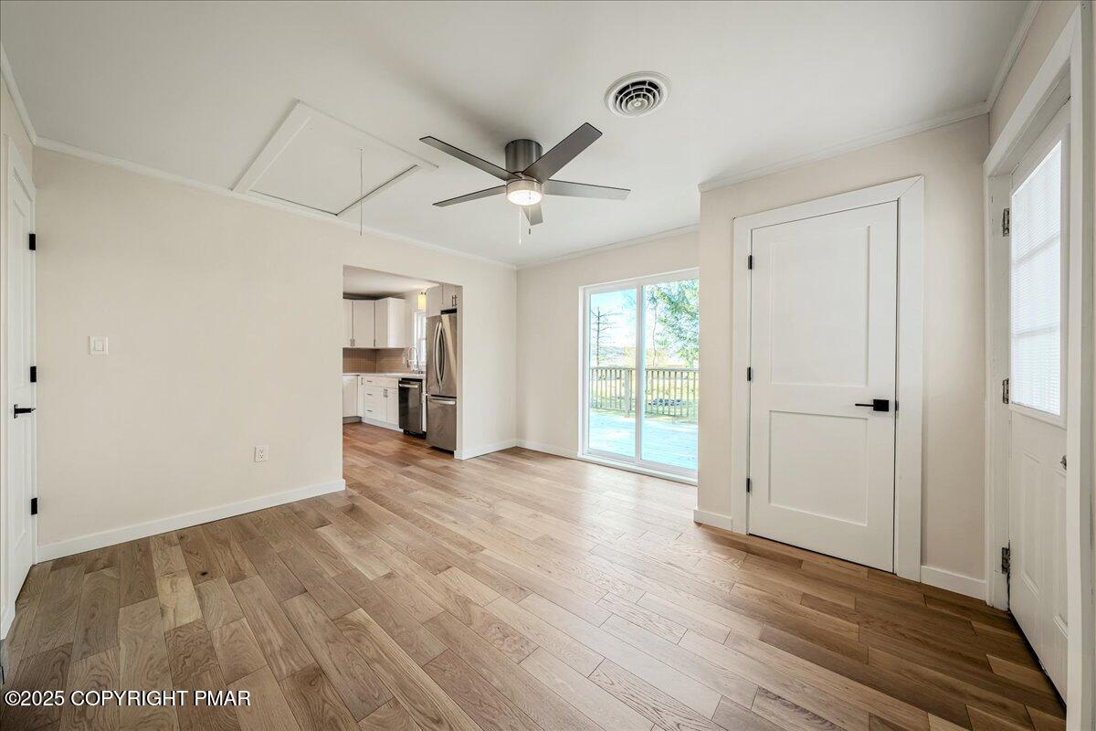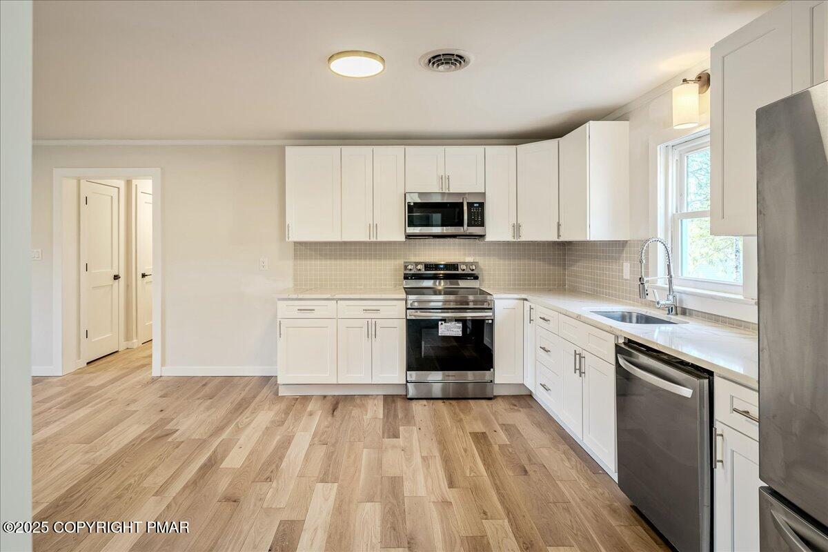 Inside, stunning hardwood floors flow through spacious living, dining, and kitchen areas, creating a seamless sense of space. The all-new kitchen shines with white shaker cabinetry, subway tile backsplash, generous counter space, and stainless steel appliances, perfect for everyday living or entertaining with ease. Sliding doors open to a private deck and backyard made for cookouts, games, and starry nights around the fire pit.